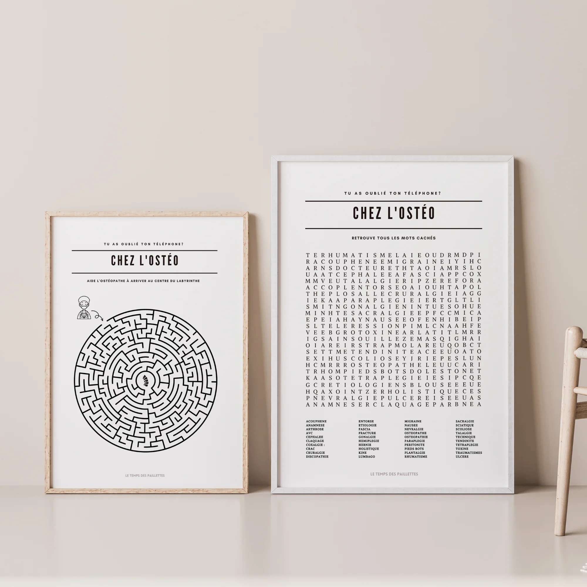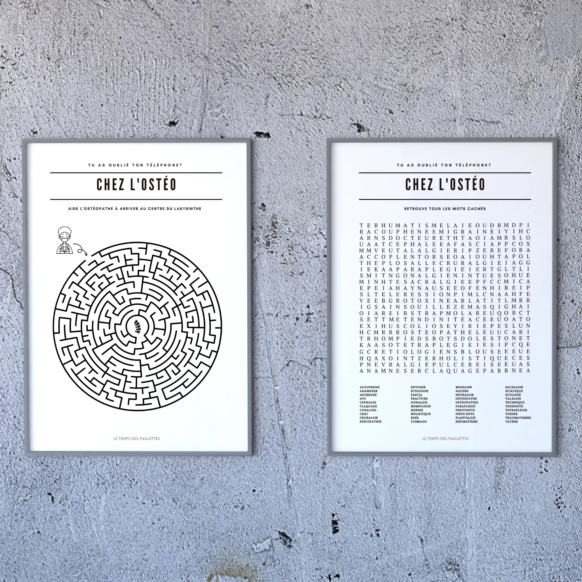 Lot de 2 posters pour salle d’attente de cabinet médical d’ostéopathie contenant: 1 mots mêlés et 1 labyrinthe.