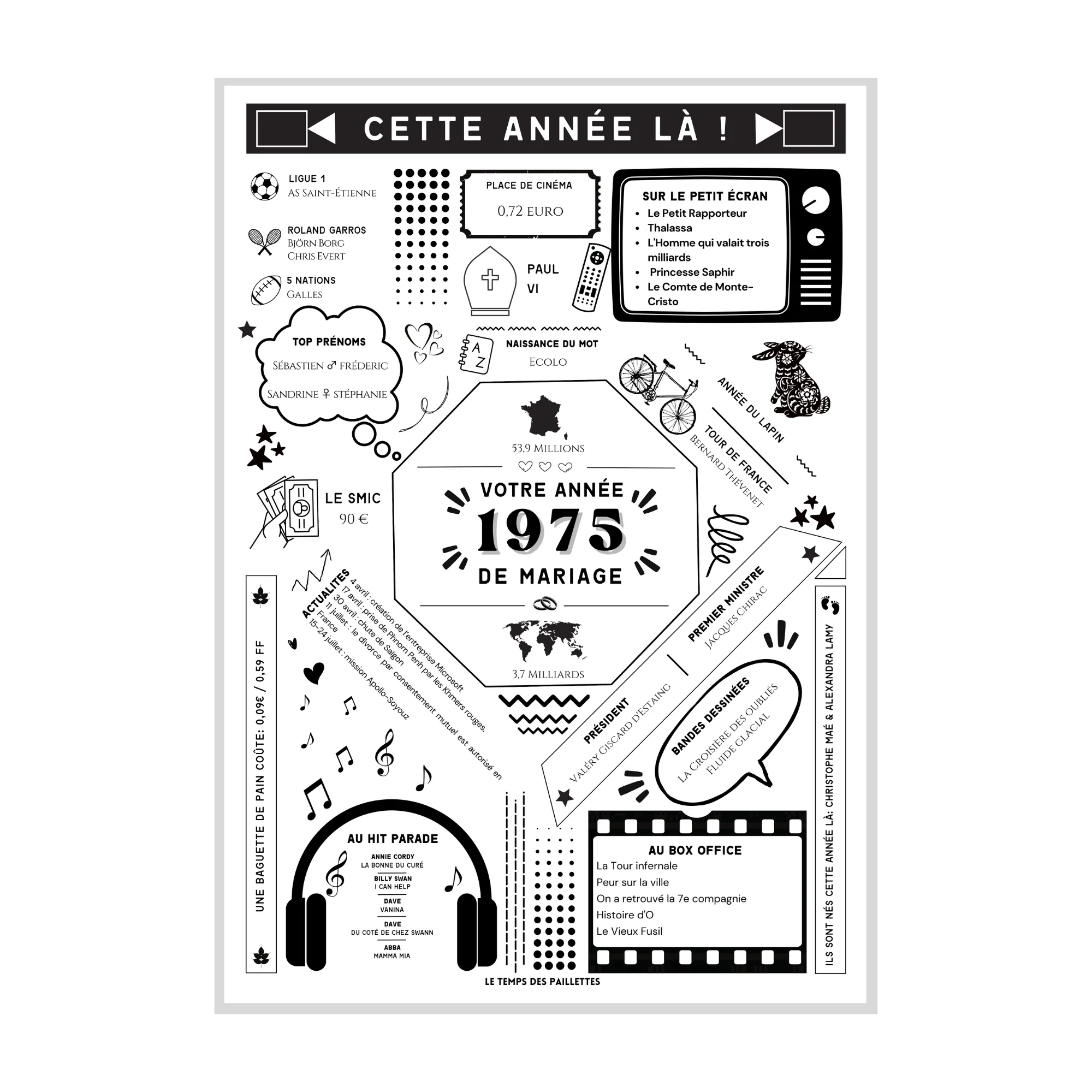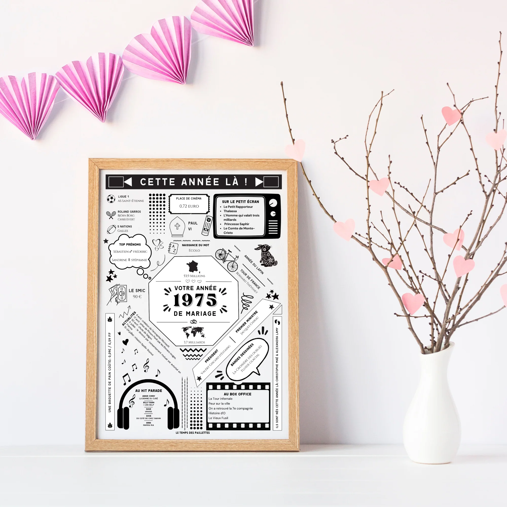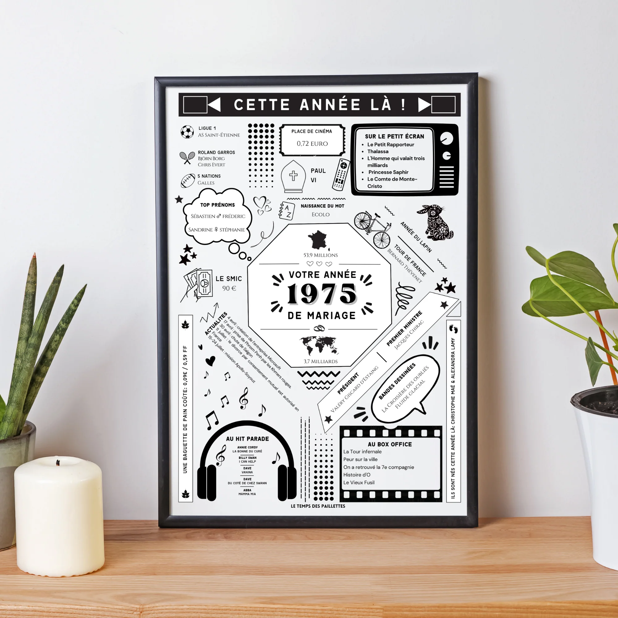 Voici la collection « Affiche votre année de mariage ». Offrez à un couple de mariés une affiche unique et personnalisée pour commémorer leur journée spéciale ! Notre affiche de noces de mariage est disponible pour chaque année de mariage et est personnalisée avec des faits marquants de cette année-là . Par exemple: vous trouverez le coût d’une baguette, d’une place de cinéma ou le SMIC, les musiques au hit-parade, les films, les palmarès sportifs, les personnes célèbres nées cette année-là, et plus encore!