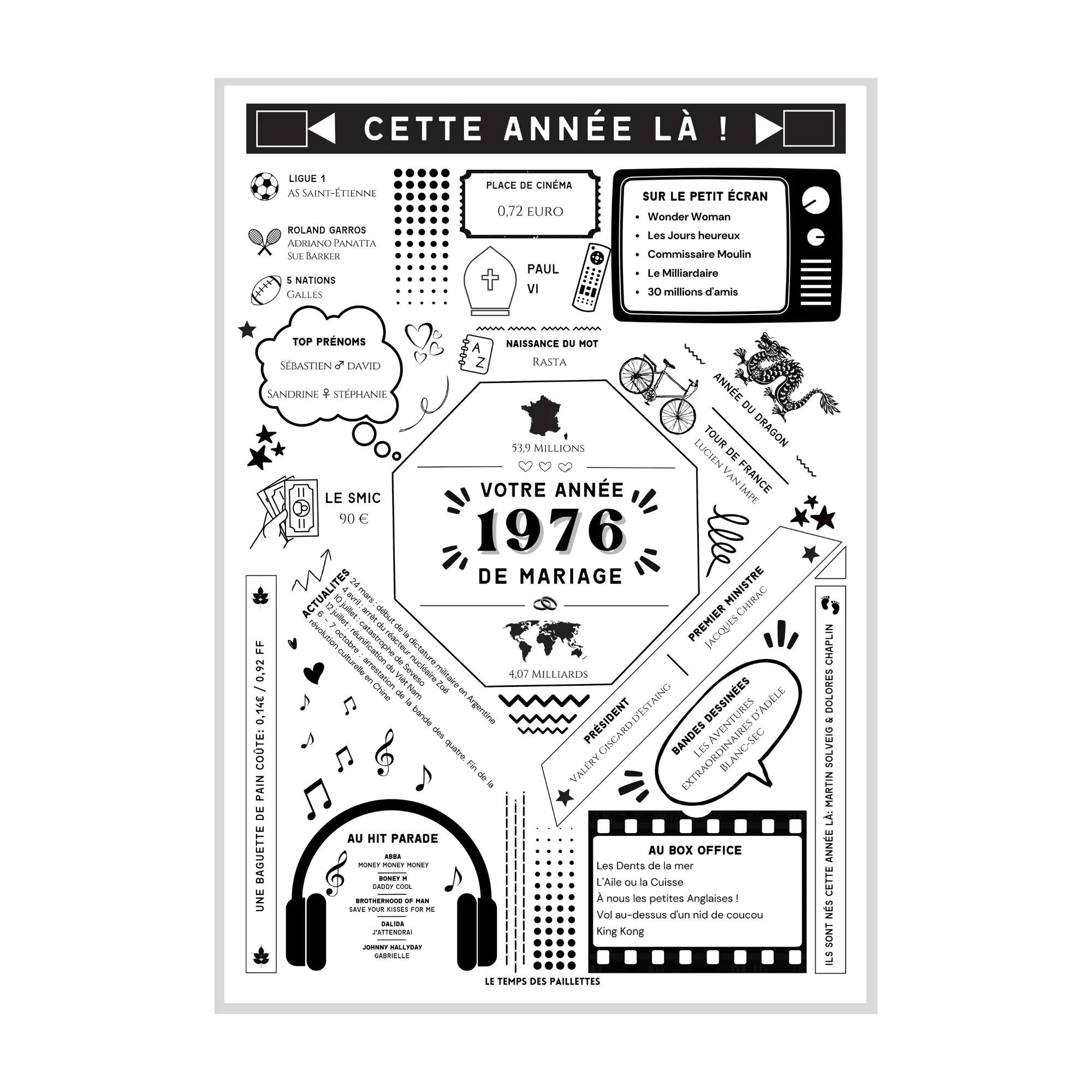 Voici la collection « Affiche votre année de mariage ». Offrez à un couple de mariés une affiche unique et personnalisée pour commémorer leur journée spéciale ! Notre affiche de noces de mariage est disponible pour chaque année de mariage et est personnalisée avec des faits marquants de cette année-là . Par exemple: vous trouverez le coût d’une baguette, d’une place de cinéma ou le SMIC, les musiques au hit-parade, les films, les palmarès sportifs, les personnes célèbres nées cette année-là, et plus encore!