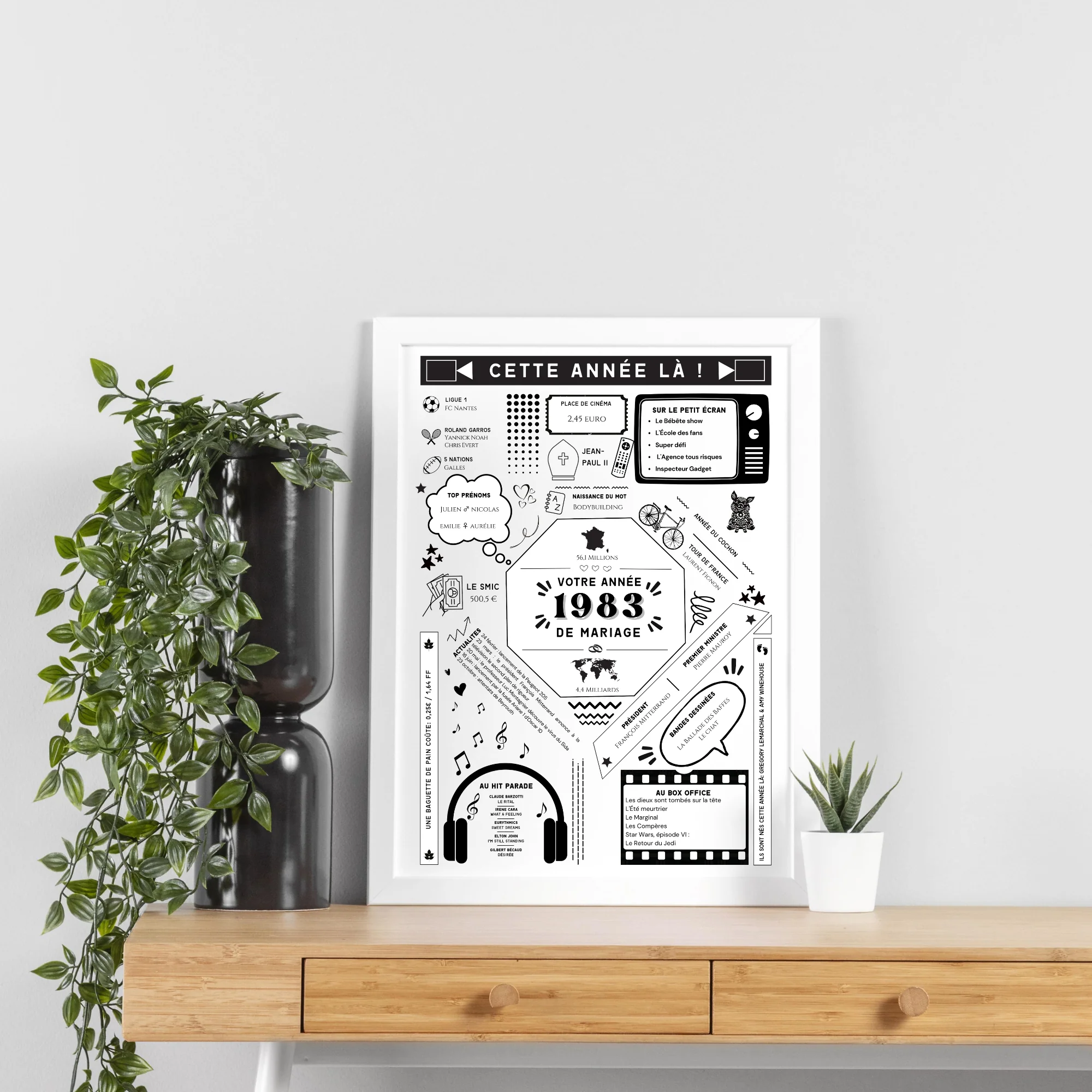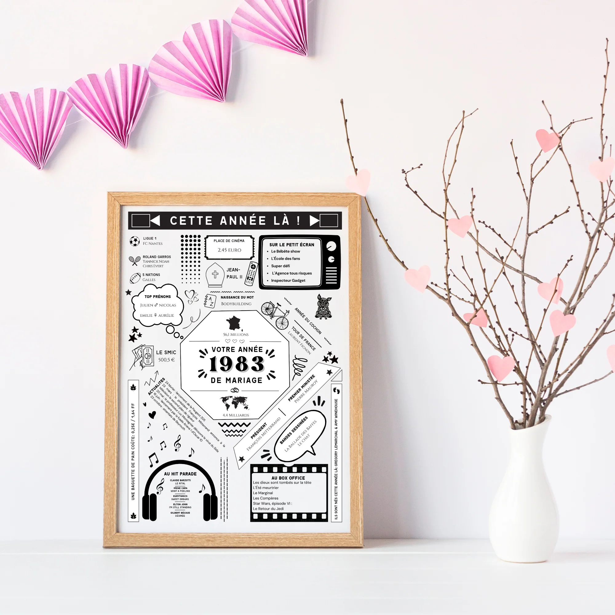 Voici la collection « Affiche votre année de mariage ». Offrez à un couple de mariés une affiche unique et personnalisée pour commémorer leur journée spéciale ! Notre affiche de noces de mariage est disponible pour chaque année de mariage et est personnalisée avec des faits marquants de cette année-là . Par exemple: vous trouverez le coût d’une baguette, d’une place de cinéma ou le SMIC, les musiques au hit-parade, les films, les palmarès sportifs, les personnes célèbres nées cette année-là, et plus encore!