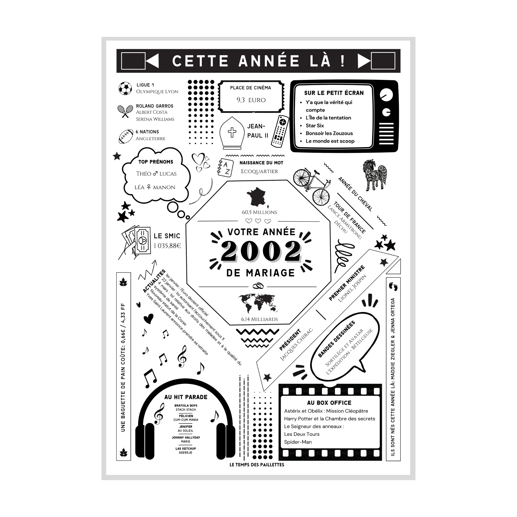 Voici la collection « Affiche votre année de mariage ». Offrez à un couple de mariés une affiche unique et personnalisée pour commémorer leur journée spéciale ! Notre affiche de noces de mariage est disponible pour chaque année de mariage et est personnalisée avec des faits marquants de cette année-là . Par exemple: vous trouverez le coût d’une baguette, d’une place de cinéma ou le SMIC, les musiques au hit-parade, les films, les palmarès sportifs, les personnes célèbres nées cette année-là, et plus encore!