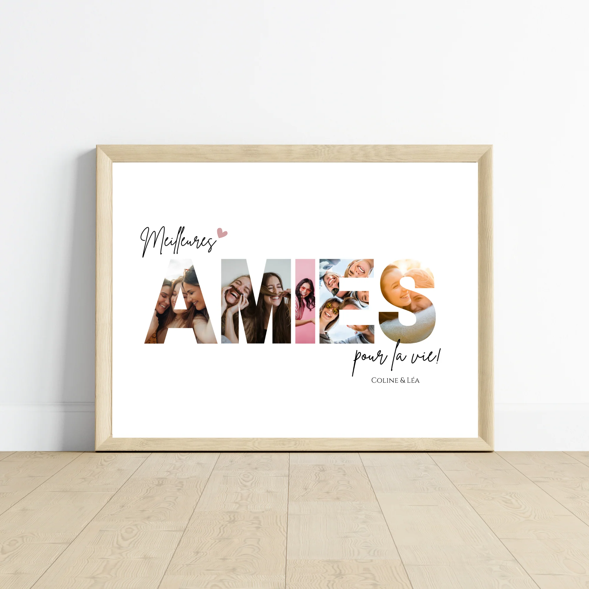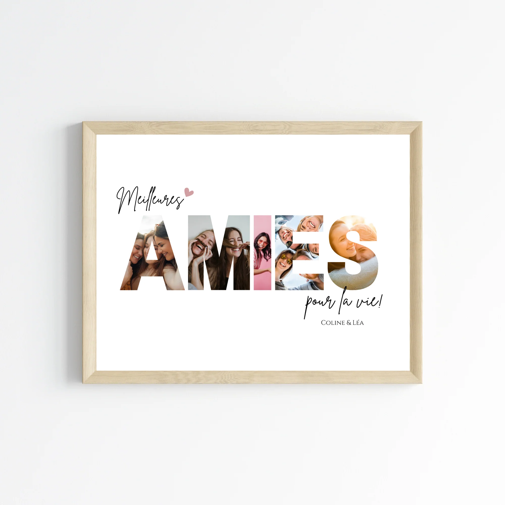 Offrez une affiche unique avec le mot « AMIES », où chaque lettre intègre une photo spéciale. Un cadeau parfait pour célébrer votre amitié ! 🎁