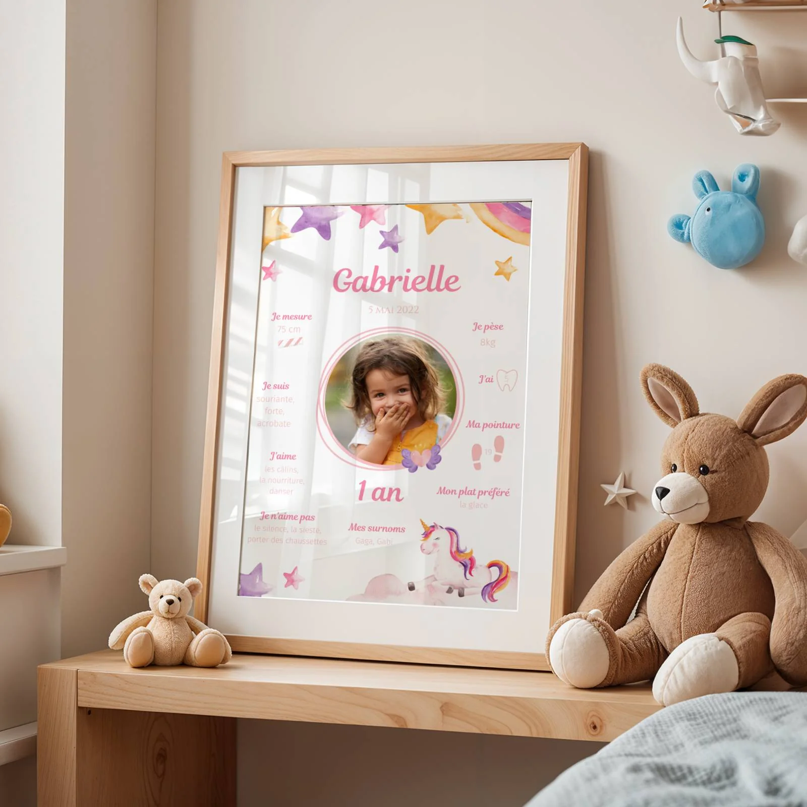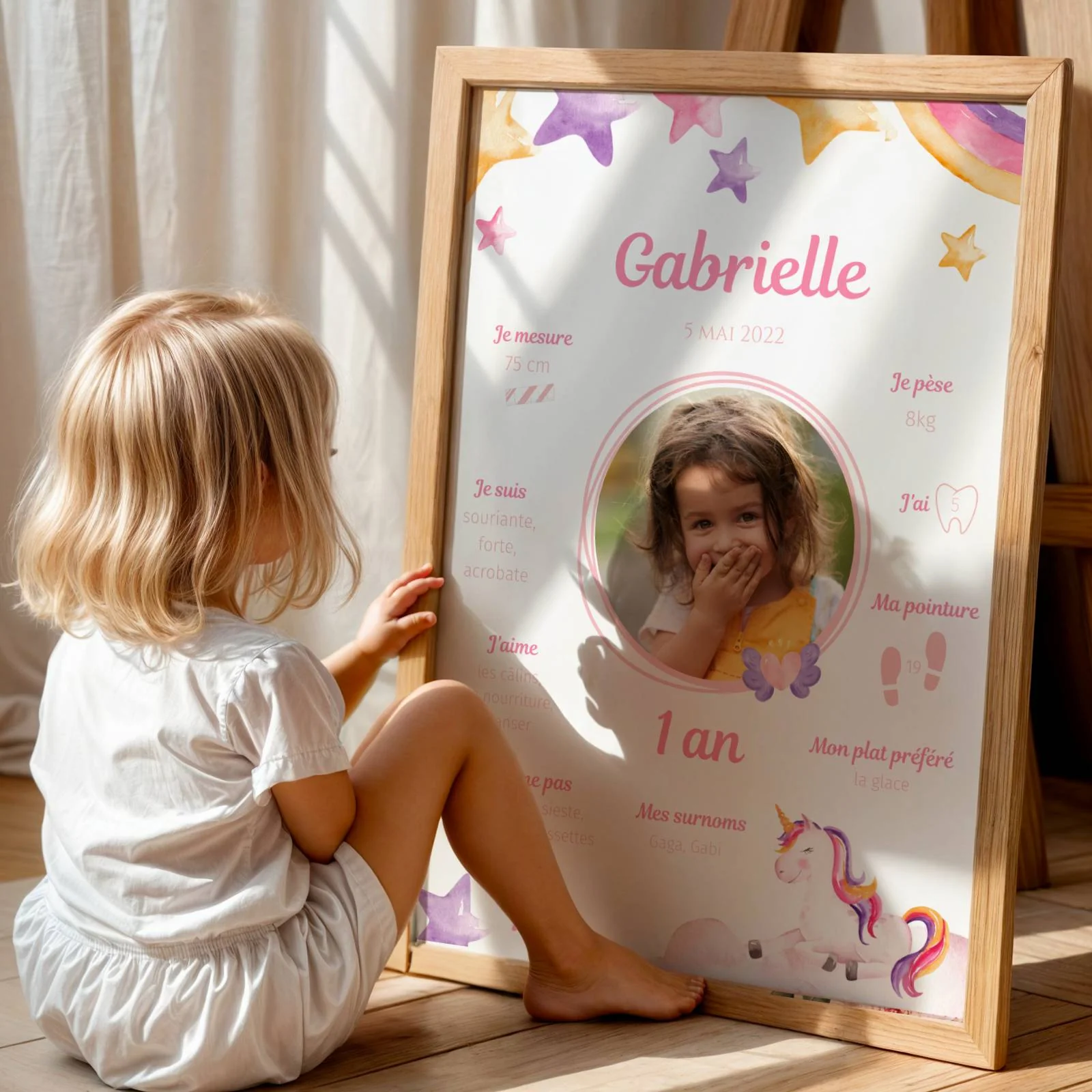 Offrez un cadeau d’anniversaire personnalisé avec cette affiche anniversaire thème Licorne, parfaite pour célébrer un 1er anniversaire, un baptême, ou tout simplement pour décorer la table d’anniversaire et garder un souvenir inoubliable.