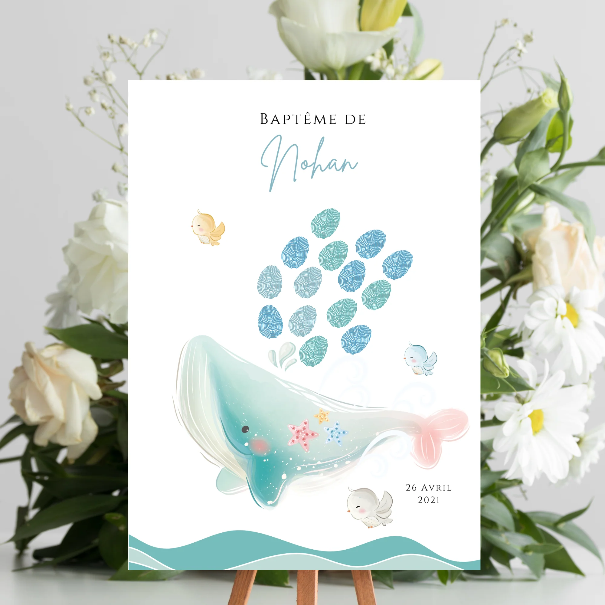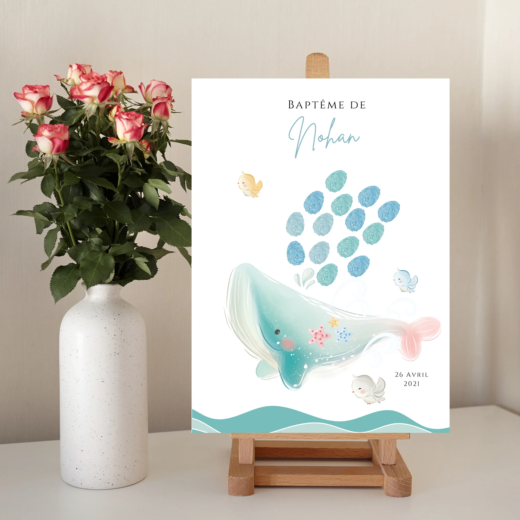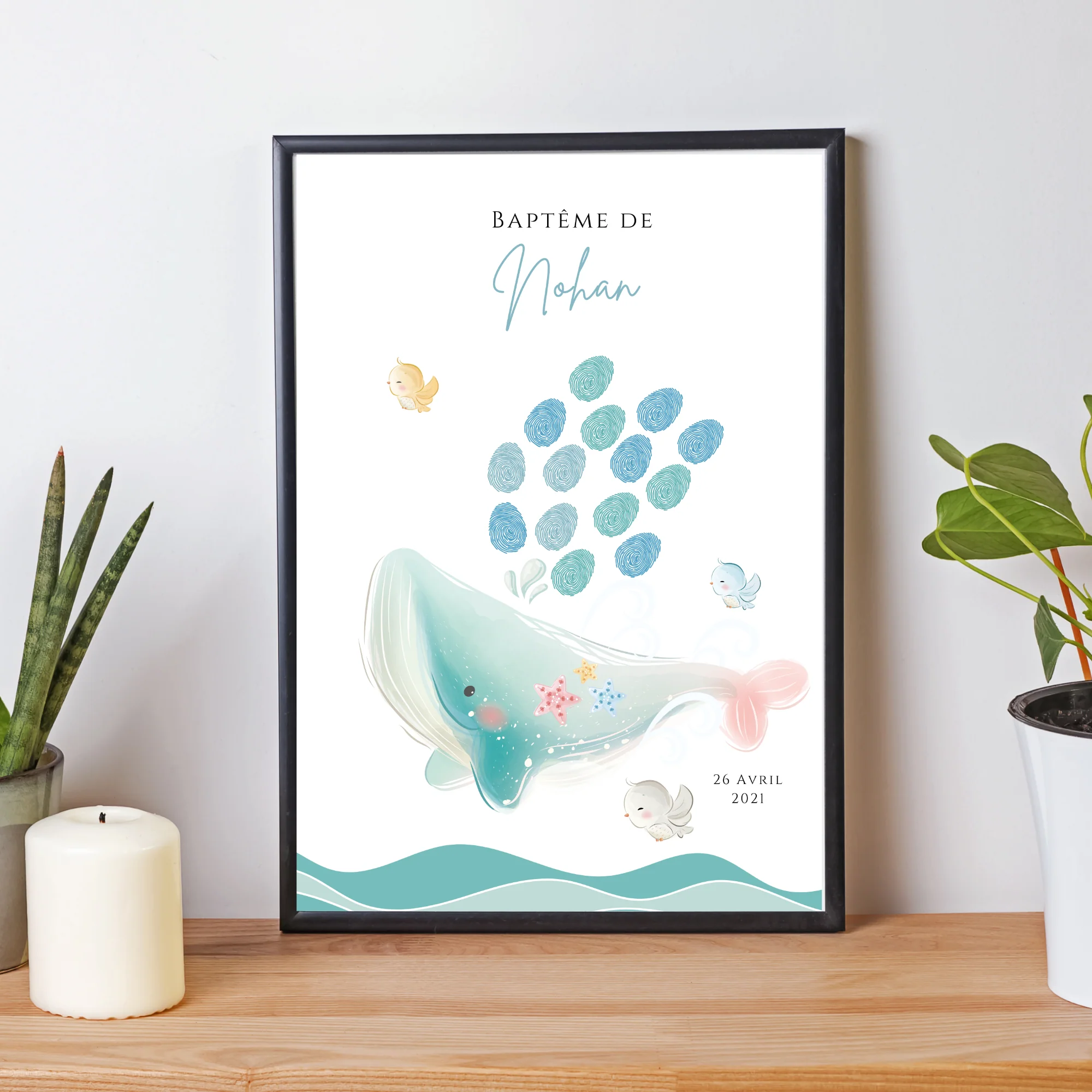 Affiche arbre à empreintes baleine – Déco anniversaire baptême personnalisée garçon bleu par le Temps des Paillettes