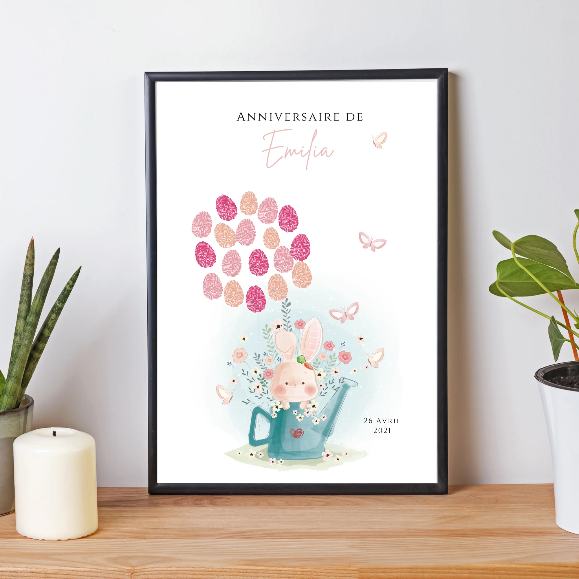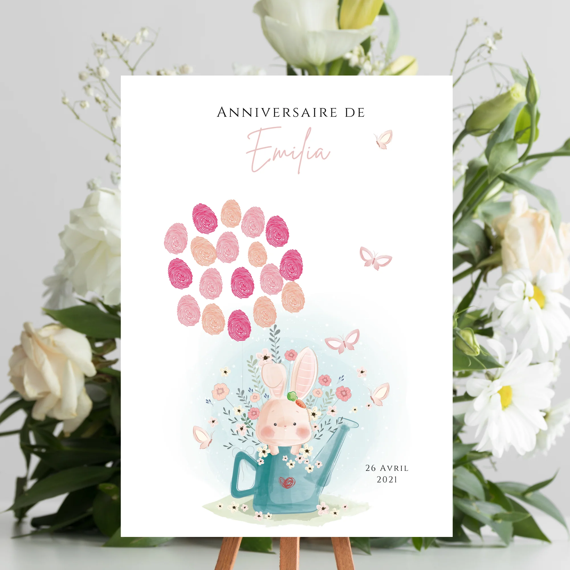 ❤️ Joli modèle d’arbre à empreinte pour le baptême ou anniversaire de votre enfant. L’affiche est décorée avec un lapin dans un arrosoir décoré de fleurs.