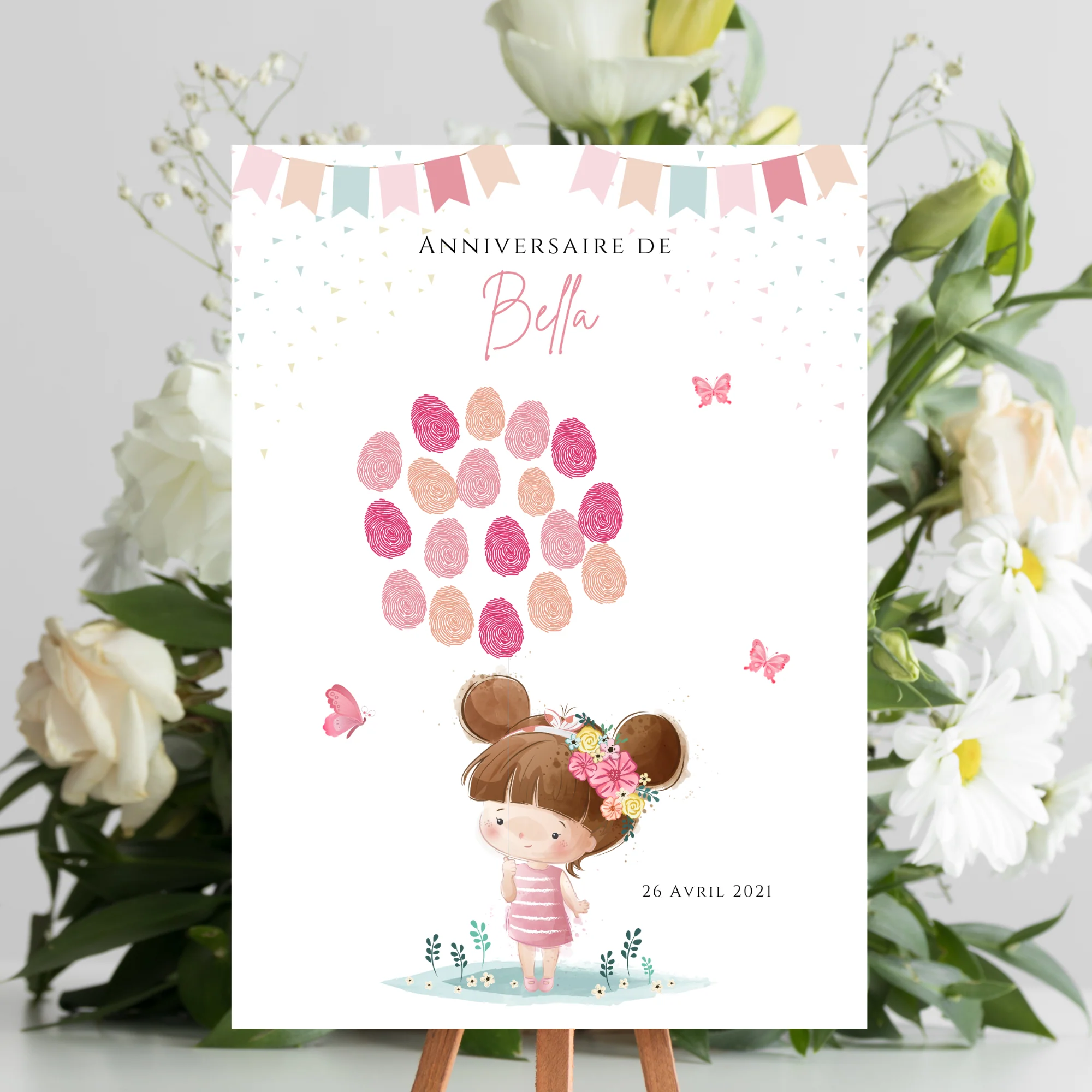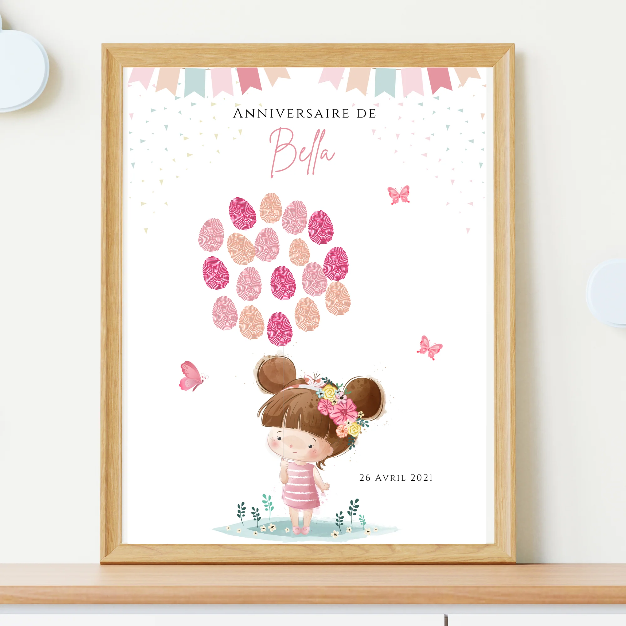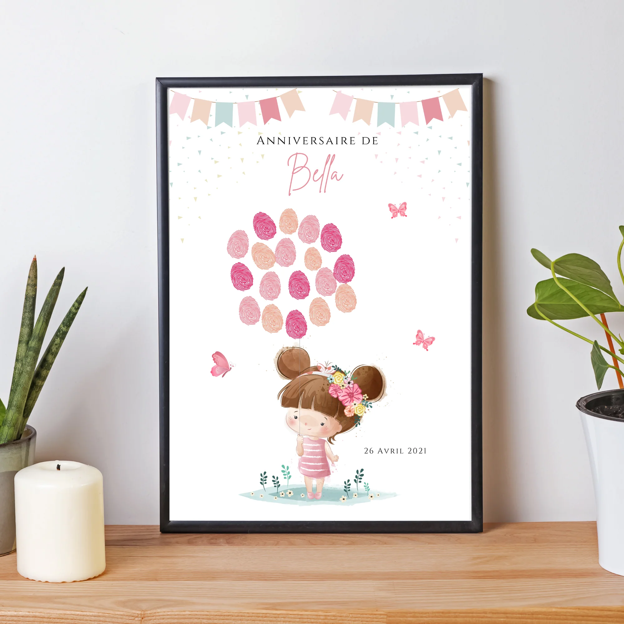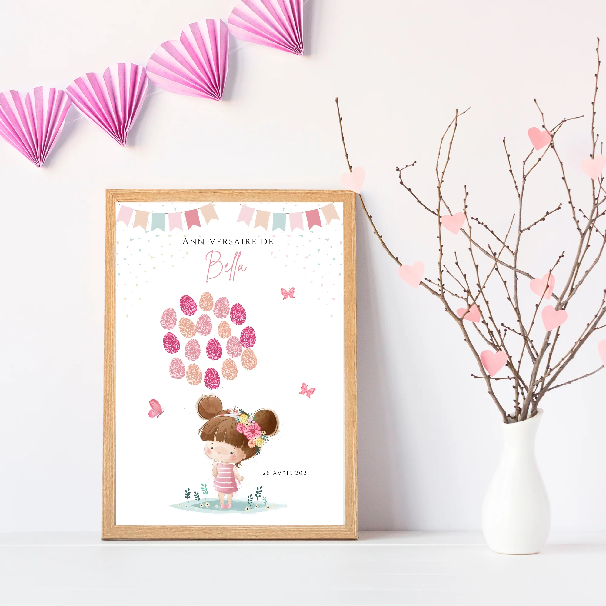 ❤️ Joli modèle d’arbre à empreinte pour le baptême ou anniversaire de votre enfant. L’affiche est décorée avec une petite fille auquel il manque les ballons (à compléter avec les empreintes).