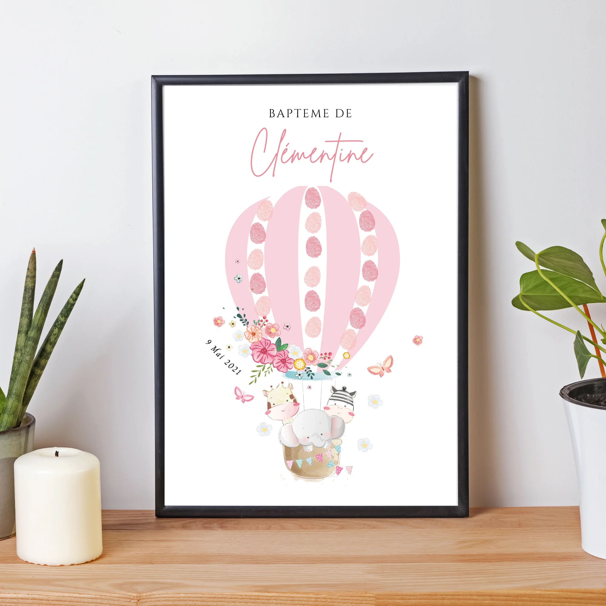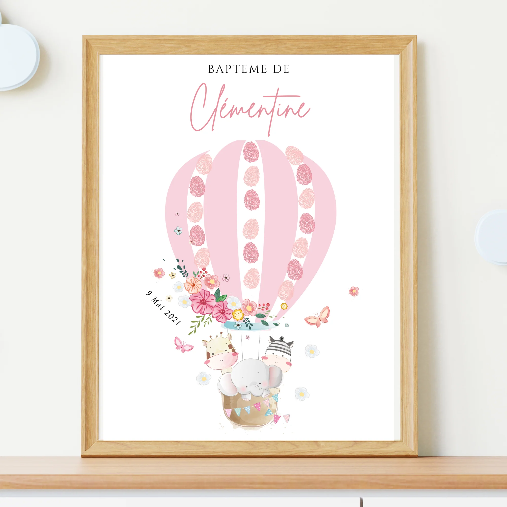 Affiche arbre à empreintes montgolfière et animaux – Déco baptême anniversaire personnalisée par le Temps des Paillettes