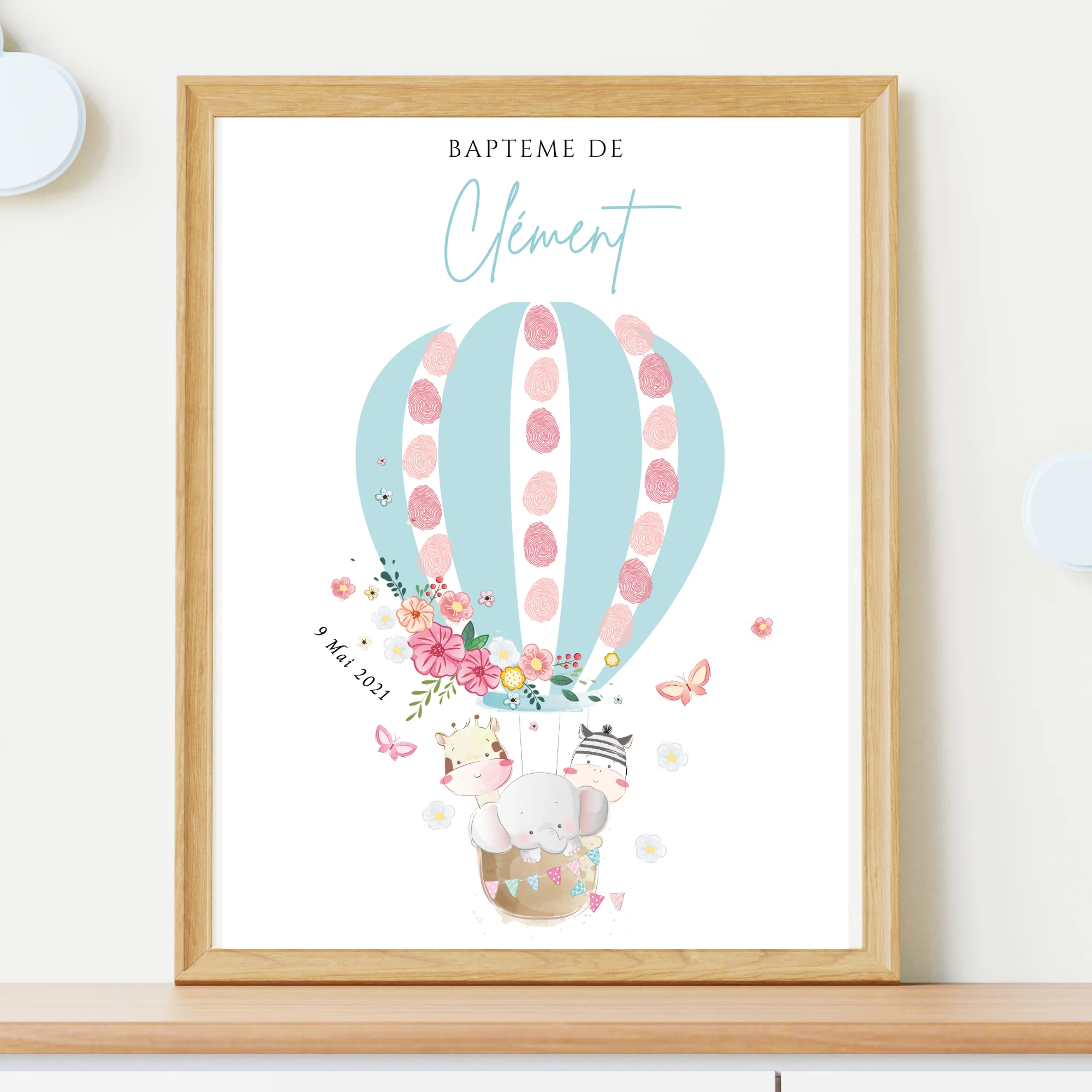 Affiche arbre à empreintes montgolfière et animaux – Déco baptême anniversaire personnalisée par le Temps des Paillettes