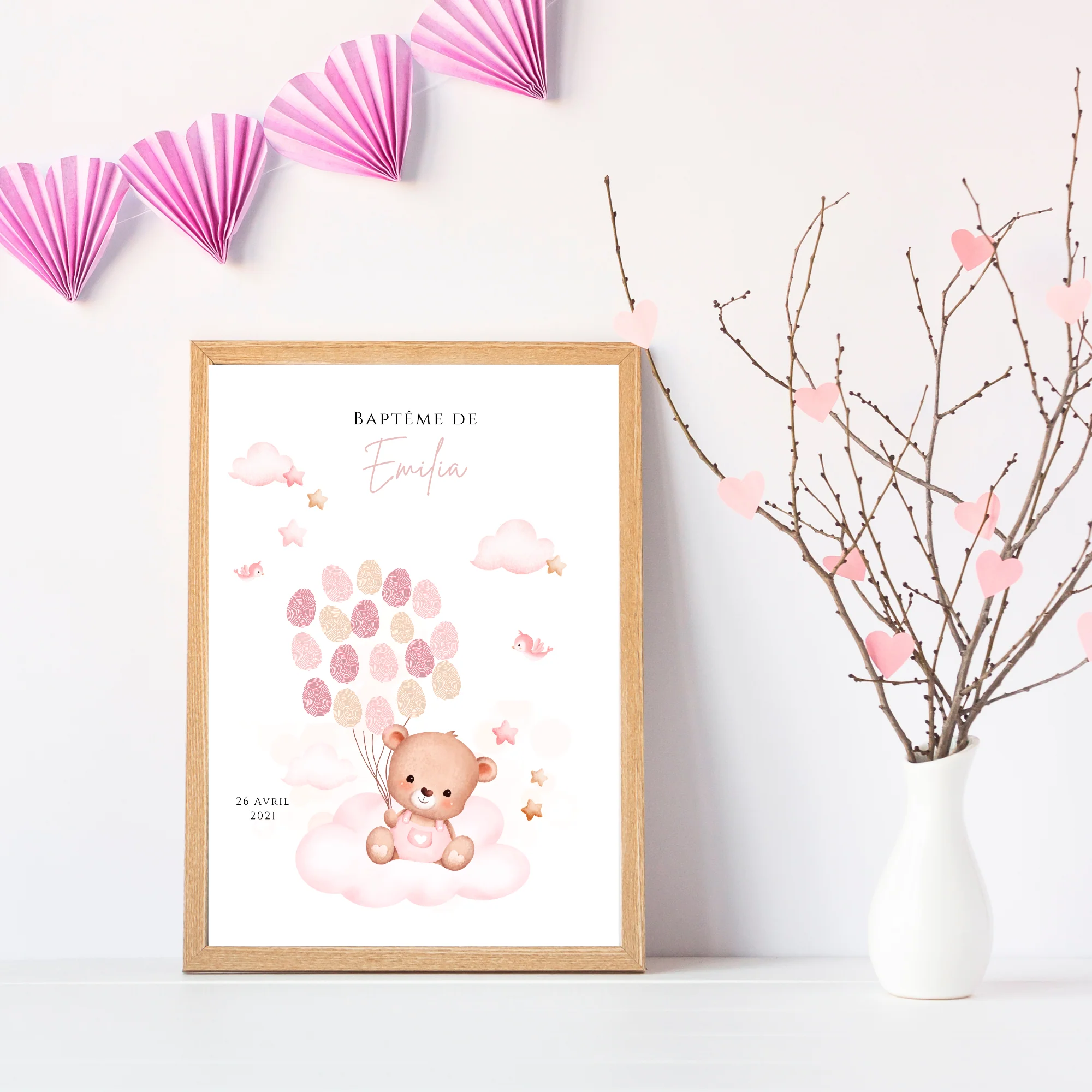 Affiche arbre à empreintes ours rose et ballon – Déco anniversaire baptême personnalisée fille rose par le Temps des Paillettes
