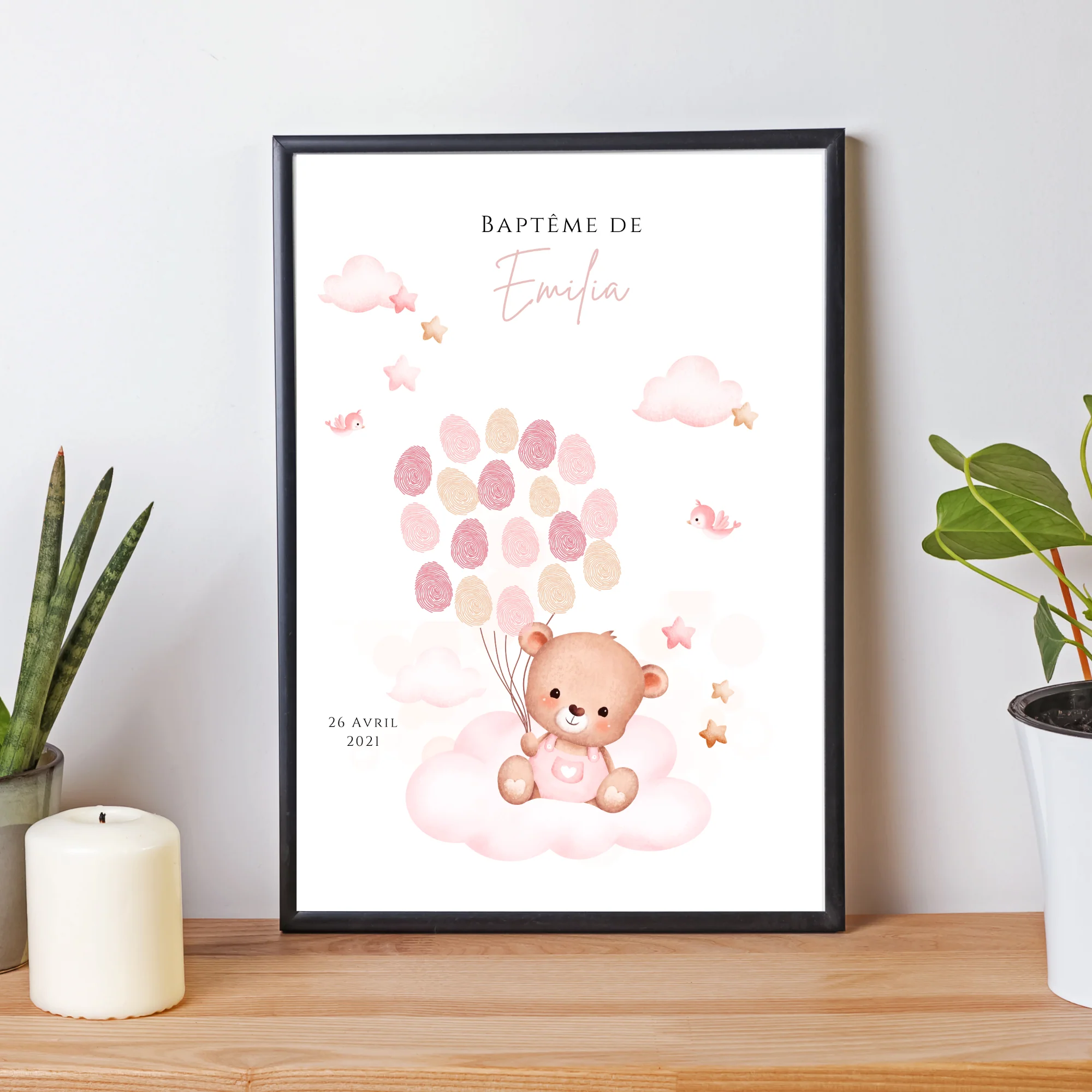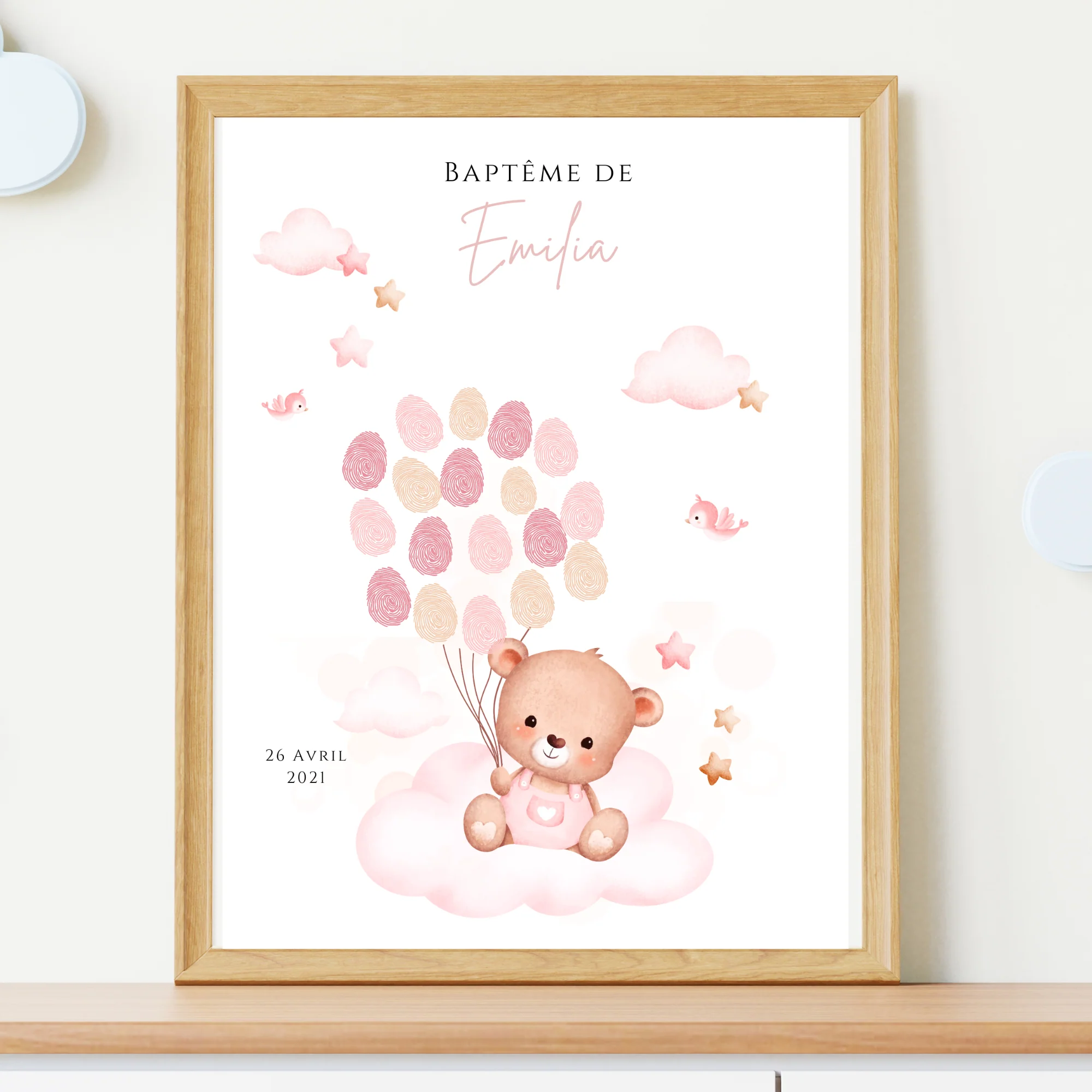 ❤️ Joli modèle d’arbre à empreinte pour le baptême ou anniversaire de votre enfant. L’affiche est décorée avec un ours rose reposant sur un nuage.