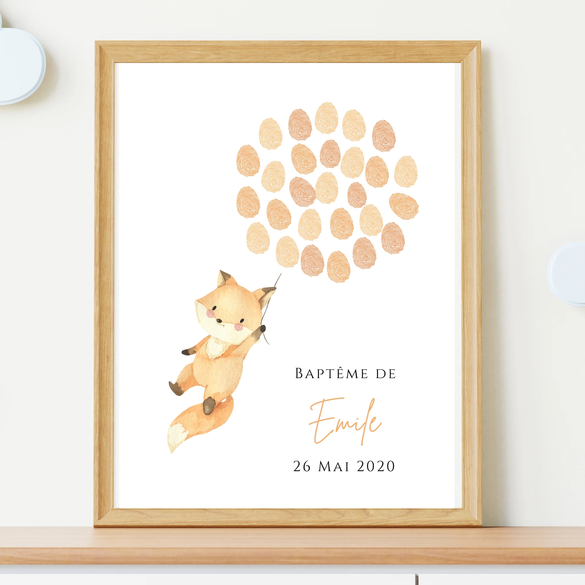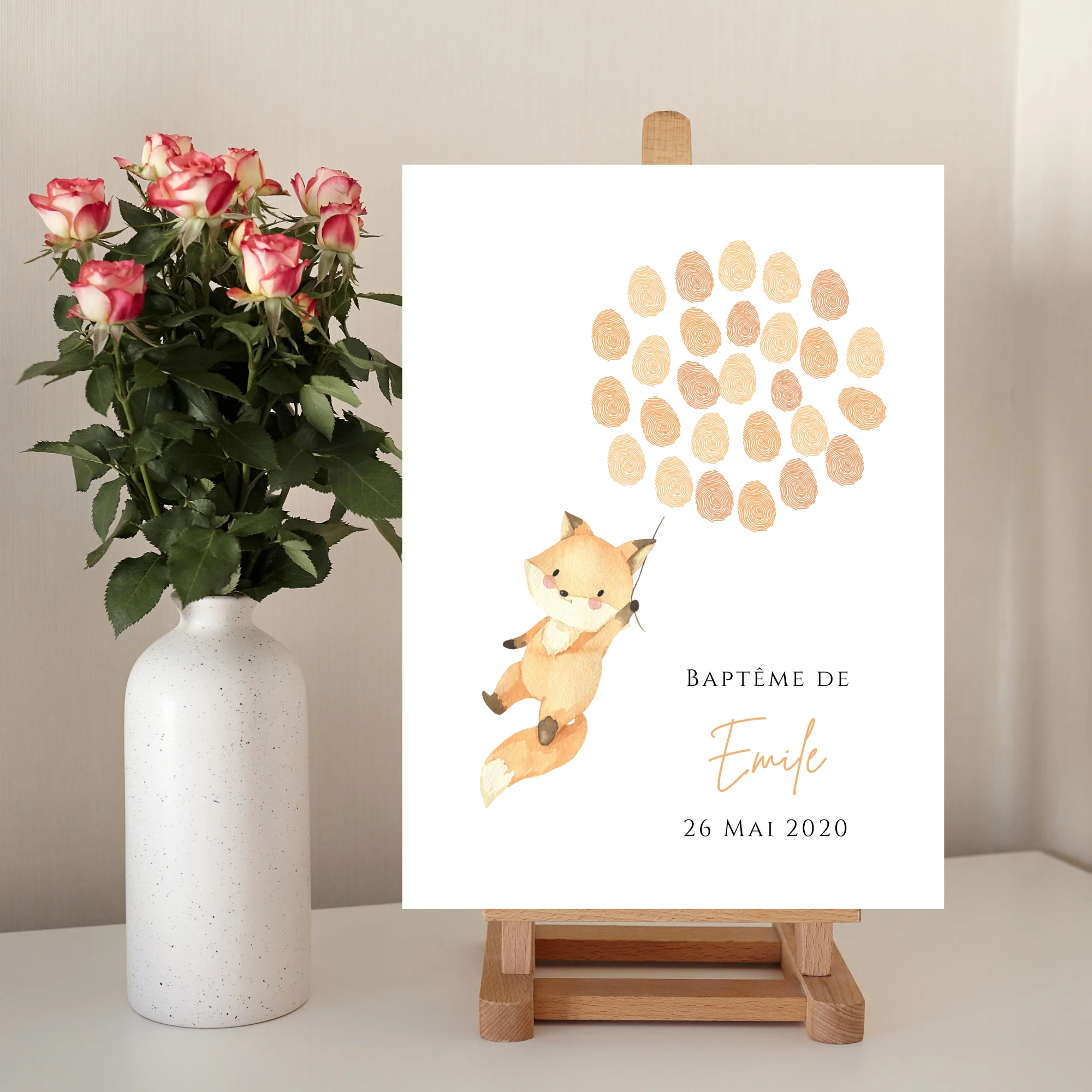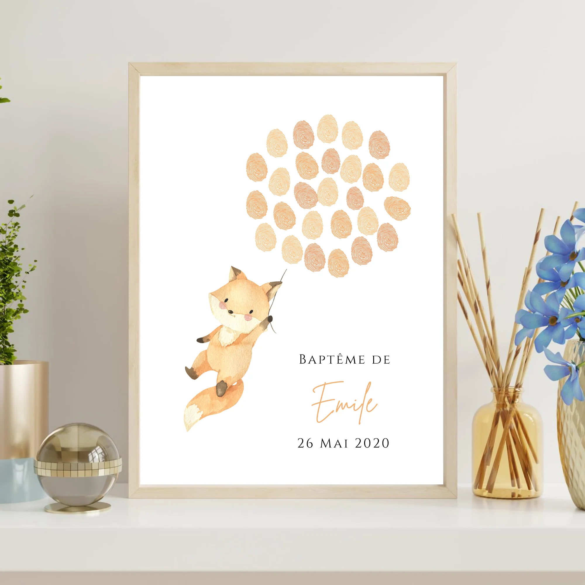 ❤️ Joli modèle d’arbre à empreinte pour le baptême ou anniversaire de votre enfant. L’affiche est décorée avec un renard accroché à un fil de ballon (à compléter avec les empreintes).