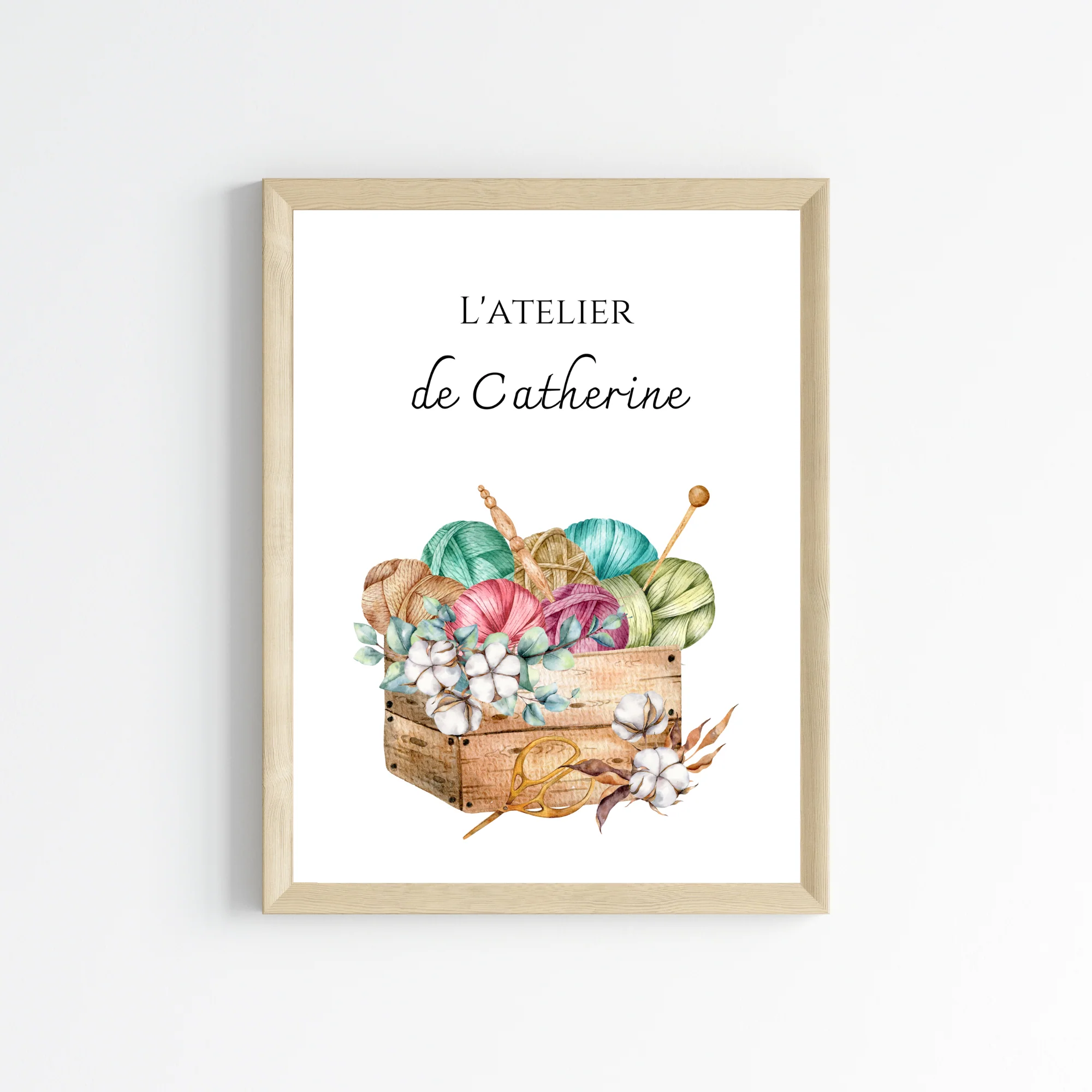 ❤️ Jolie affiche personnalisée pour un atelier de tricot ou de loisir créatif. L’affiche est décorée avec une caisse remplie de pelote de laine et des aiguilles à tricoter ainsi que le texte « Atelier + un prénom ».