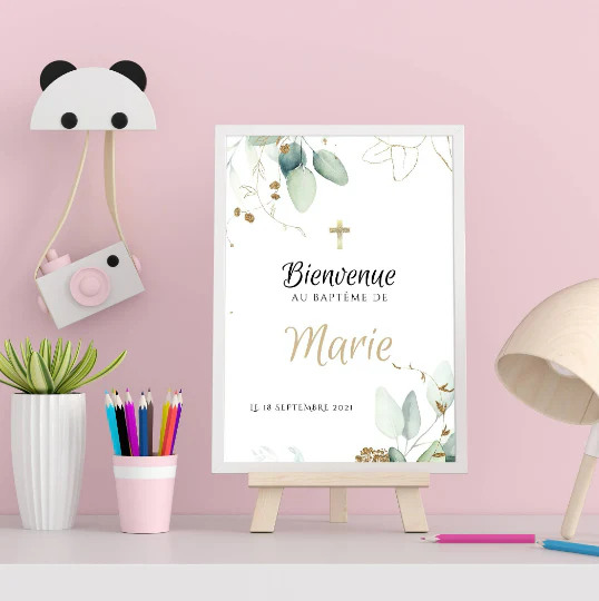 Affiche bienvenue baptême eucalyptus / anniversaire personnalisée – Panneau de bienvenue pour bapteme par le Temps des Paillettes