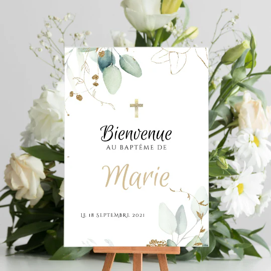 Jolie modèle d’affiche de bienvenue pour baptême décoré avec des feuilles eucalyptus et or! Un panneau de bienvenue à personnaliser avec toutes les informations souhaitées (date du baptême ou anniversaire, prénom de l’enfant). Tous les champs sont modifiables selon vos envies. Le panneau fera son effet que ce soit à l’église ou placé sur le lieu de réception.