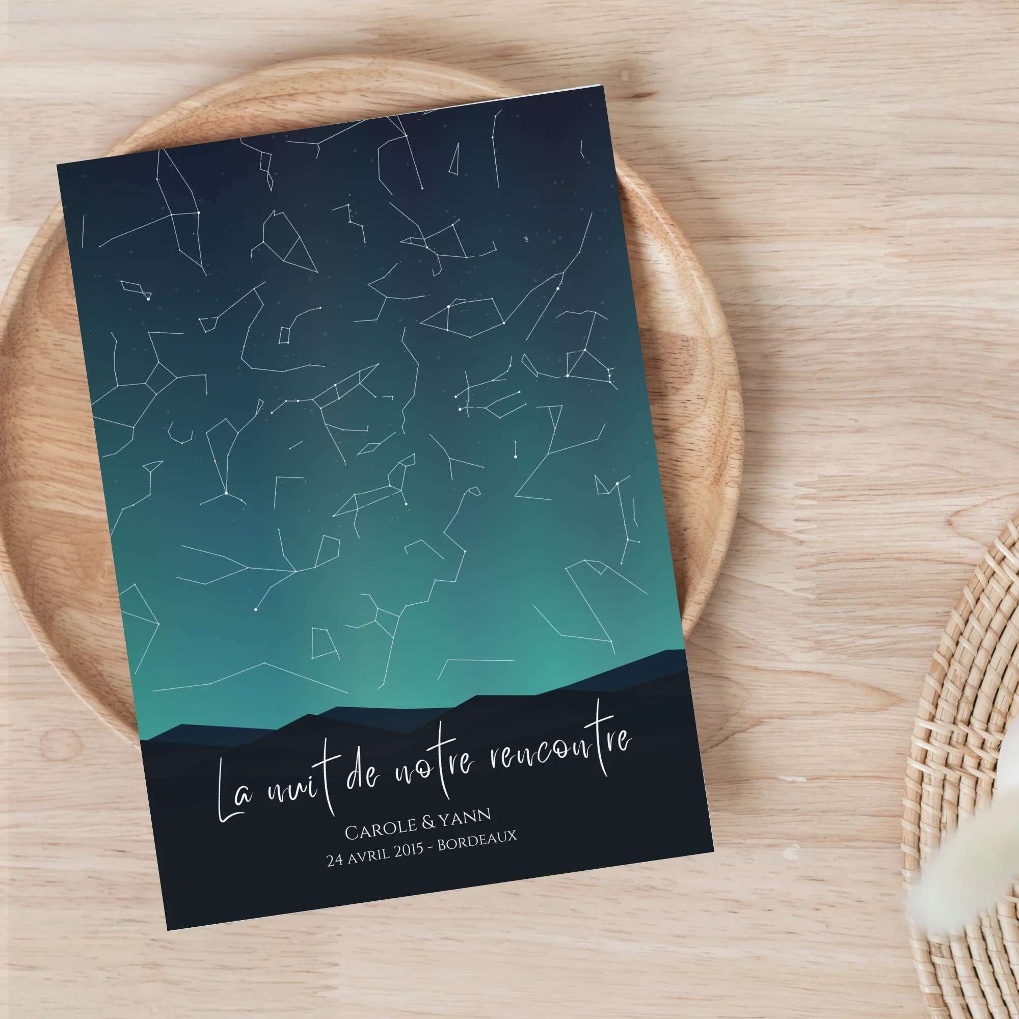 Offrez un cadeau unique et rempli d’émotion avec notre affiche constellation personnalisée. Cette affiche étoilée immortalise un instant précieux en recréant la carte du ciel telle qu’elle apparaissait à la date, l’heure et au lieu de votre choix.