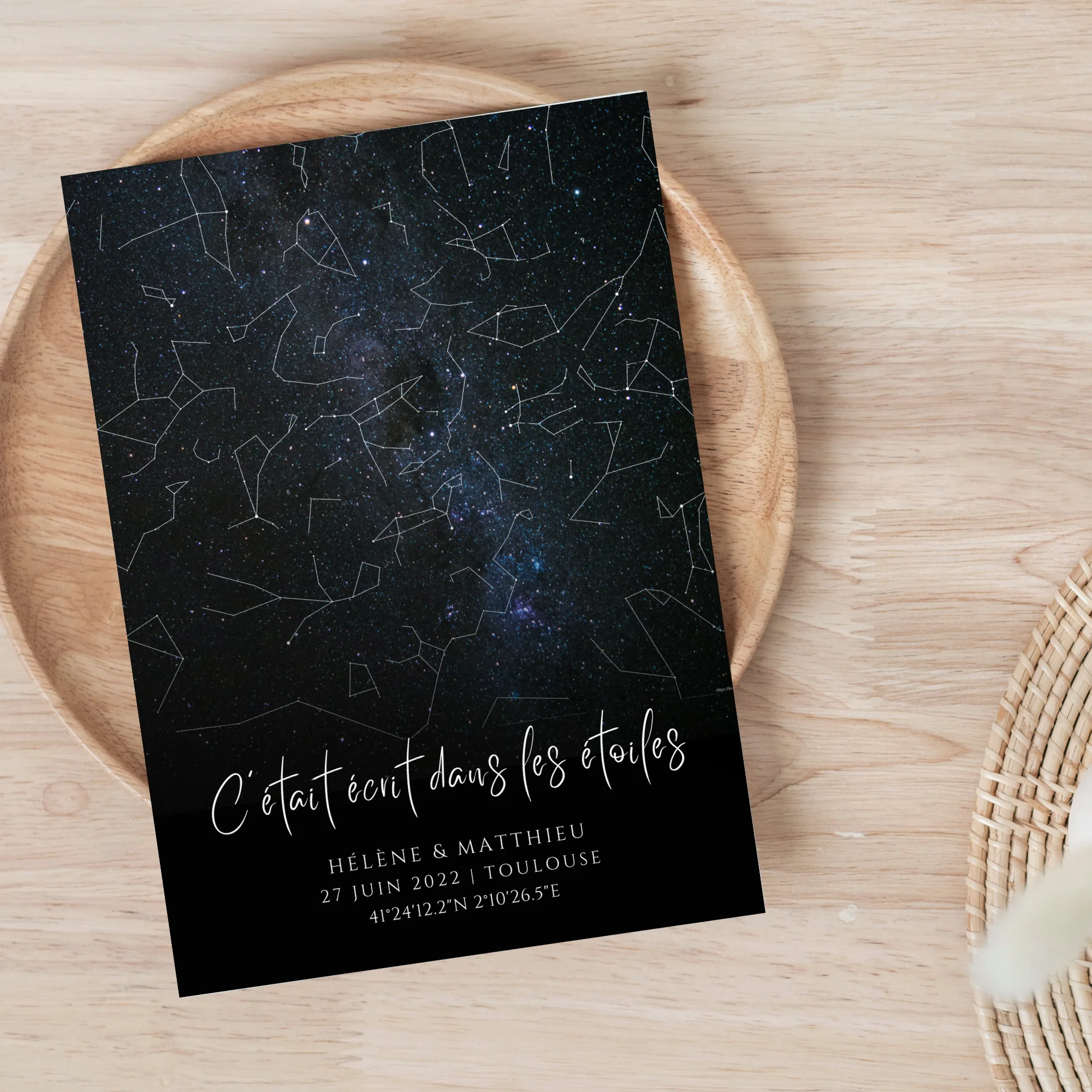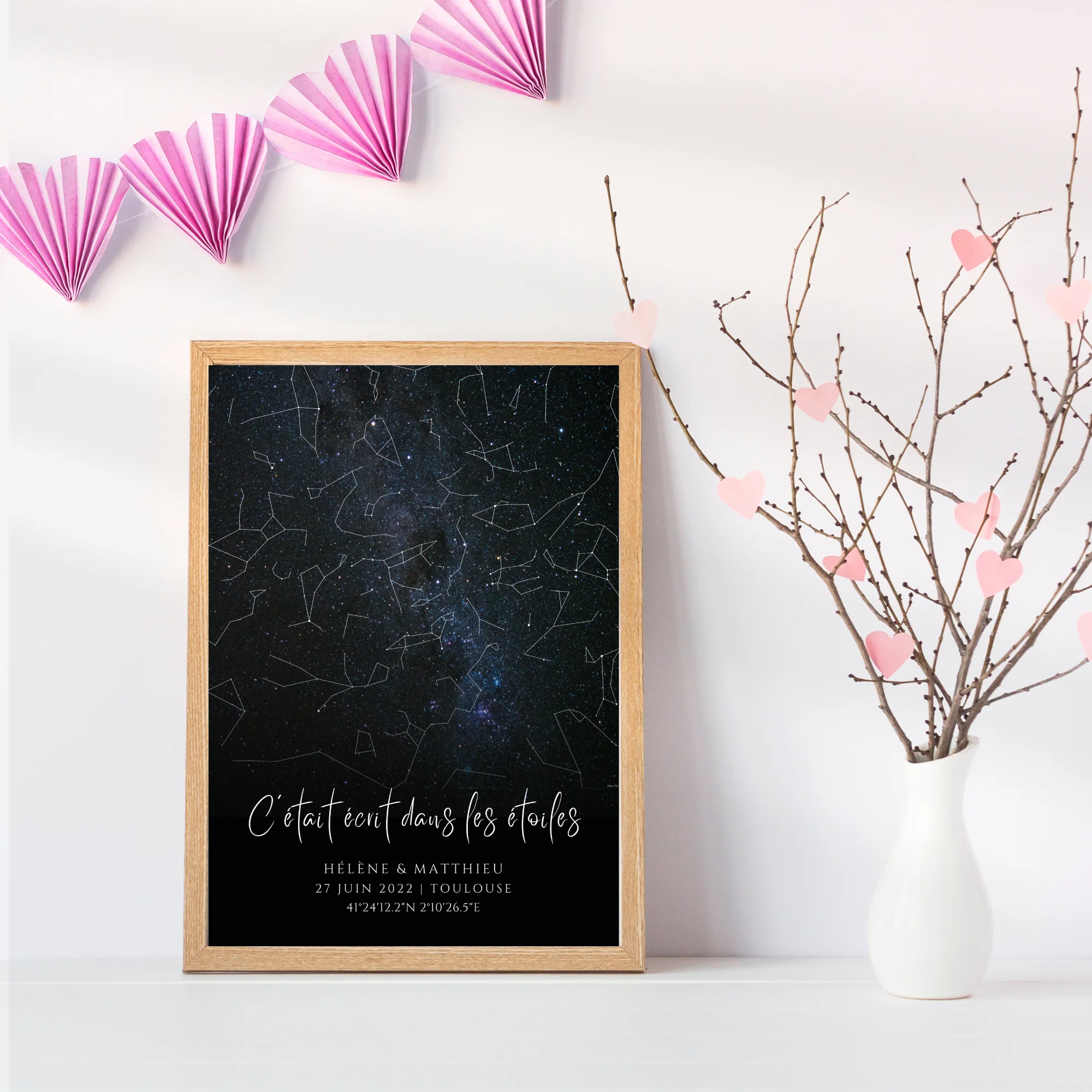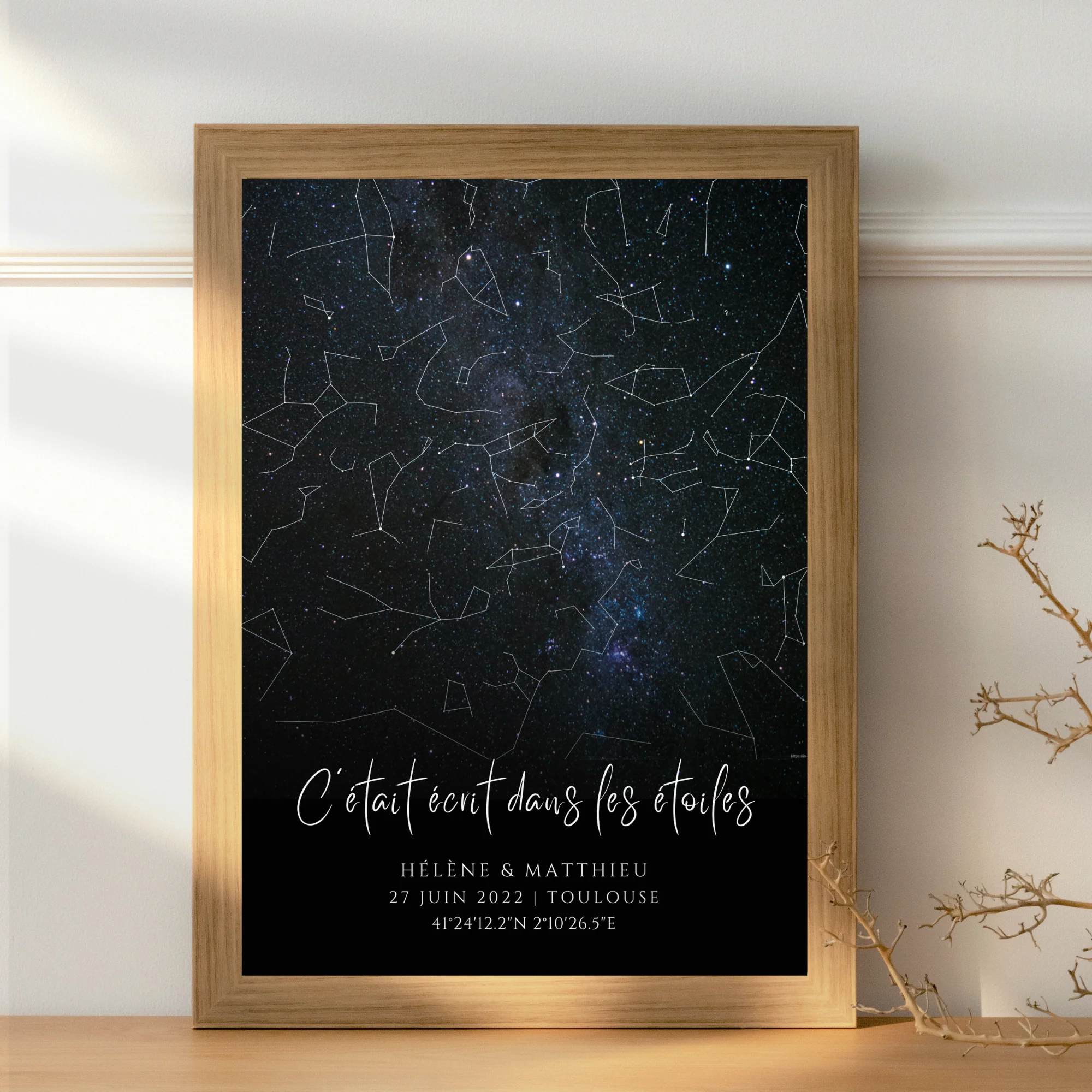Offrez un cadeau unique et rempli d’émotion avec notre affiche constellation personnalisée. Cette affiche étoilée immortalise un instant précieux en recréant la carte du ciel telle qu’elle apparaissait à la date, l’heure et au lieu de votre choix.