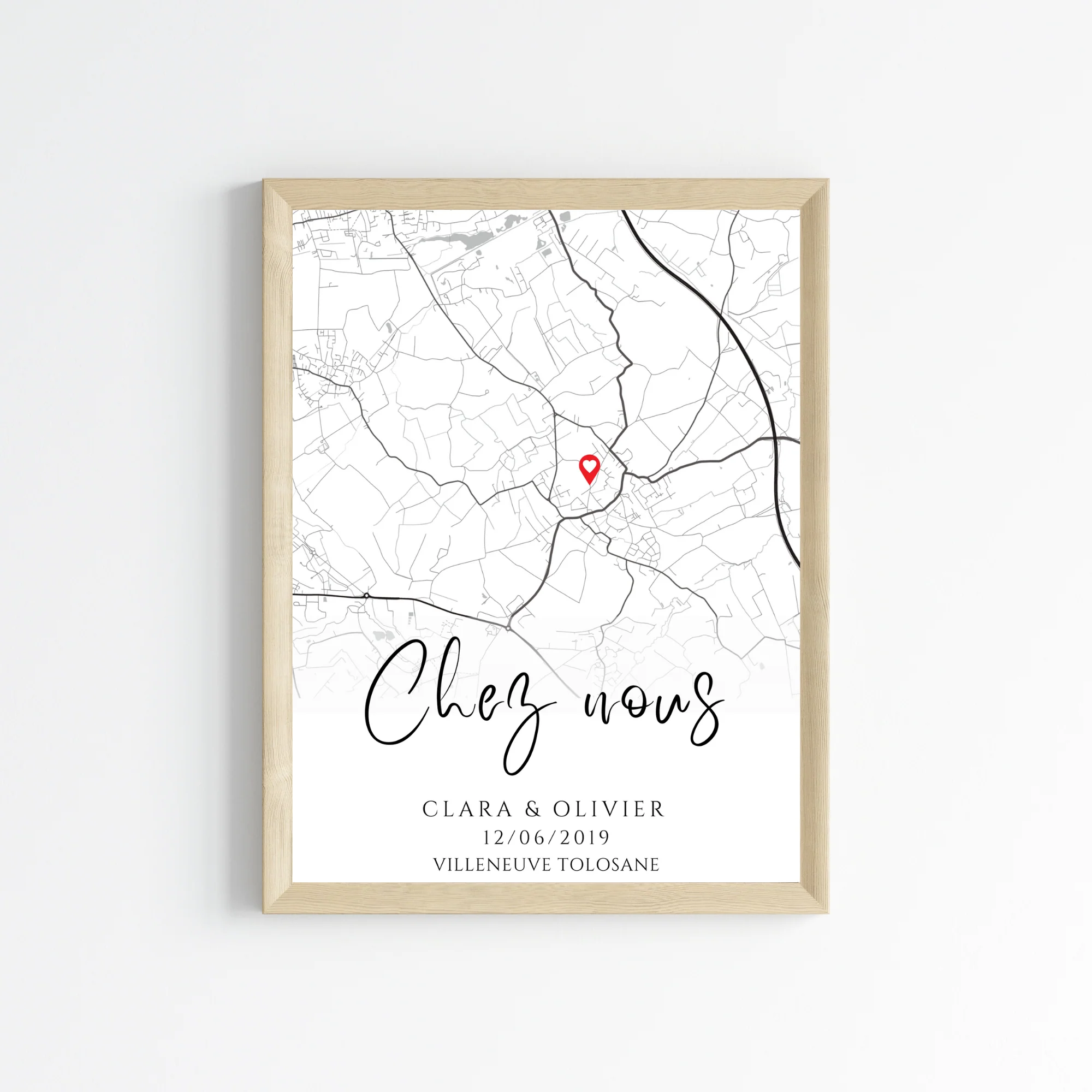 Affiche carte personnalisée – couple, lieu de rencontre, fiançailles, mariage, maison