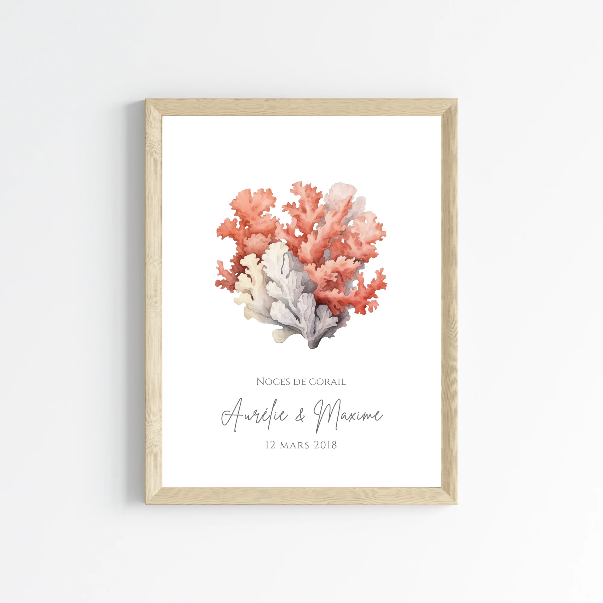 🎉 Célébrez vos 11 ans de mariage avec une affiche personnalisée spéciale noces de corail! Cette création unique met en valeur une élégante illustration de corail, accompagnée de vos deux prénoms et d’une date importante (mariage ou anniversaire des noces de mariage).