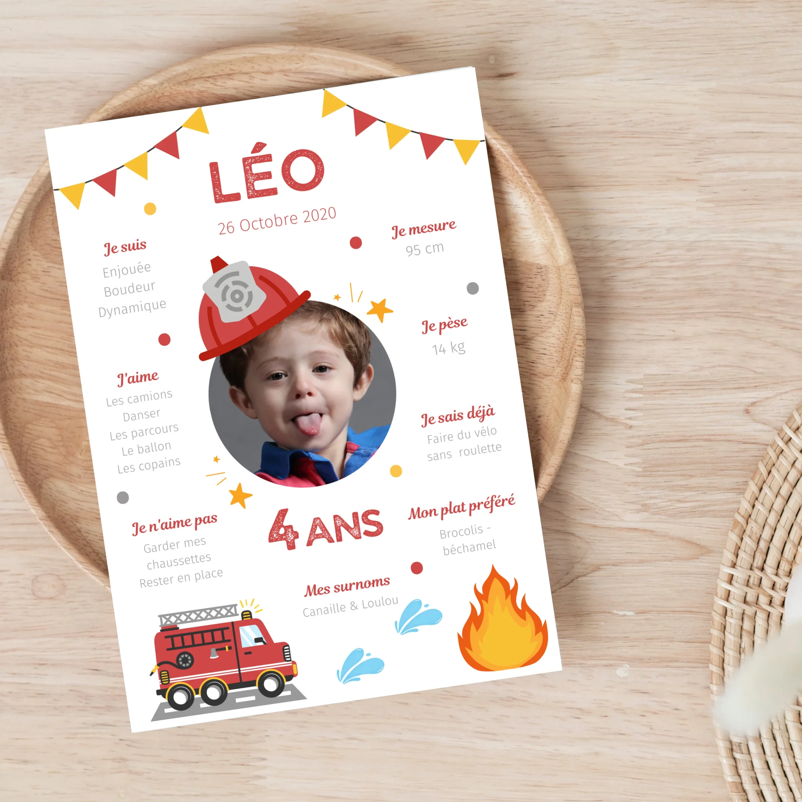 Cette affiche personnalisée pompier est idéale pour ajouter une touche unique à l’événement. Remplissez le champ de personnalisation avec les informations suivantes pour créer une affiche qui reflète la personnalité de l’enfant :