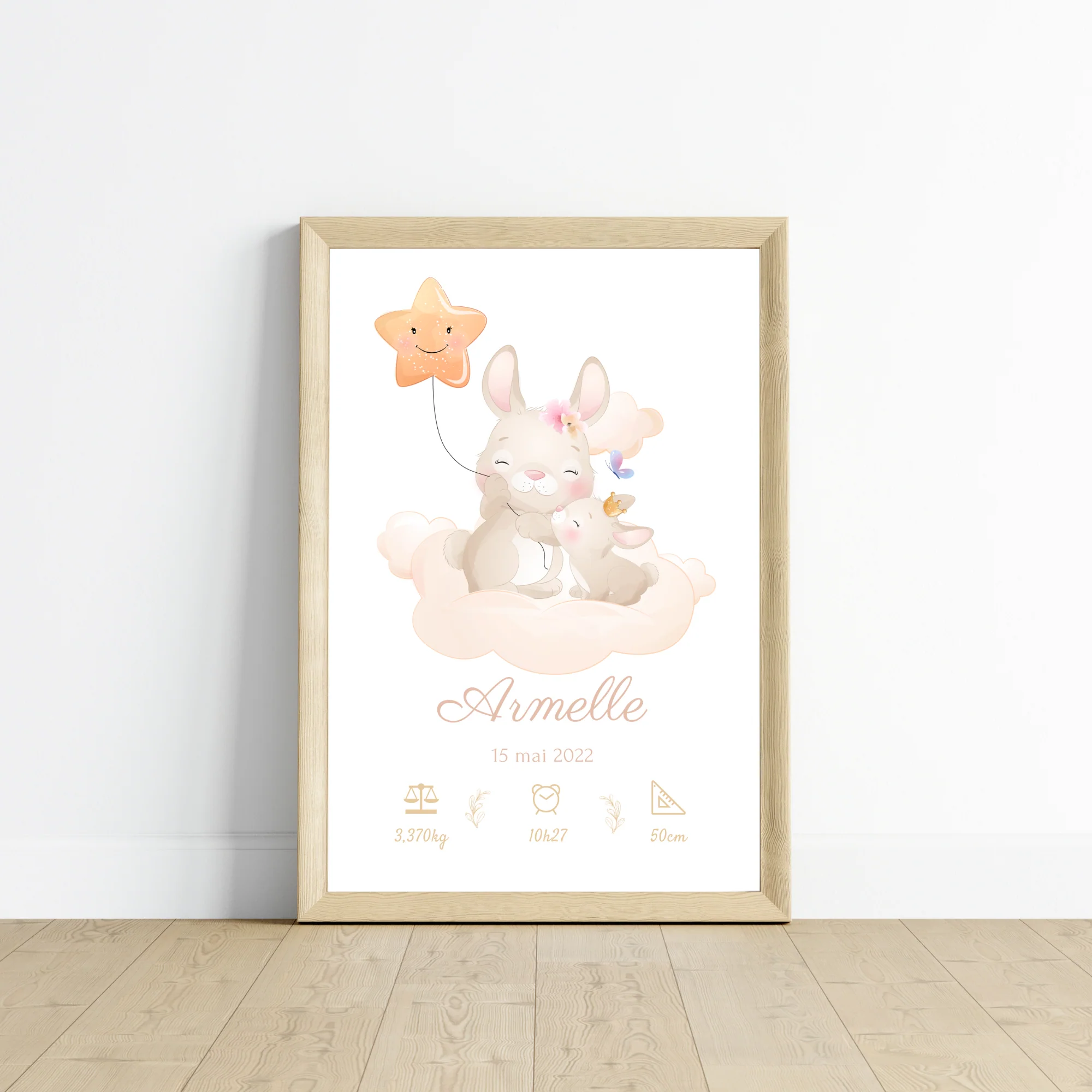 Affiche de naissance lapin – Cadeau de naissance personnalisé