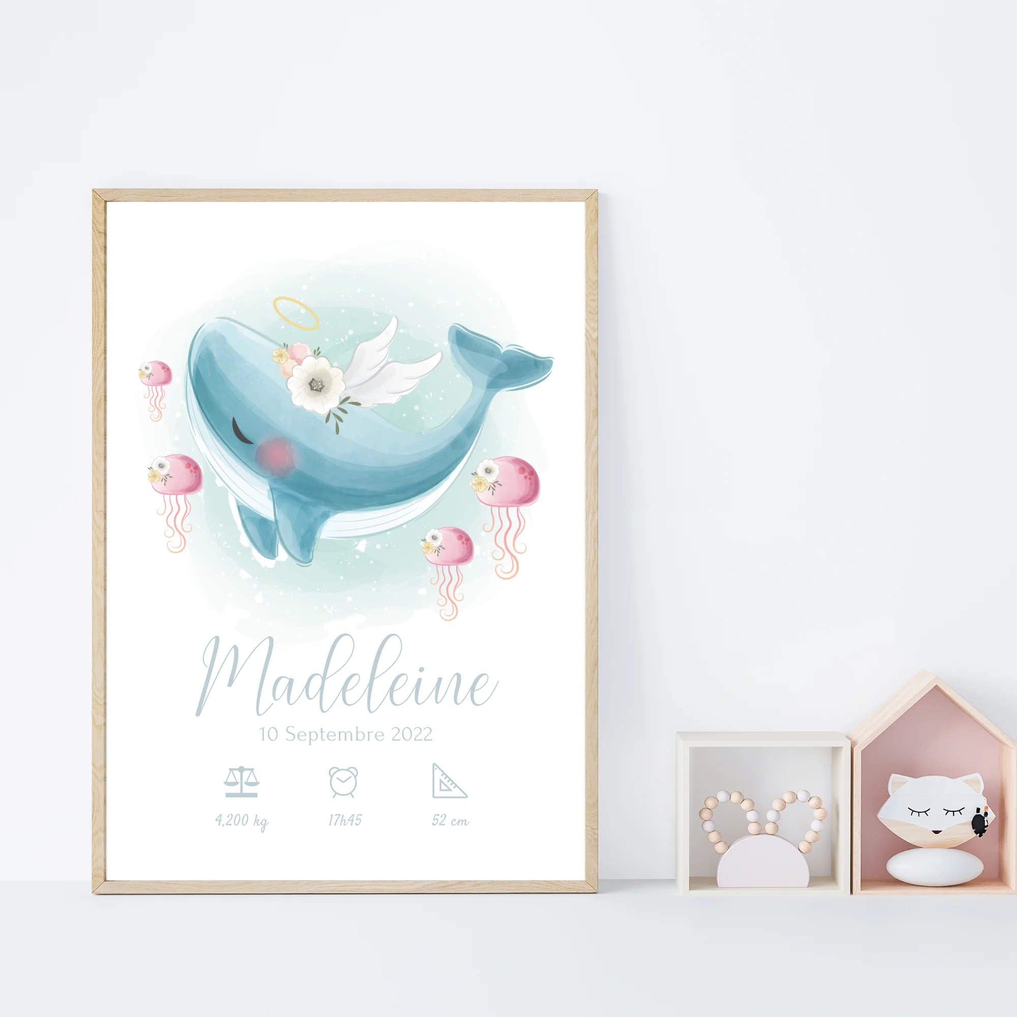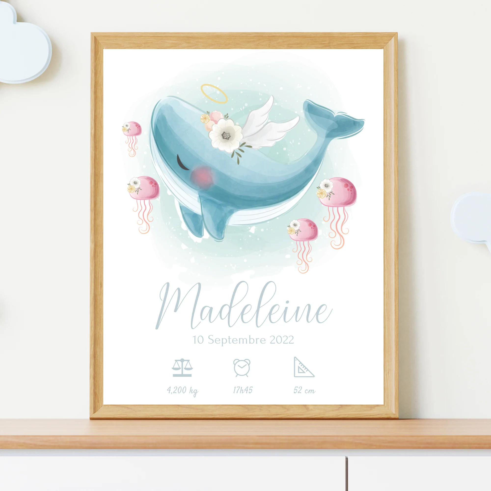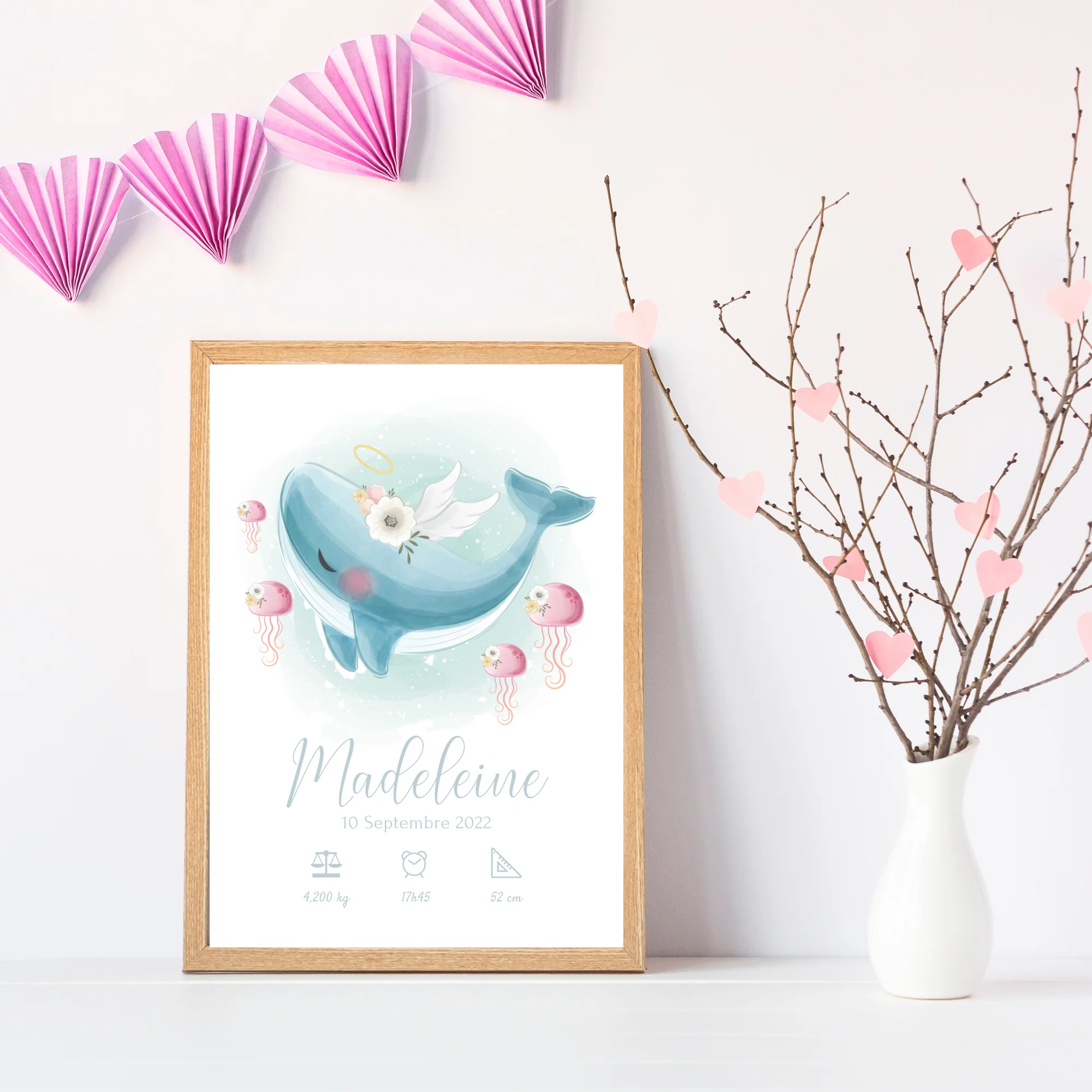 Affiche de naissance personnalisée prénom et baleine – Cadeau de naissance personnalisé par Le Temps des Paillettes
