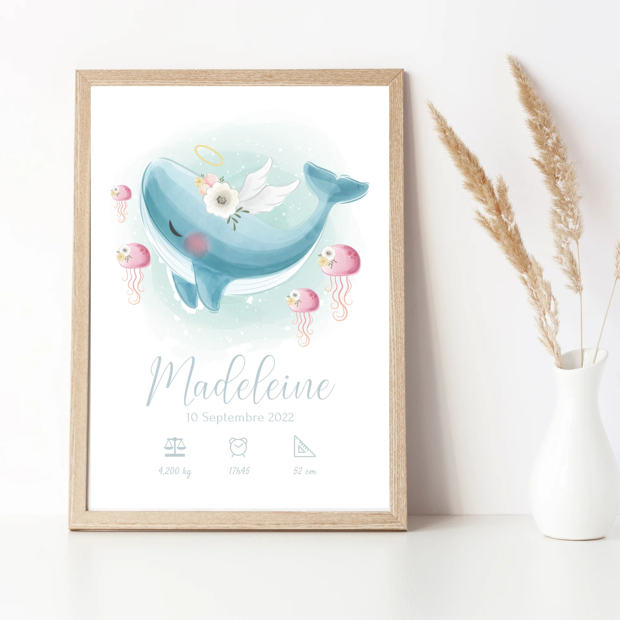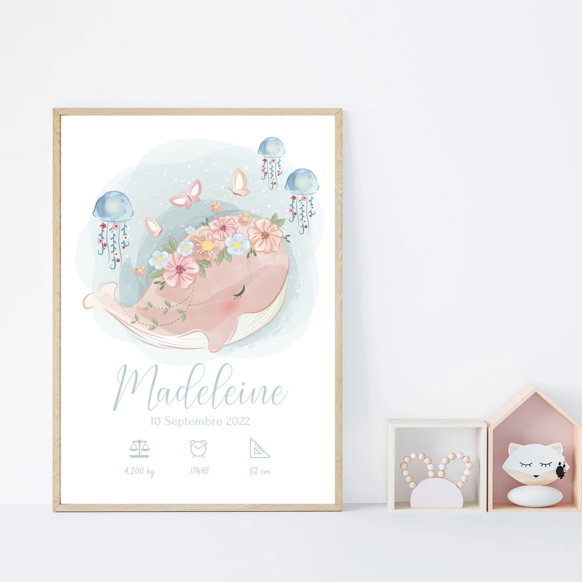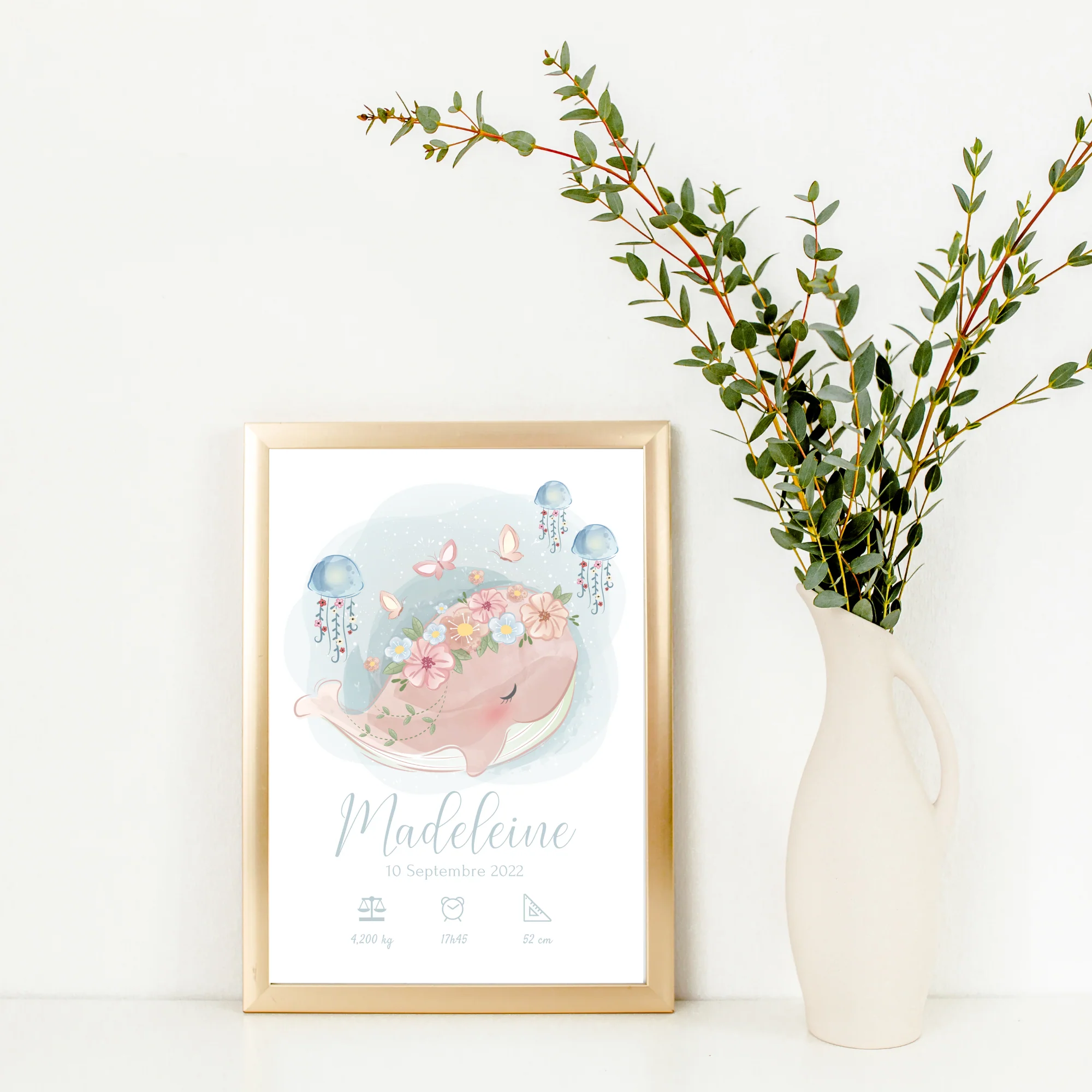 Affiche de naissance personnalisée prénom et baleine – Cadeau de naissance personnalisé par Le Temps des Paillettes
