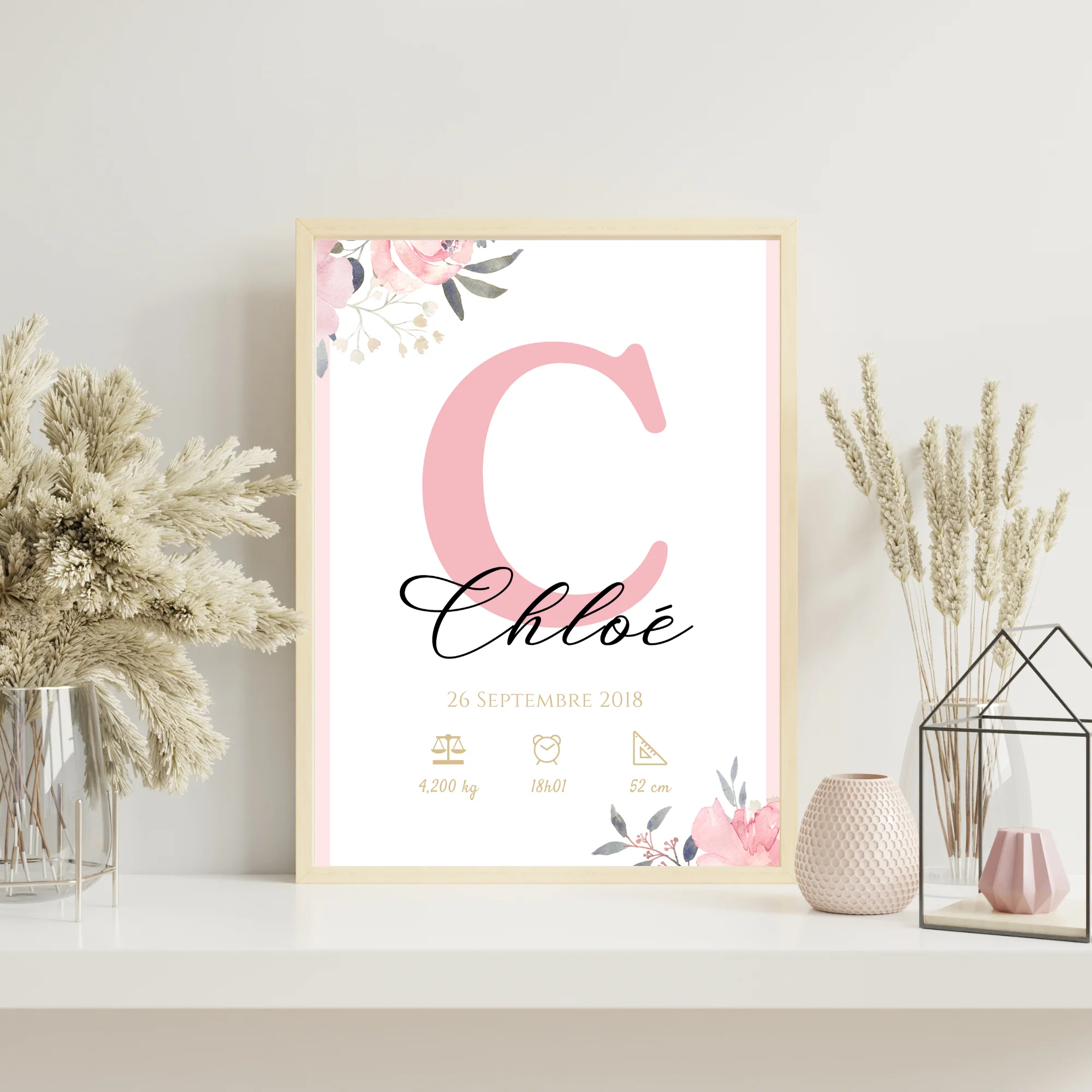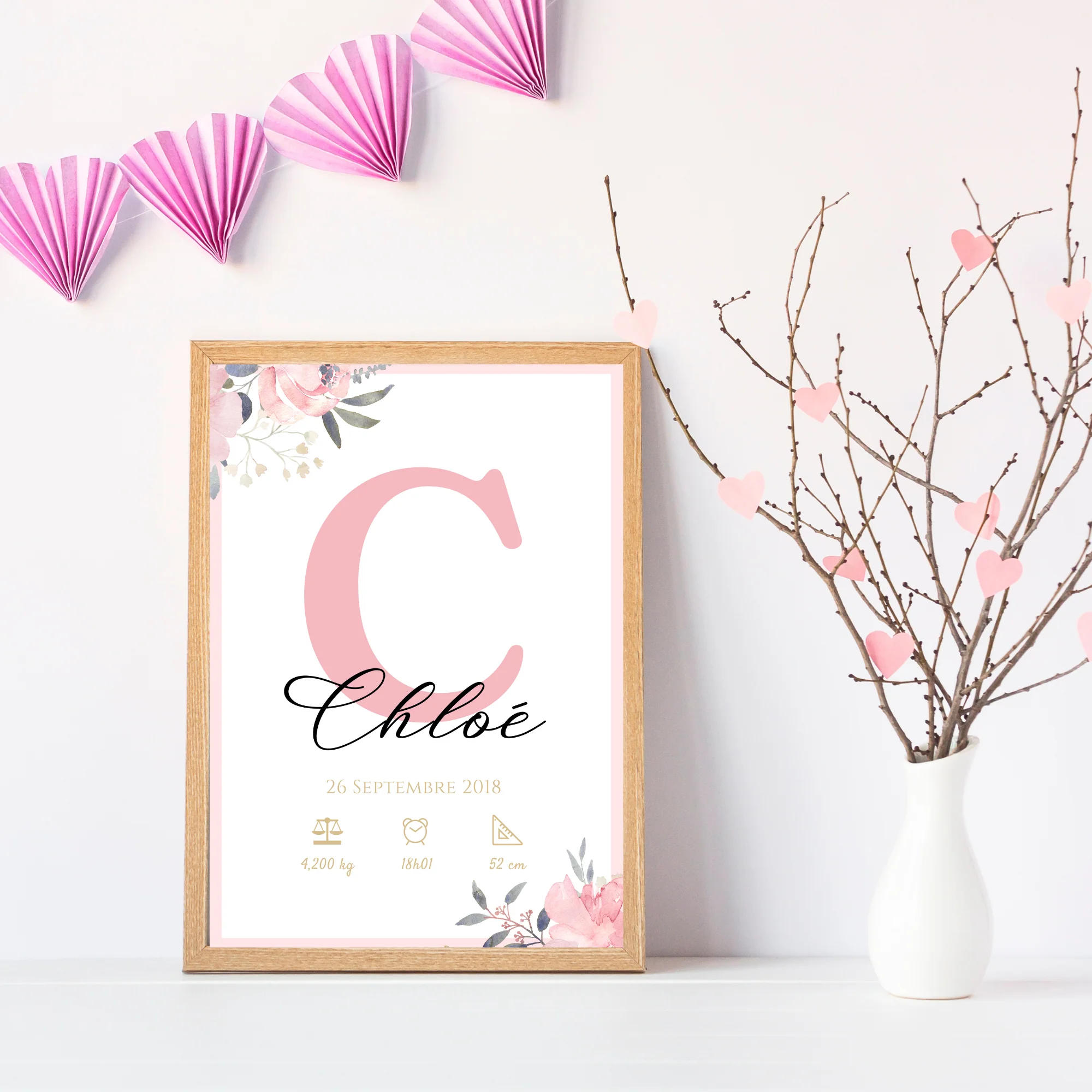 Affiche de naissance personnalisée prénom initiale rose – Cadeau de naissance personnalisé par Le Temps des Paillettes