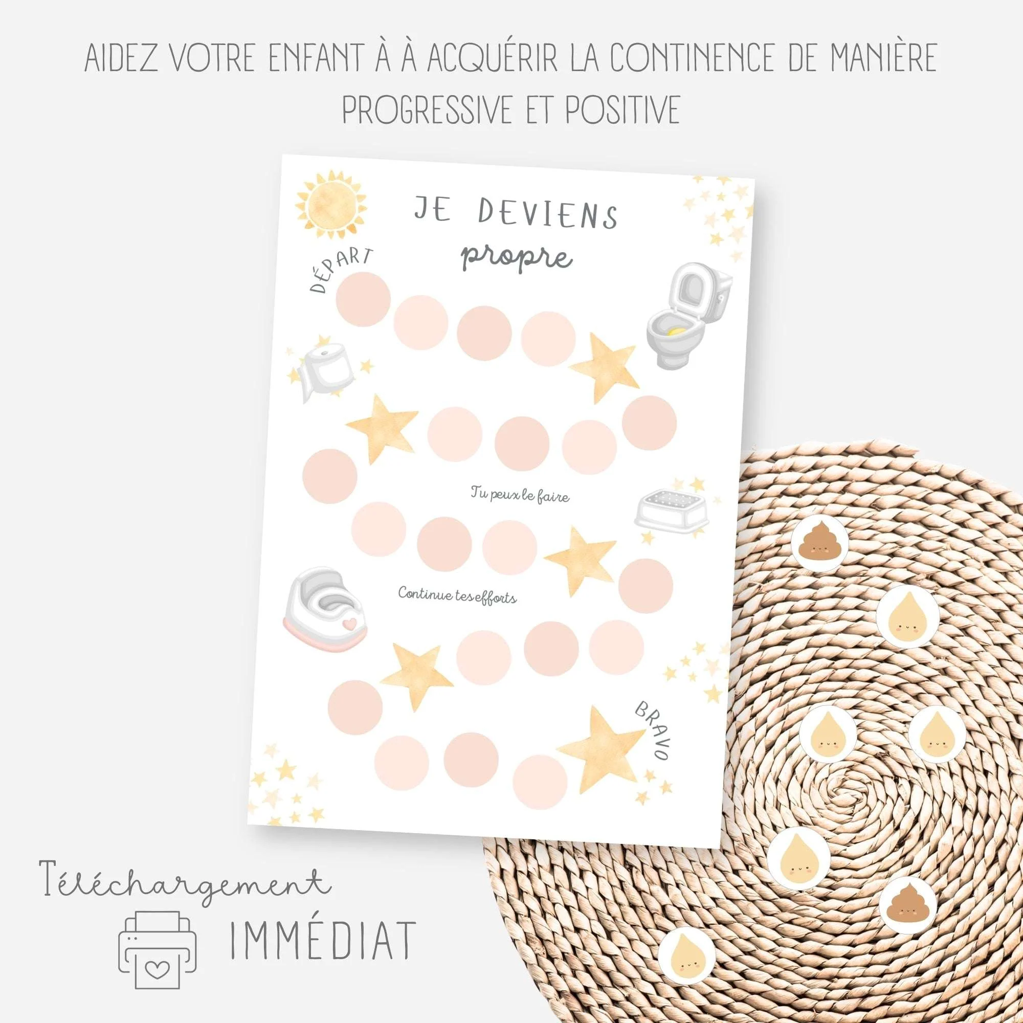 Chaque fois que votre enfant essaiera d’aller sur le pot ou les toilettes, il posera une vignette sur son affiche. À chaque étape, célébrez ses progrès, il sera fier de lui !
