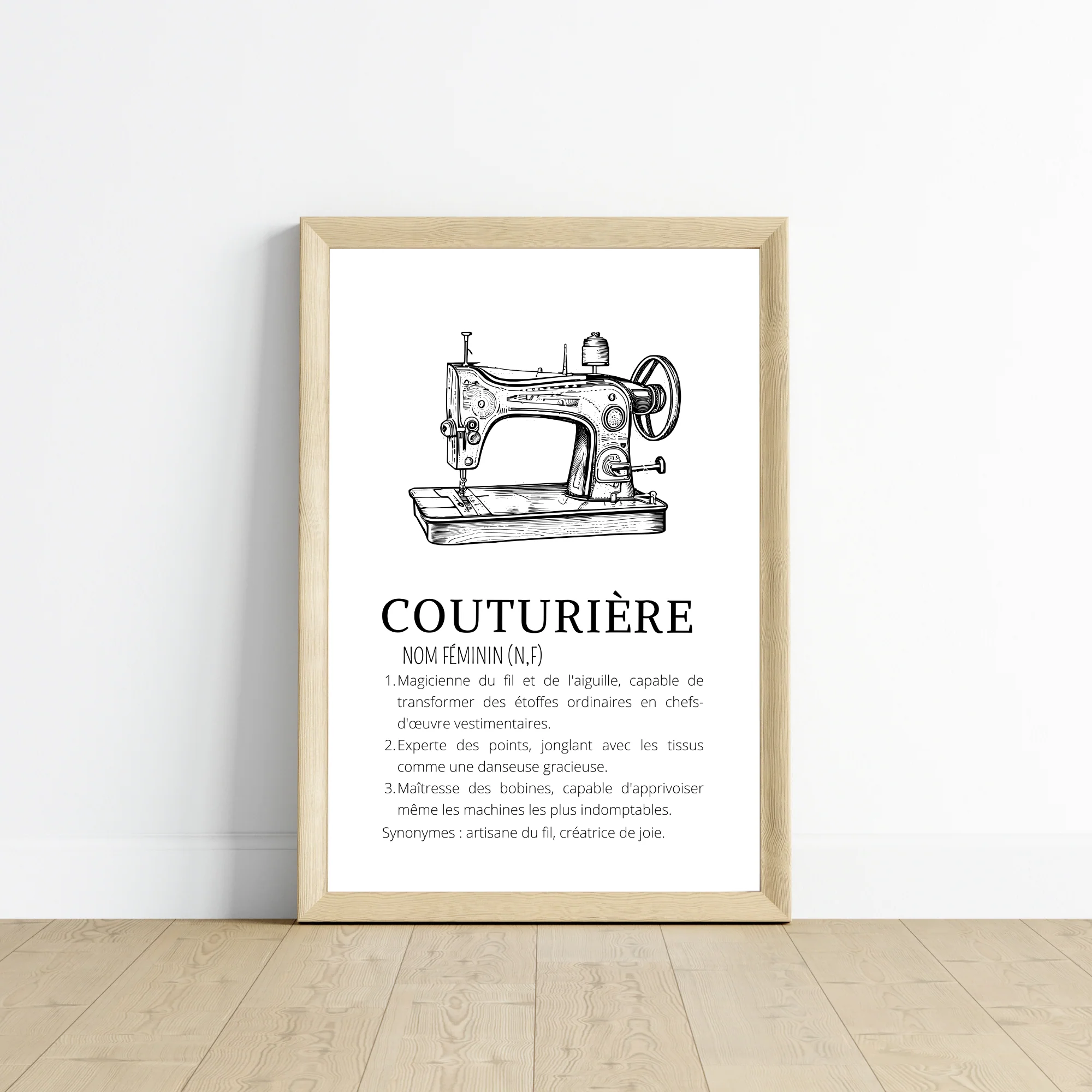 ❤️ Jolie affiche définition pour couturière. L’affiche présente une définition drole décrivant une couturière ainsi qu’une illustration vintage en noir et blanc d’une machine à coudre donnant un look retro intemporelle à l’affiche.
