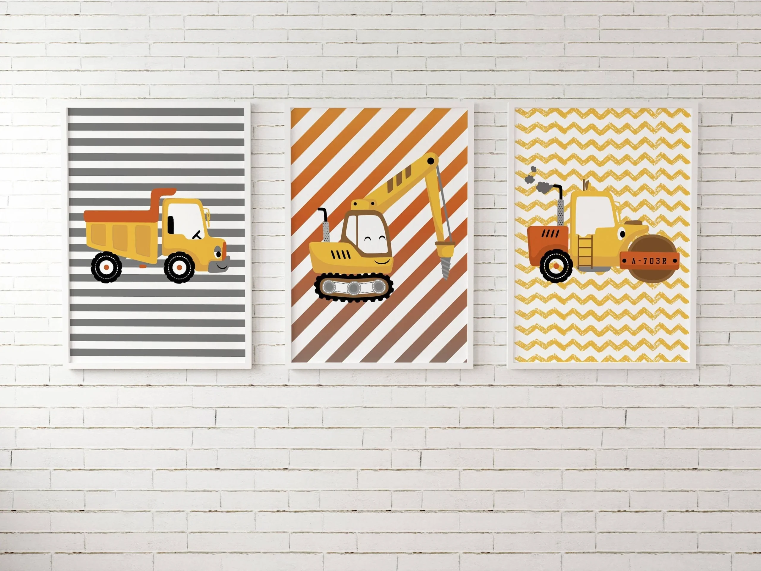 3 affiches pour enfant sur fonds rayés afin de décorer une chambre de petit garçon fan des engins de chantier. Ces affiches apportent de la couleur à la décoration avec des images de tractopelle, pelleteuse, camion-benne… tous les engins favoris de nos petits chefs de chantier en herbe ! Des affiches éducatives pour apprendre le nom des différents véhicules et décorer sa chambre en même temps.
