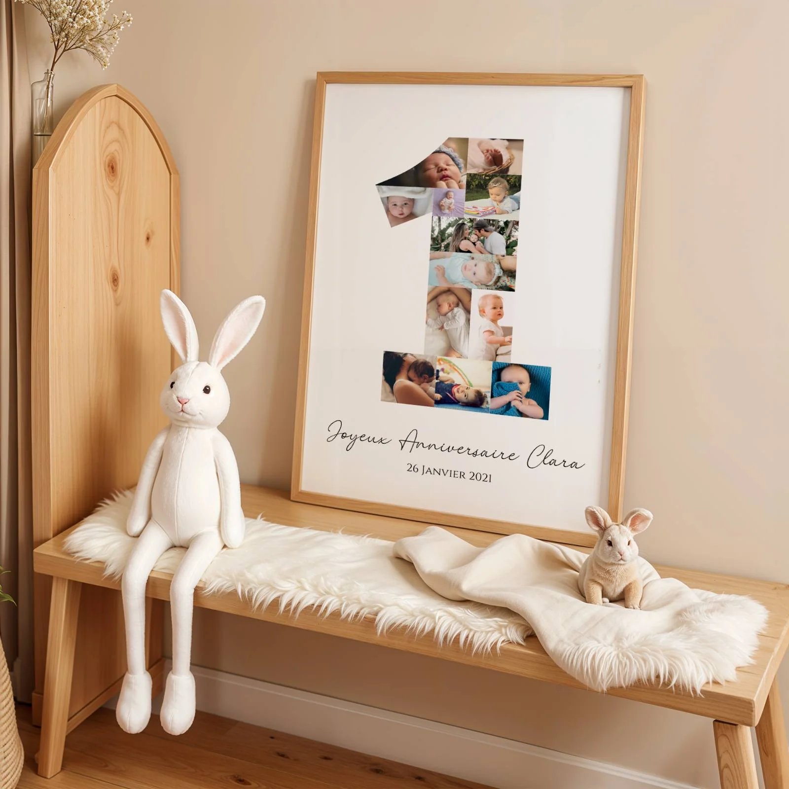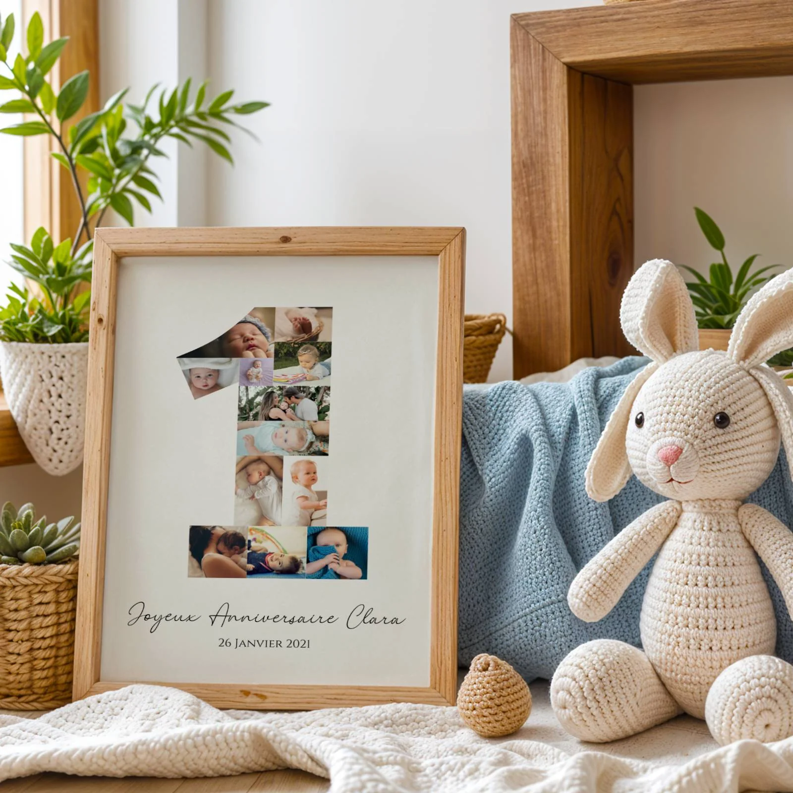Cette affiche personnalisée retrace les 12 premiers mois de votre bébé grâce à 12 jolies photos incrusté dans le chiffre 1. Une manière unique et émouvante de célébrer sa première année !