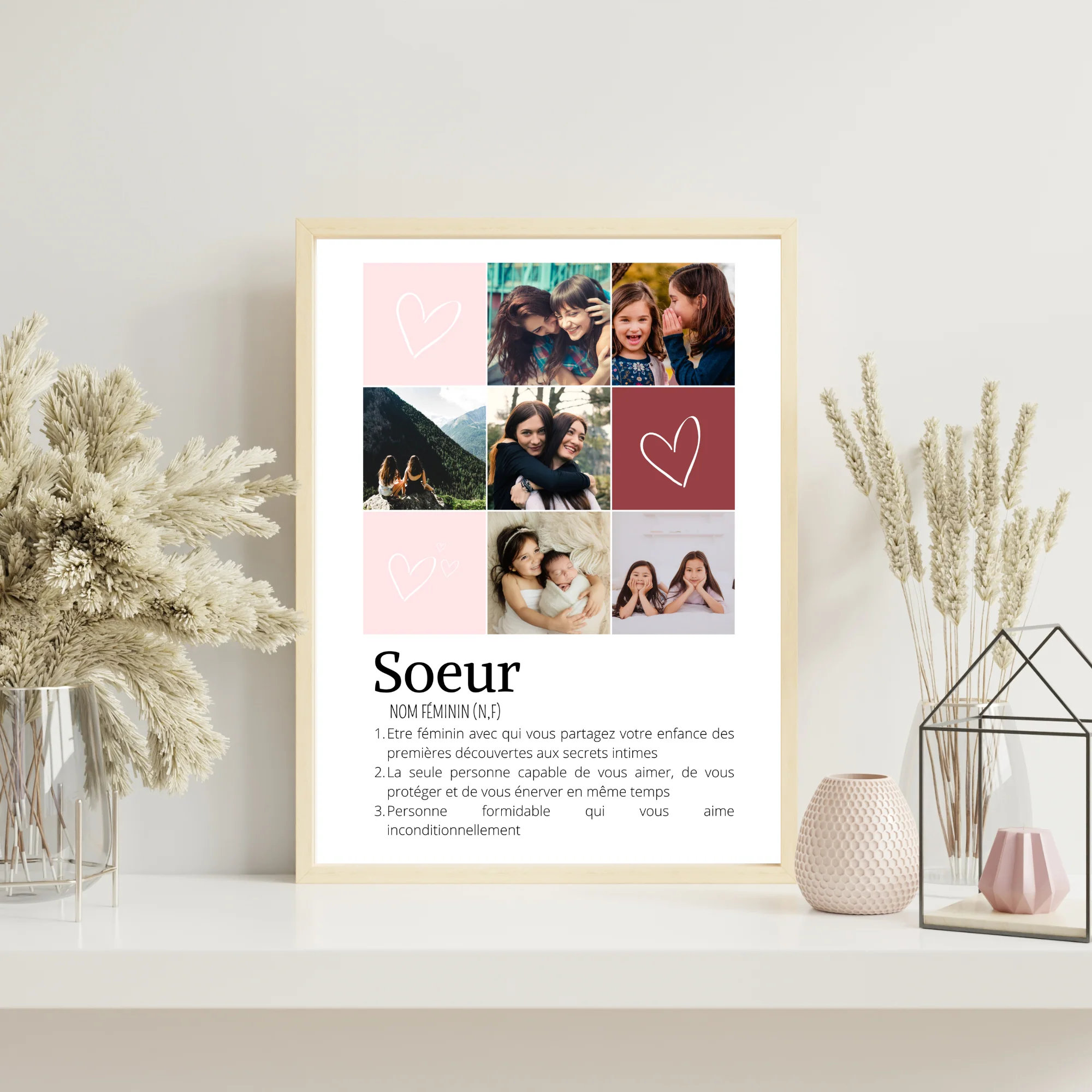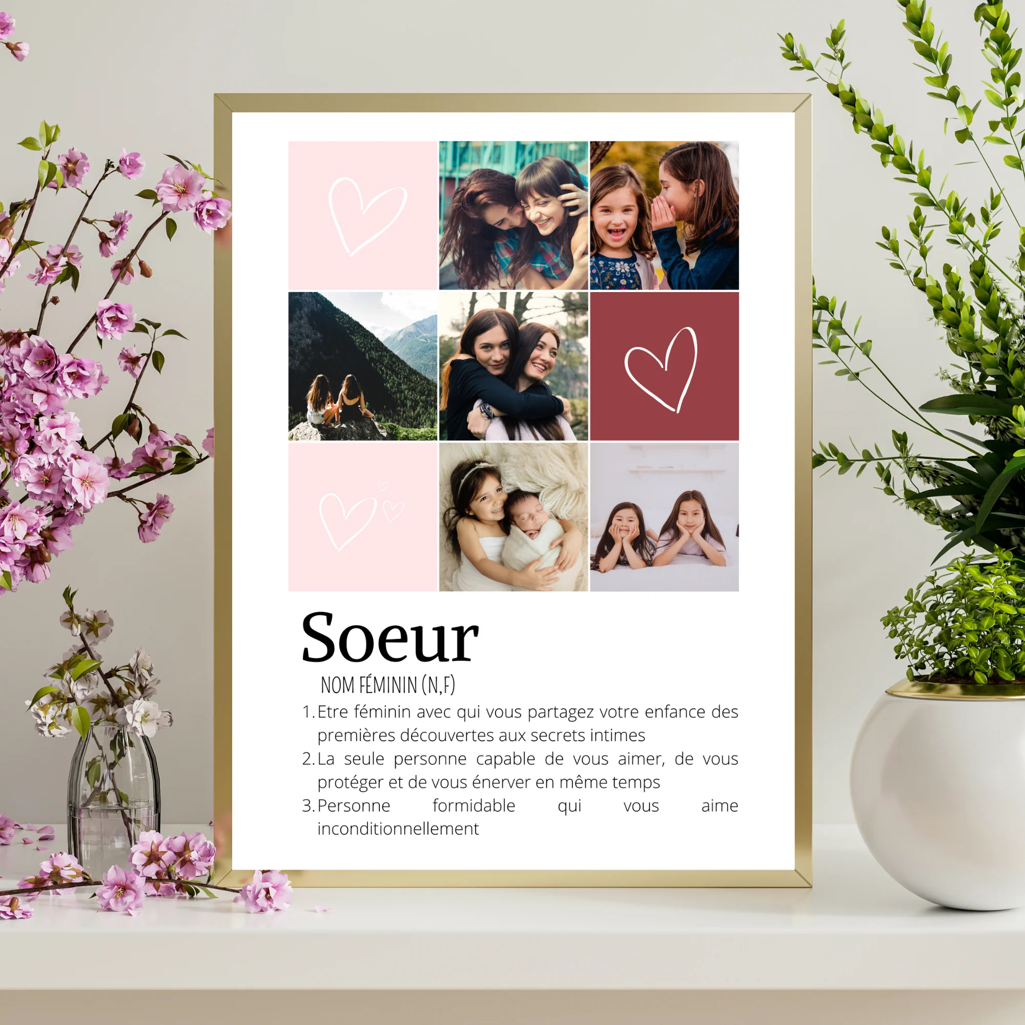 ❤️ Jolie affiche pour sœurs personnalisée avec une mosaïque de 6 photos et la définition du mot sœurs .