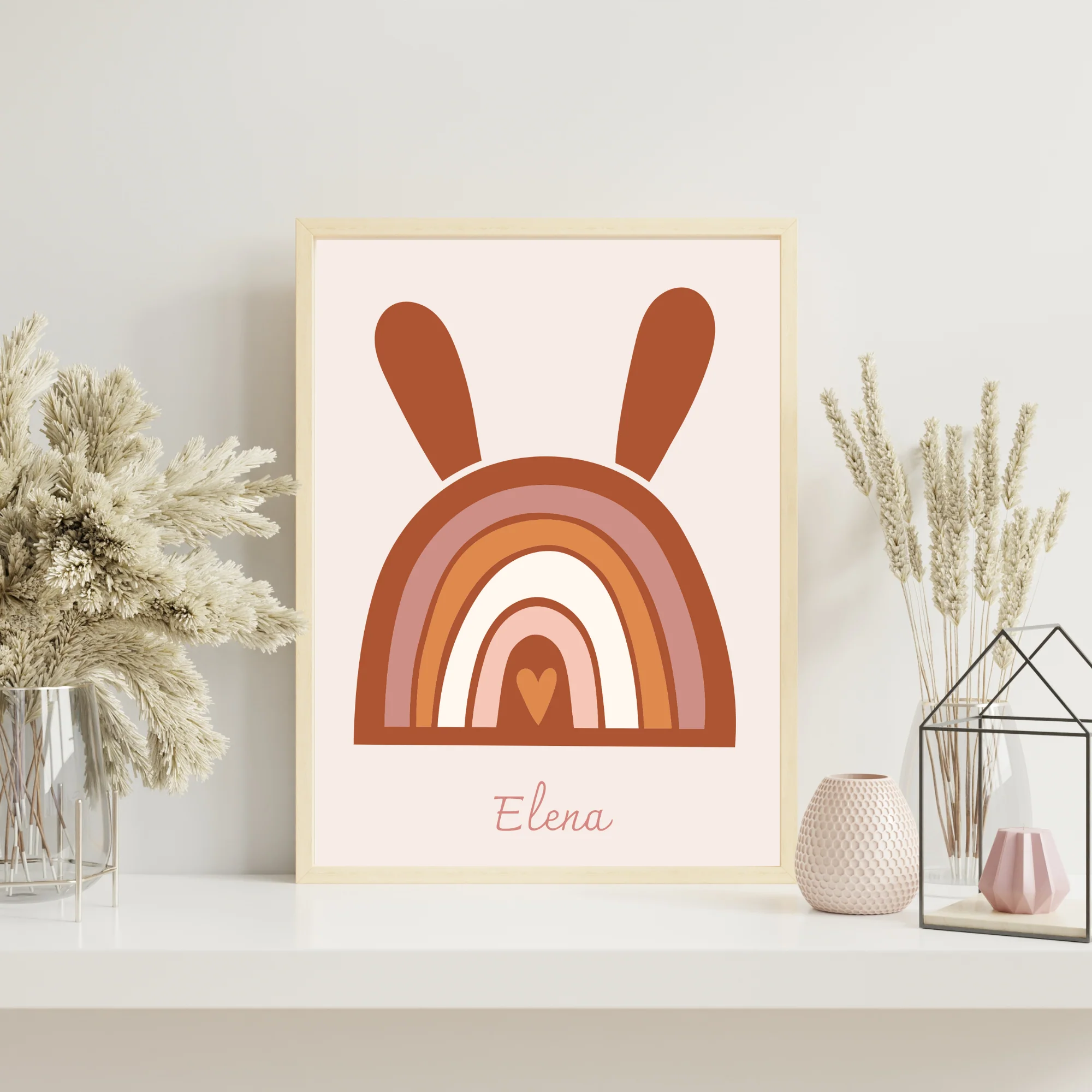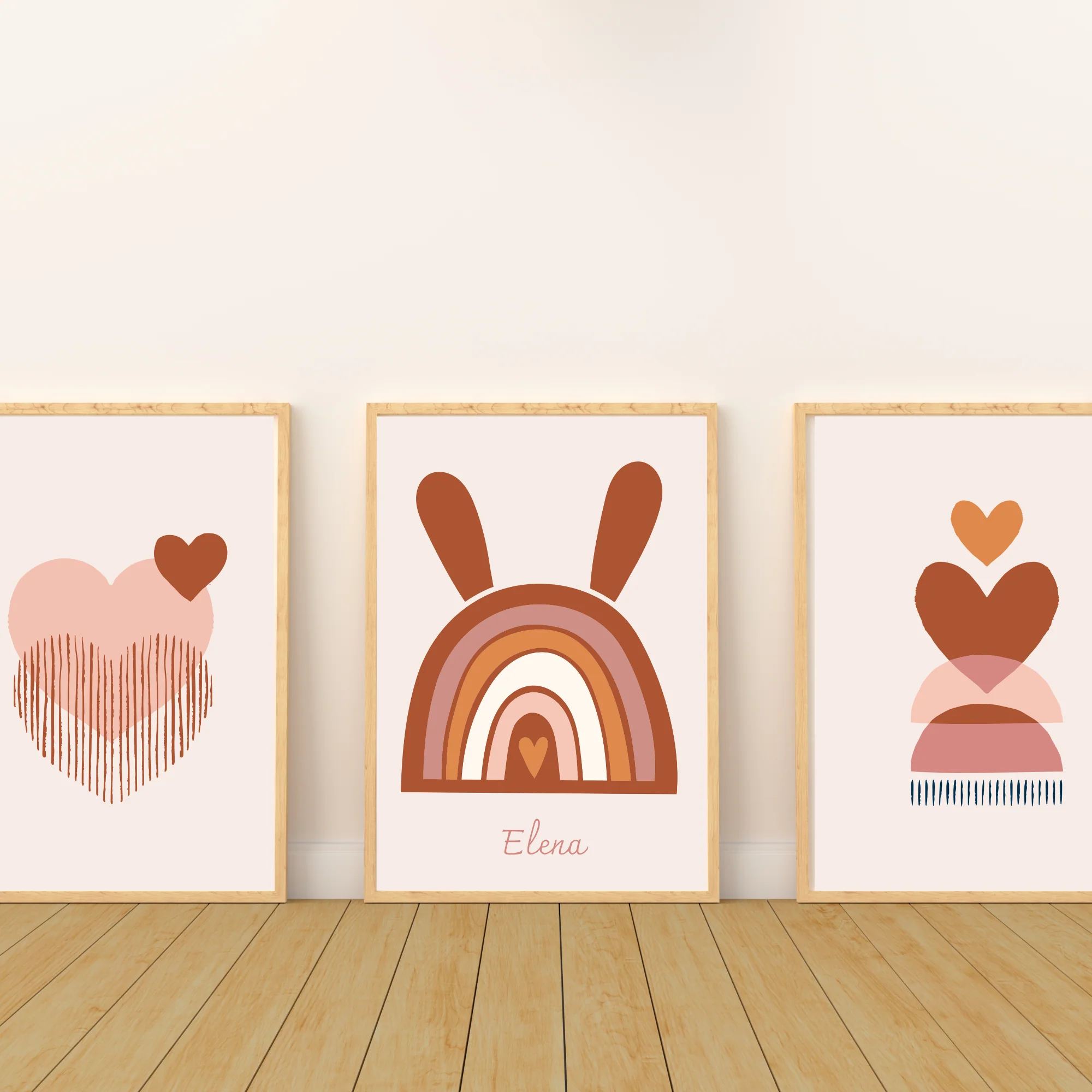 Affiches enfant Style Boho – Affiche de Naissance Arc-en-ciel Terracotta – Initiale et Triple Cœurs