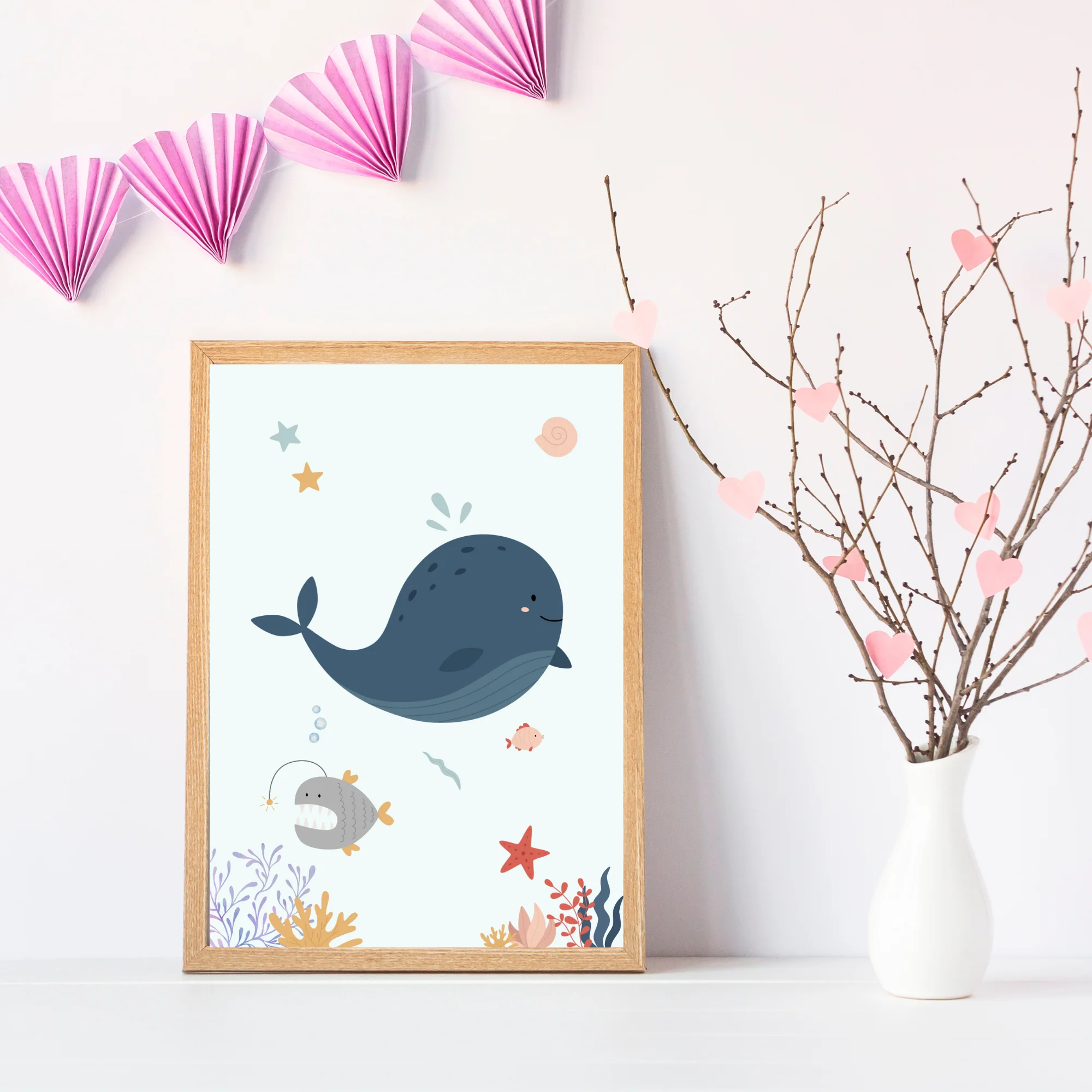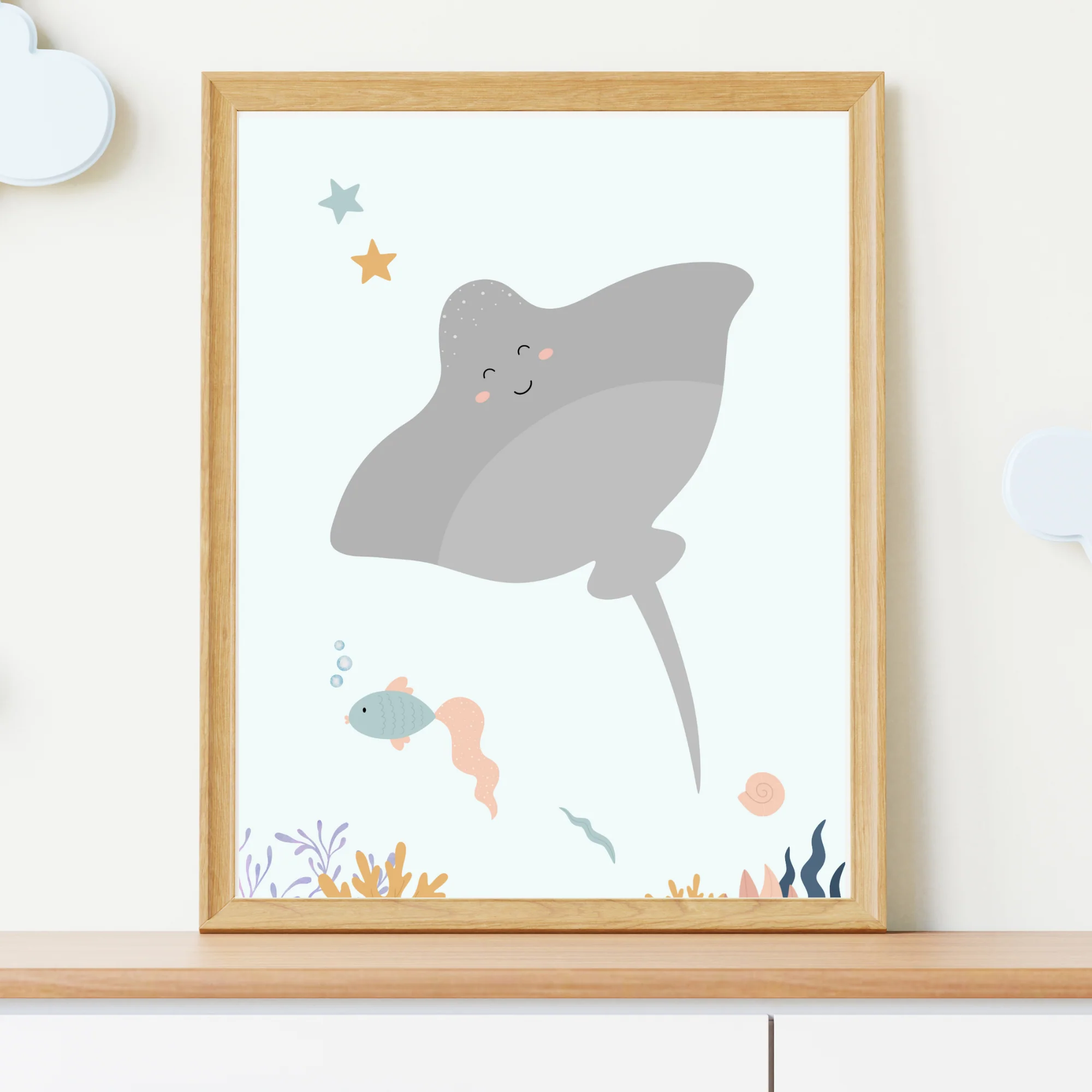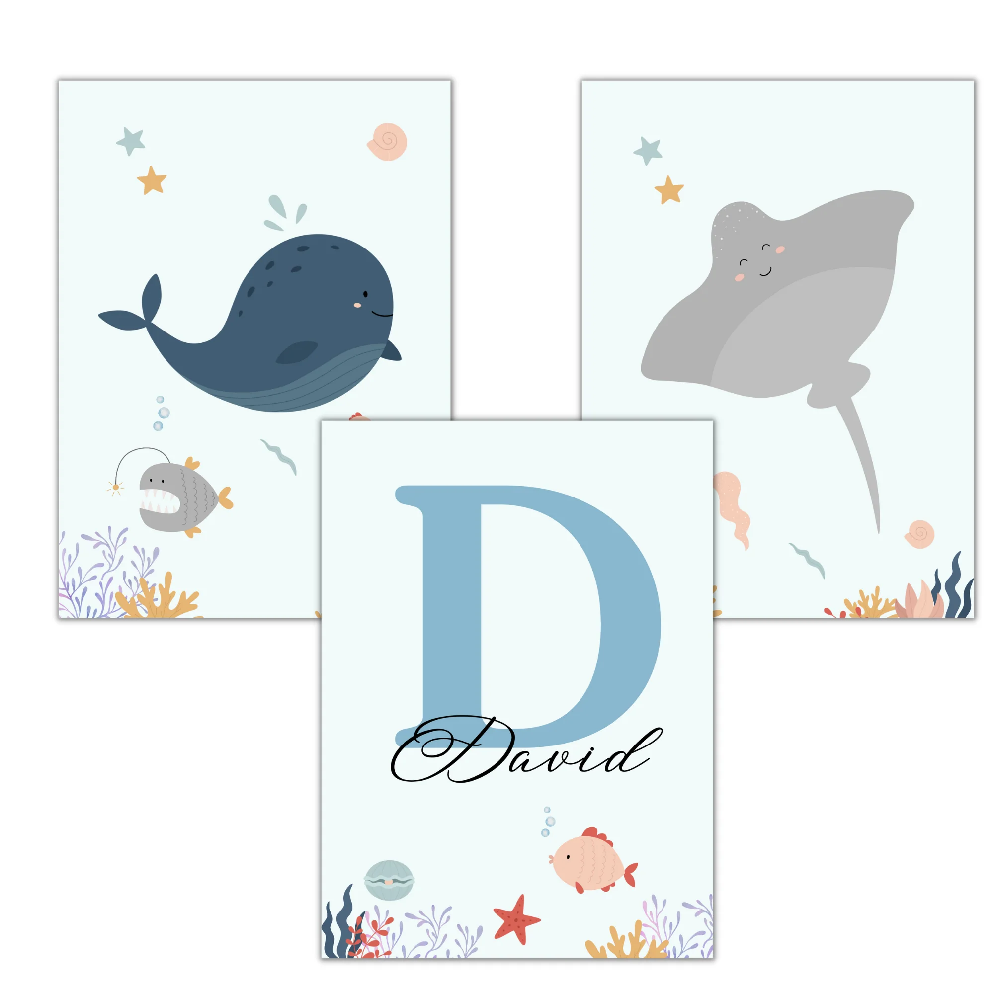 Offrez une ambiance marine à la chambre de votre bébé ou enfant, avec ce magnifique trio d’affiches sous l’océan personnalisé avec le prénom de votre enfant! Vous trouverez sur les affiches d’adorables animaux marins comme la baleine et la raie, ainsi que des étoiles de mer et coquillages.
