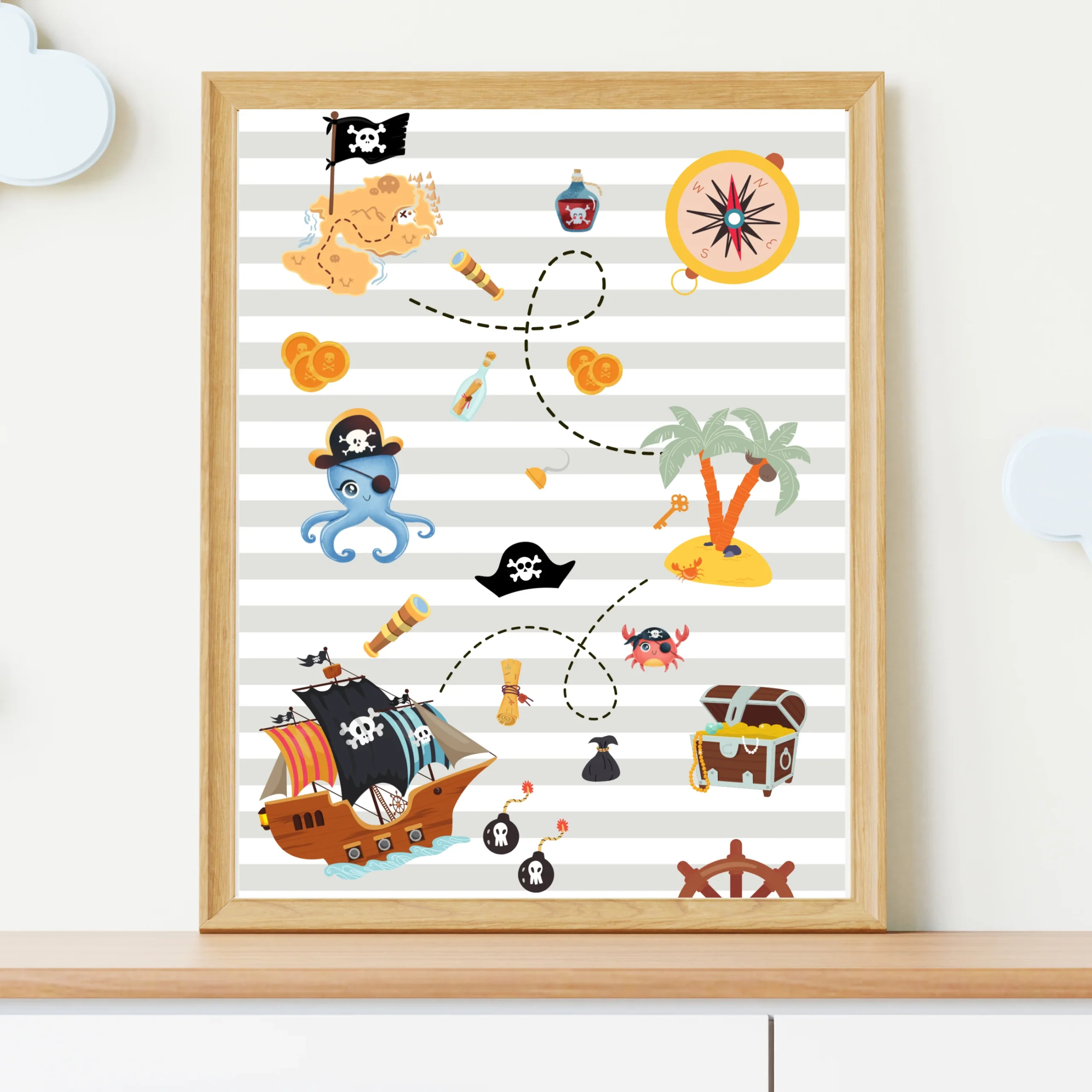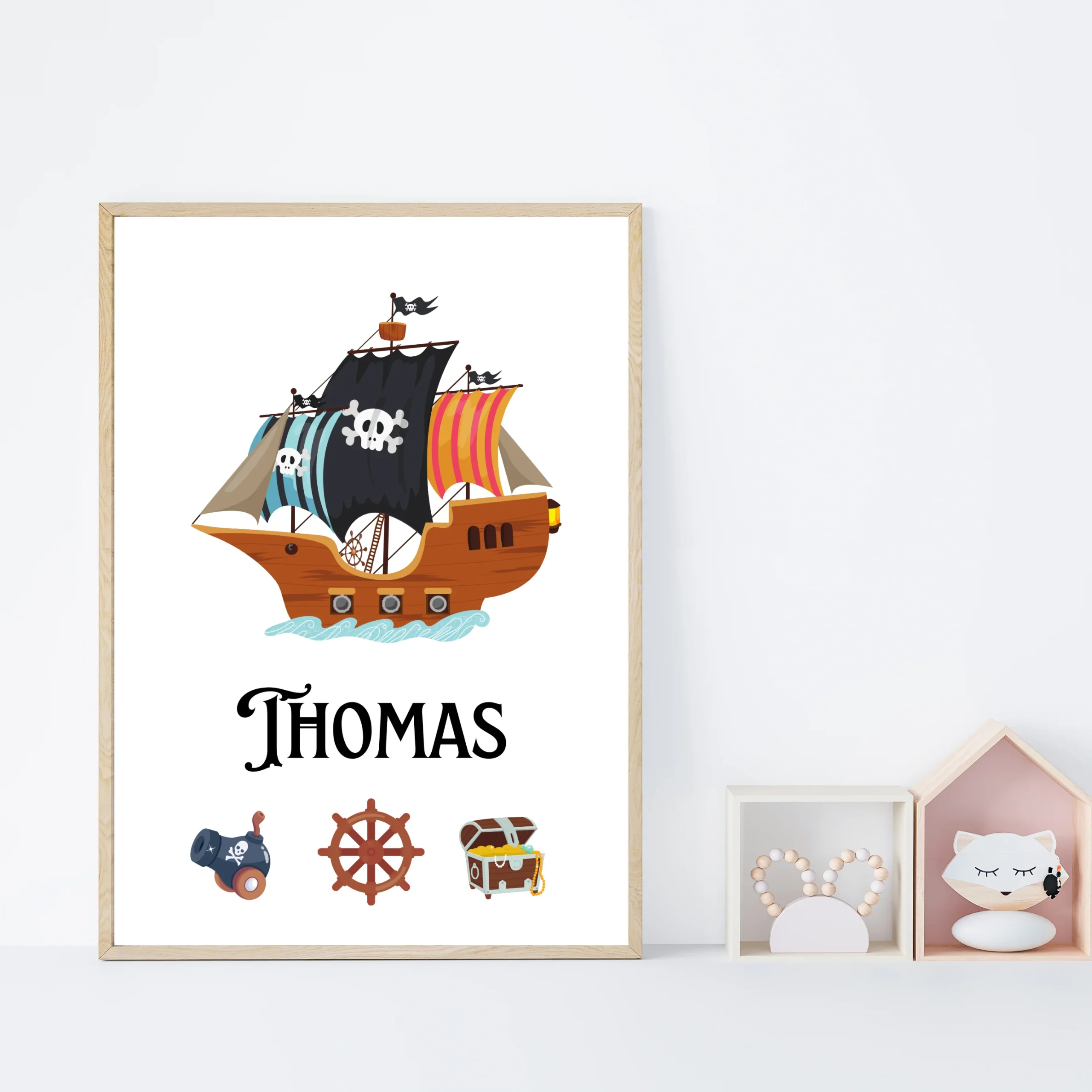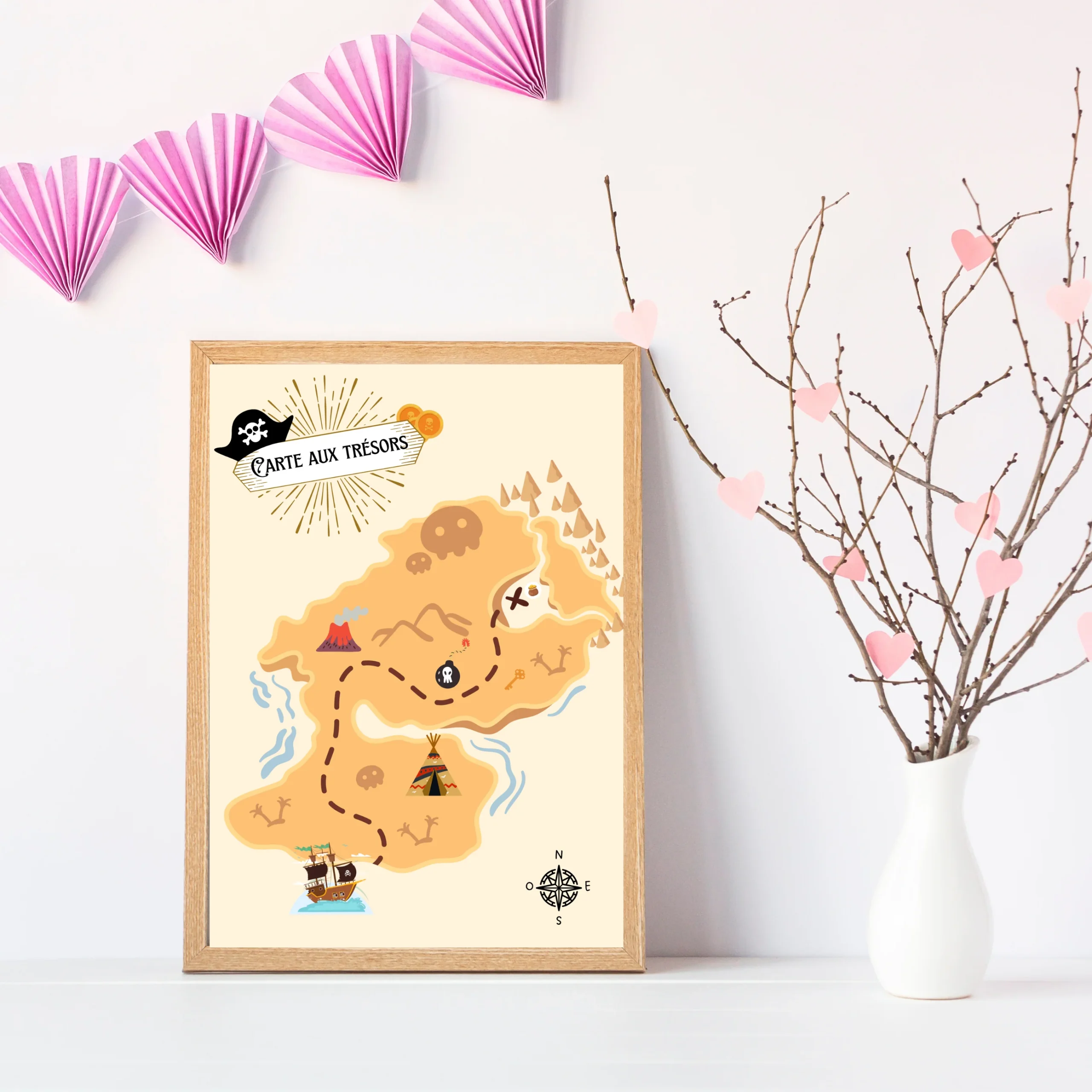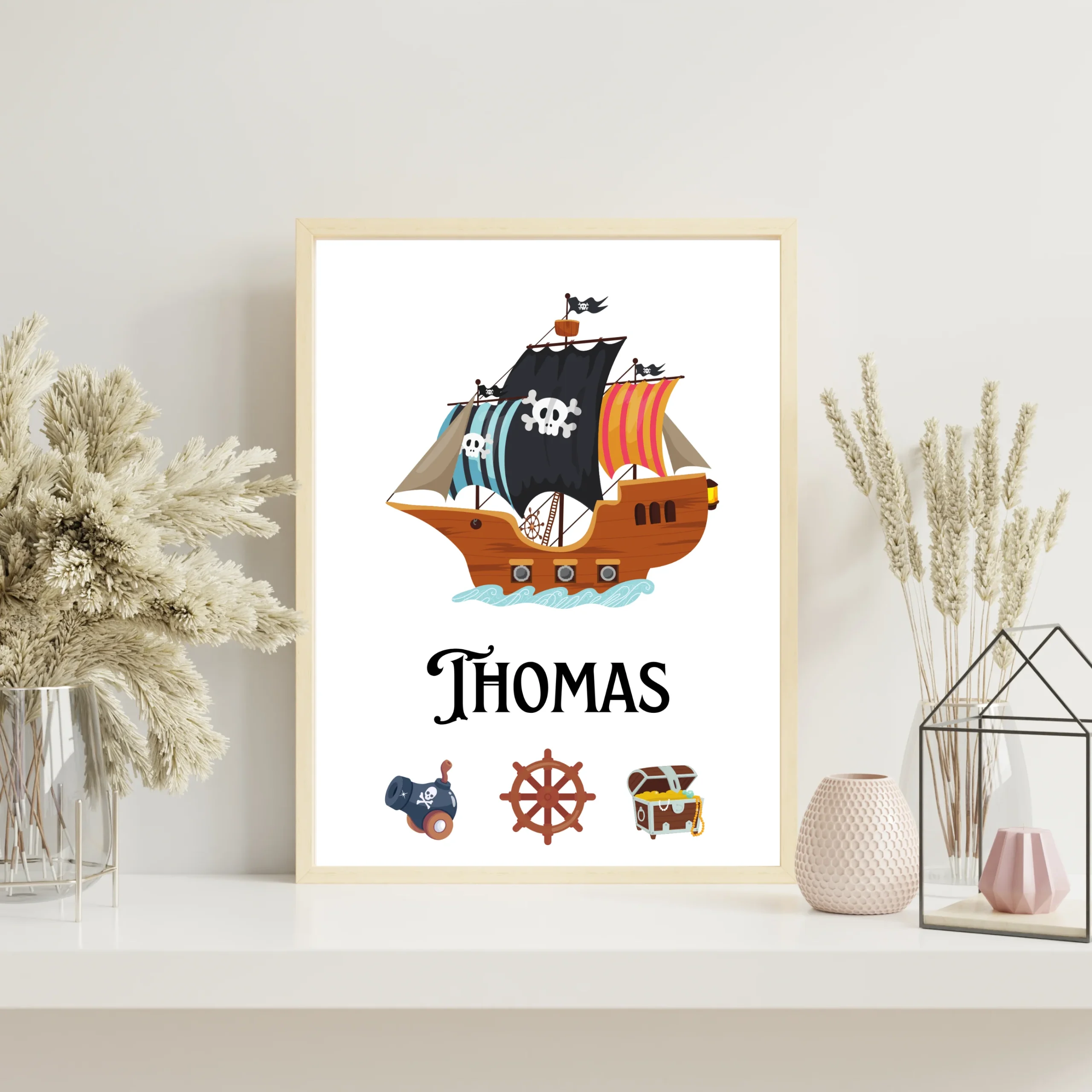 Sur la deuxième affiche, un fier bateau pirate navigue sur les flots, prêt à affronter toutes les tempêtes pour arriver à la recherche du trésor. Cette affiche sera personnalisée avec le prénom de l’enfant, pour qu’il se sente le capitaine de son propre navire.