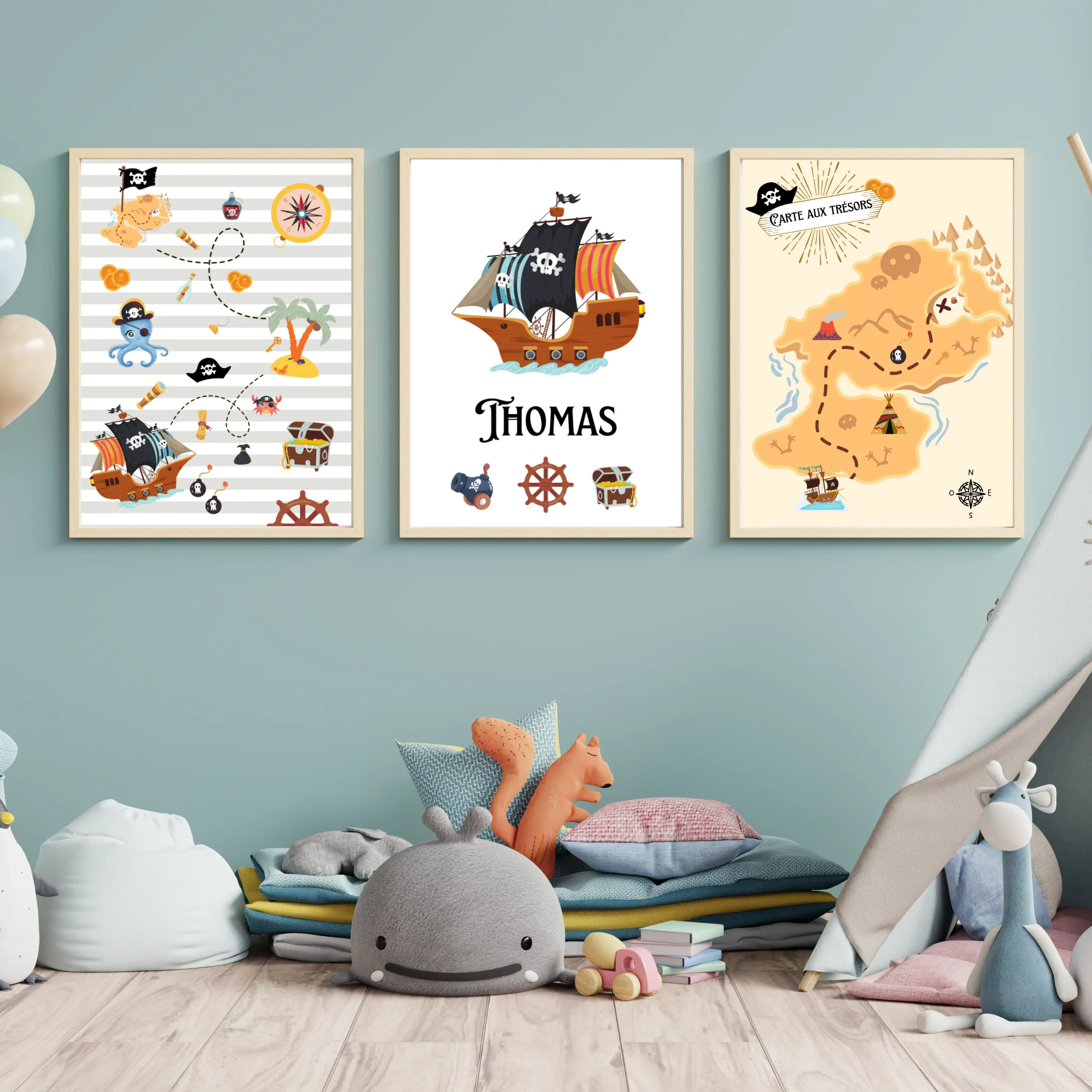 Affiches pirate enfant – trio pirate carte aux trésors prénom – Décoration pirate chambre de bébé par Le Temps des Paillettes
