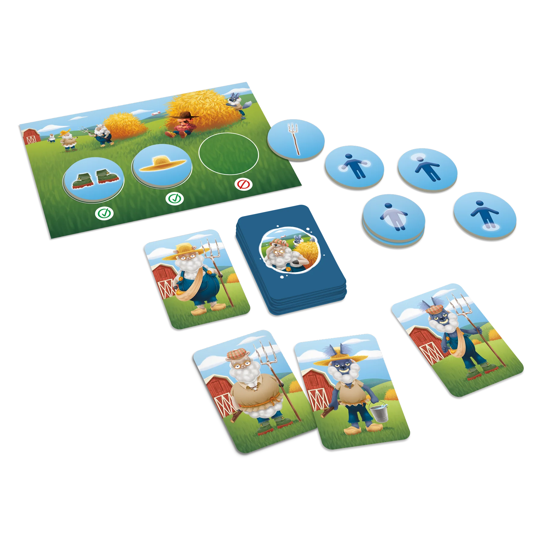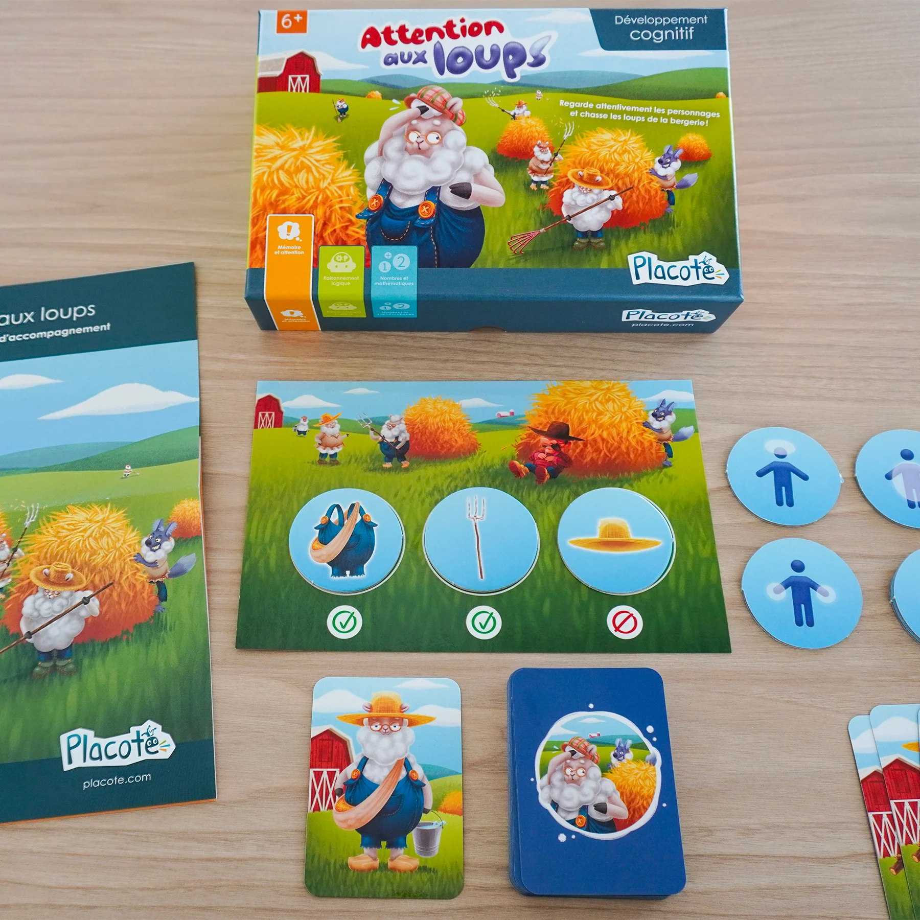 Attention aux loups contient des cartes représentant des loups et des moutons. Chaque personnage porte soit un chapeau ou une casquette, une salopette ou une tunique, des bottes ou des sabots, et tient un seau ou une fourche. Il existe trois façons de jouer. Dans la première, les cartes formant une pile sont retournées une à la fois et les joueurs doivent déterminer le plus vite possible si le personnage illustré a un ou deux items préalablement ciblés et pas un autre. Dans la deuxième, les cartes sont étalées sur la table et les joueurs doivent trouver le plus rapidement possible les cartes des personnages qui ont un ou deux items donnés, mais pas un autre. Dans la troisième façon de jouer, les cartes représentant des moutons sont étalées sur la table et les cartes illustrant des loups sont placées en pile et retournées une à une. Les joueurs doivent trouver sur la table la carte du mouton présentant exactement les mêmes items que la carte du loup retournée.