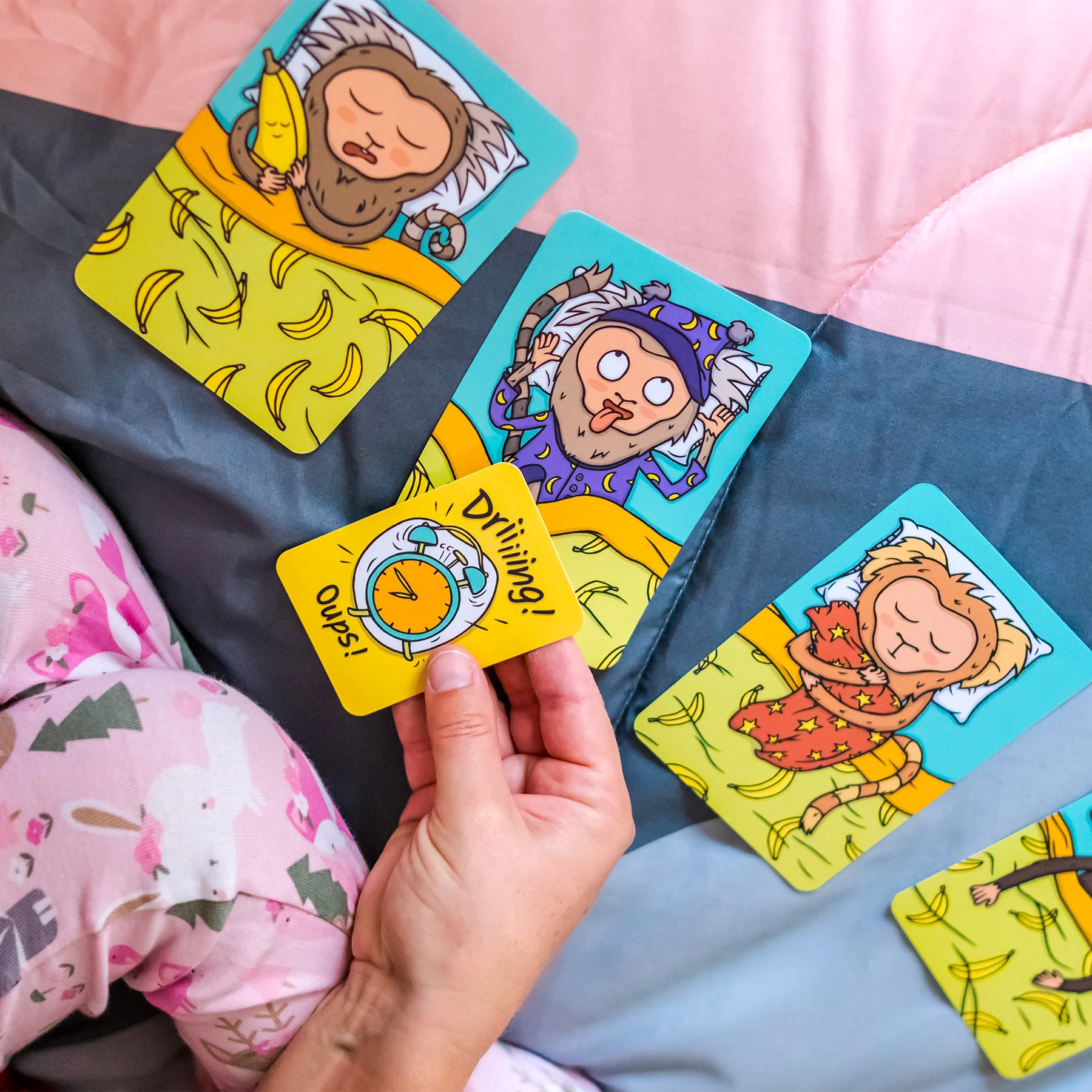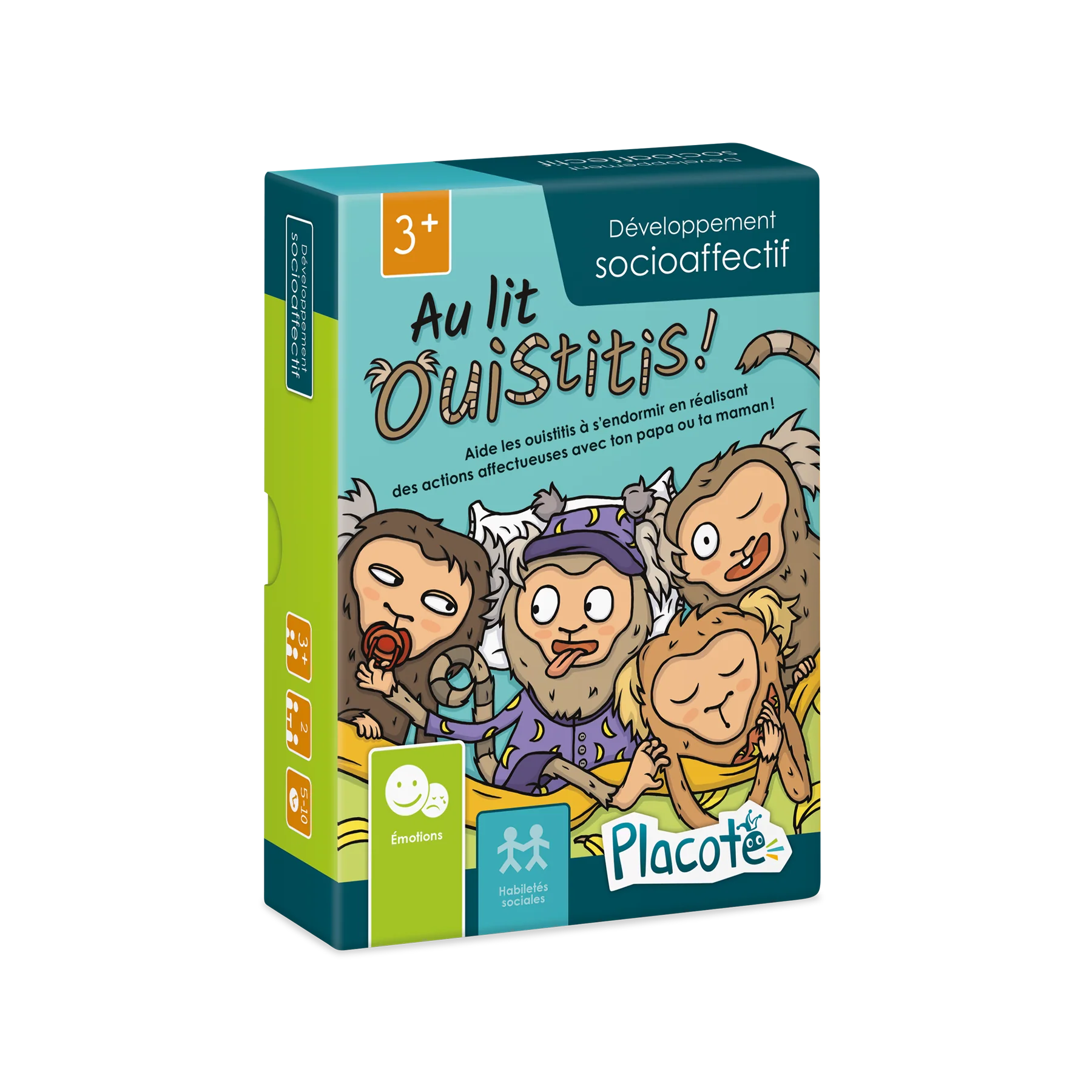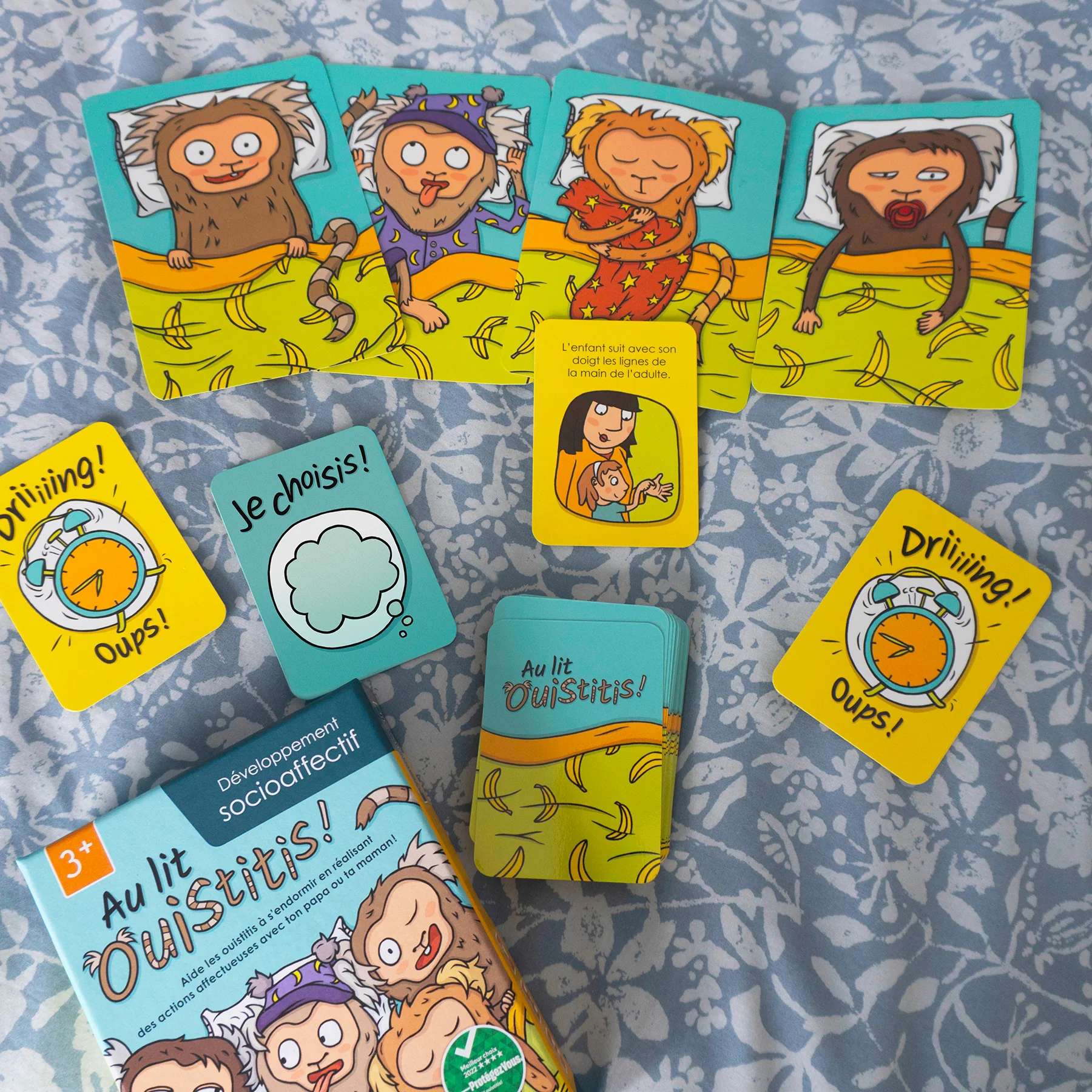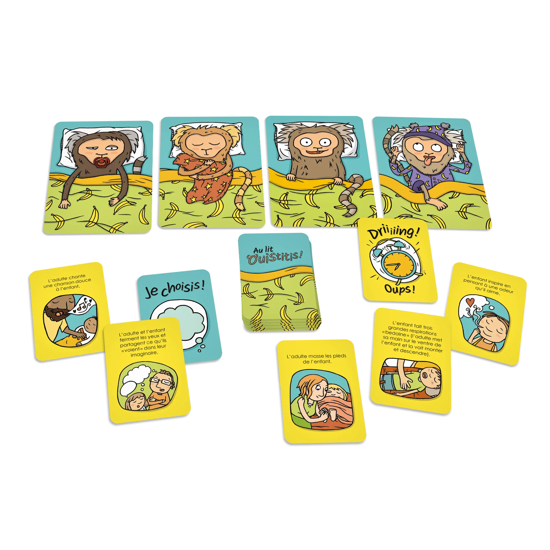 Le jeu comprend 51 cartes, dont 4 grandes cartes-ouistitis, 30 cartes-actions et 15 cartes « Oups! ». Chaque action permet d’endormir un ouistiti alors que chaque carte « Oups! » a pour effet de réveiller un ouistiti. Chaque joueur a également en sa possession une carte « Je choisis! », qui lui permet de modifier n’importe quelle action avec laquelle il n’est pas à l’aise (p. ex., un bisou ou un câlin). Le jeu permet ainsi à l’enfant et au parent de passer des moments de qualité ensemble tout en s’amusant.
