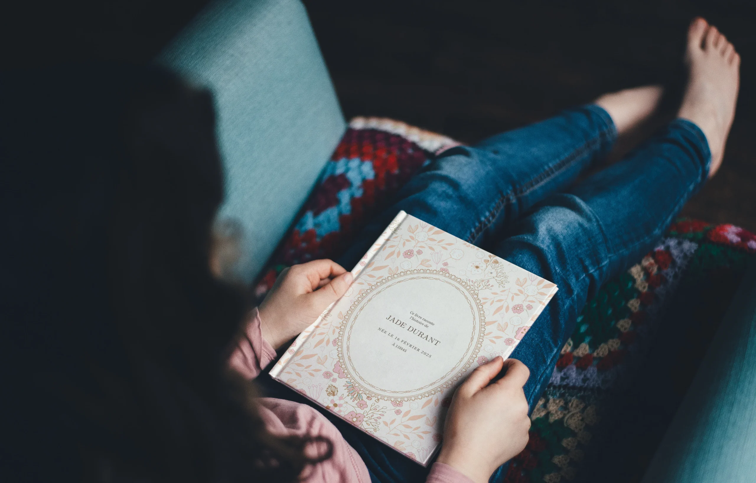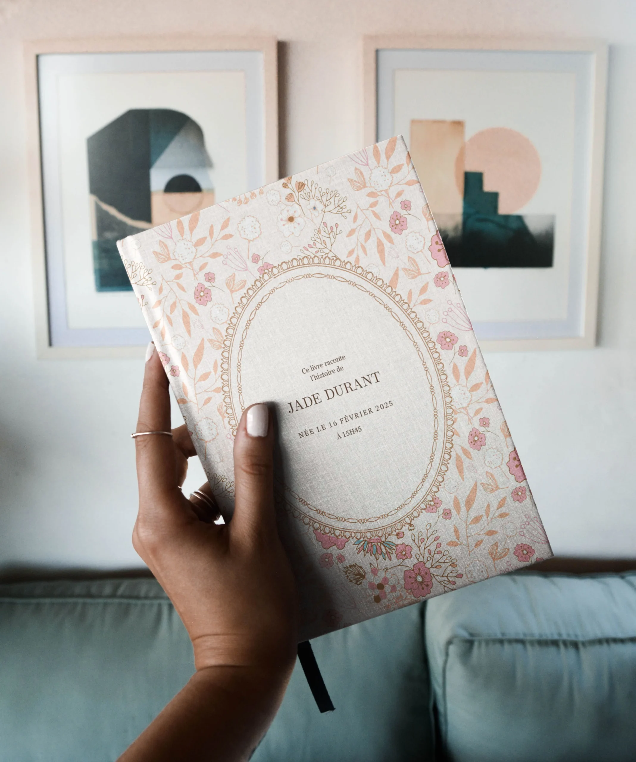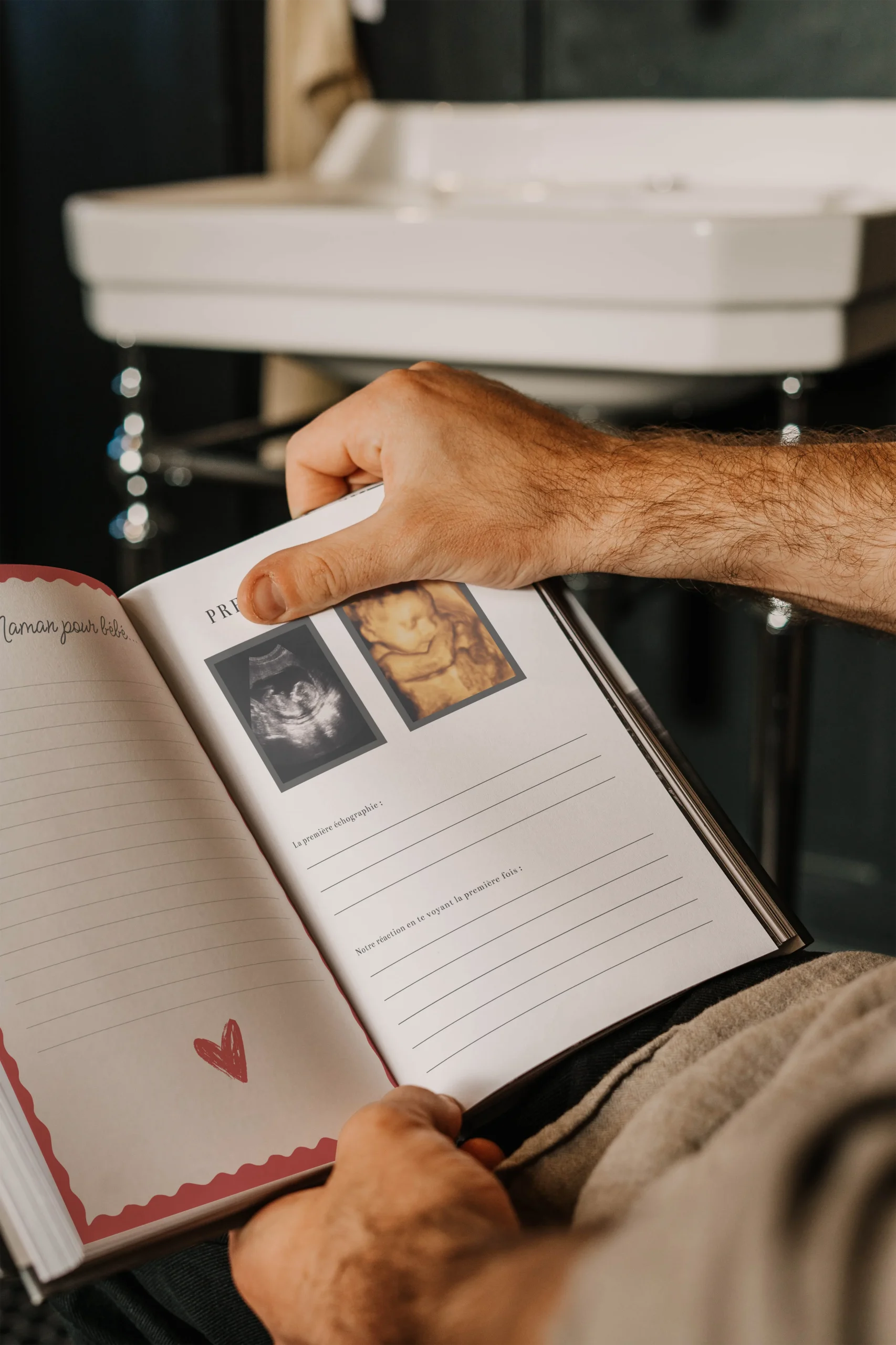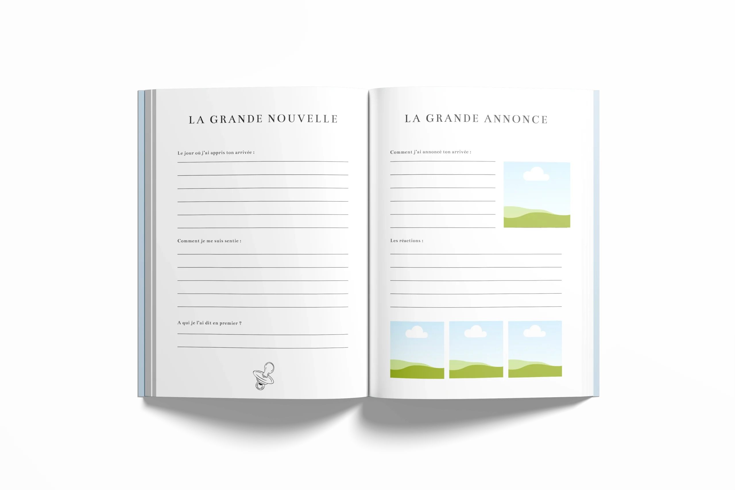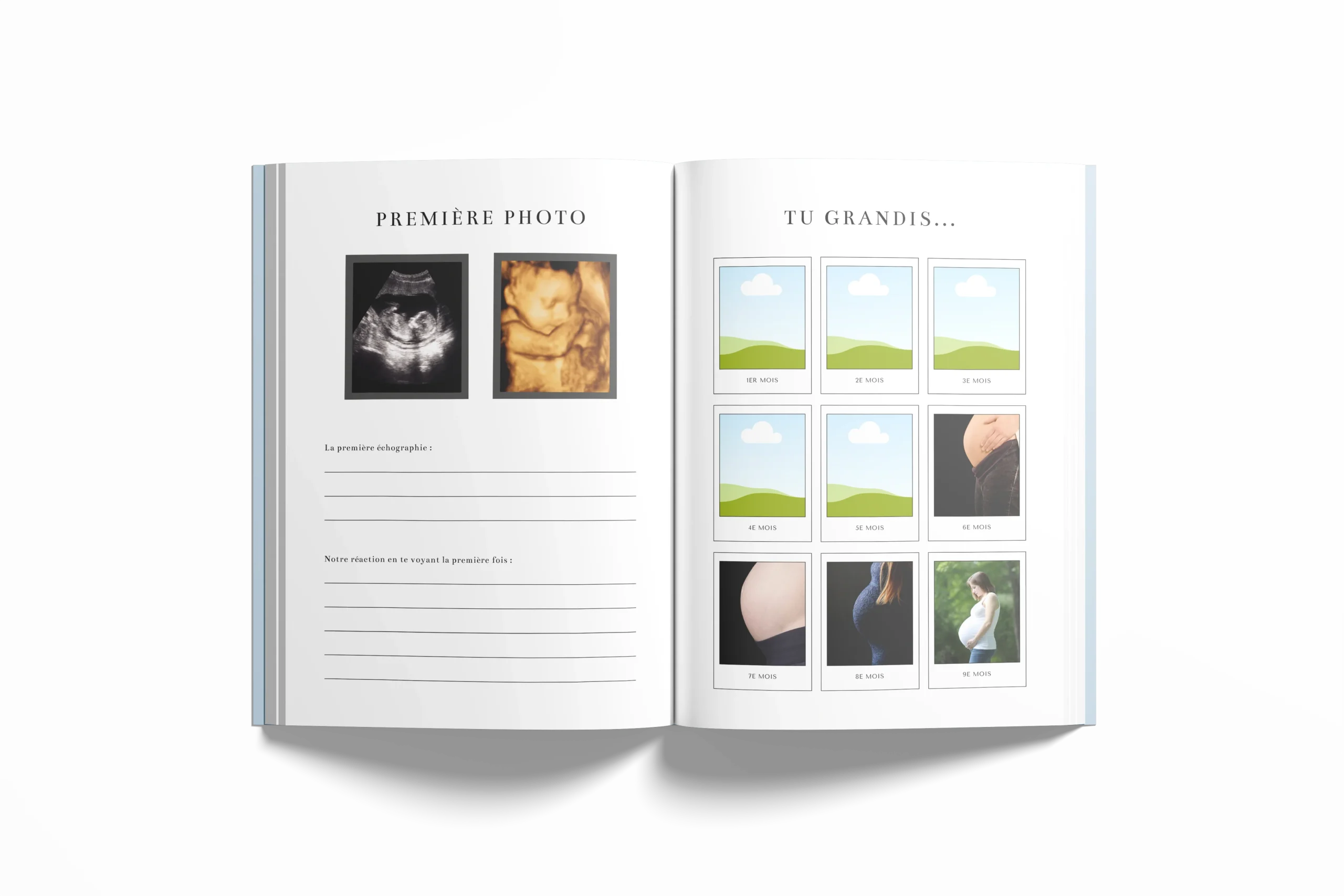 - 59 pages soigneusement conçues couvrant chaque étape de la grossesse et première année de bébé : photos de grossesse, récit de naissance, échographies, parrain et marraine, anniversaire, Noël…