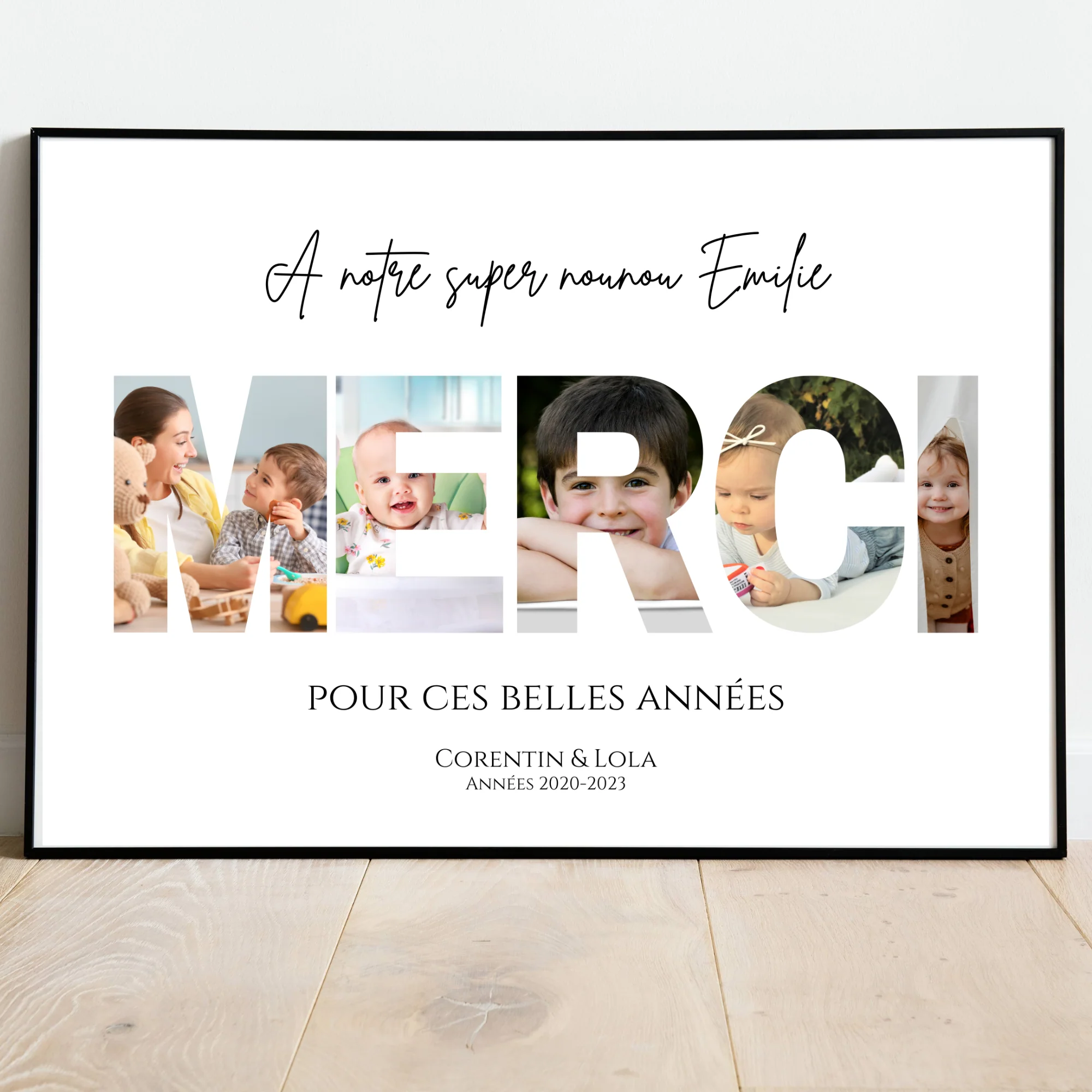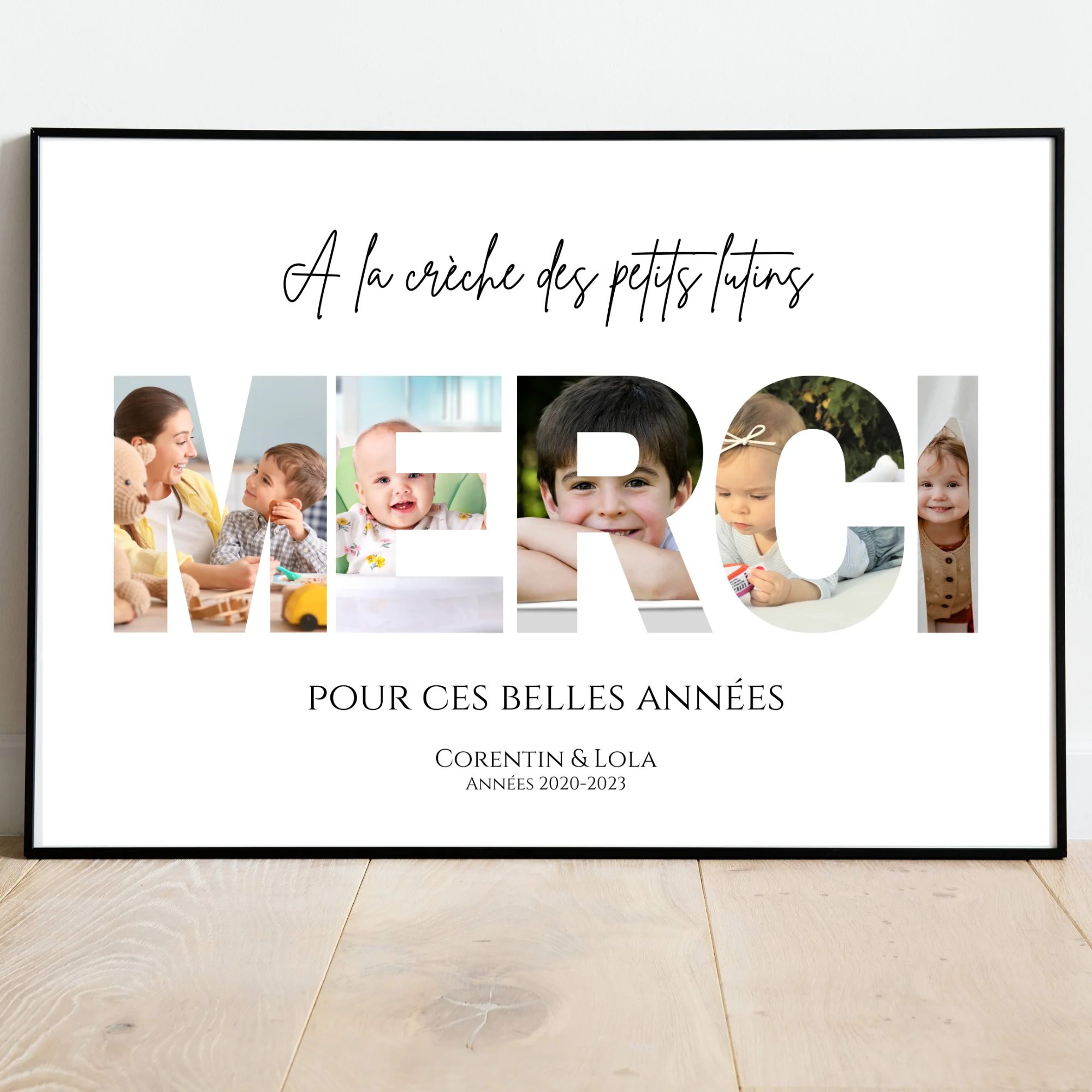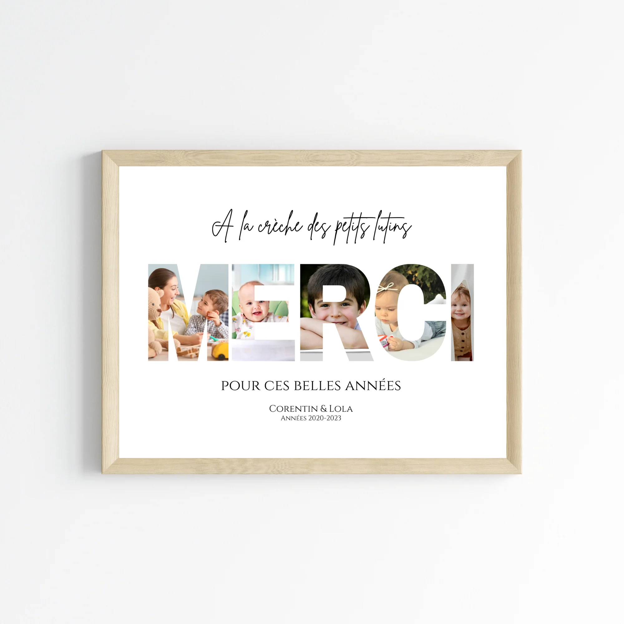 🎨 Chaque lettre du mot MERCI est créée avec une incrustation des photos des enfants, formant un souvenir émouvant et original. Ajoutez le nom de la crèche, le prénom de la nounou et des enfants pour une personnalisation complète.