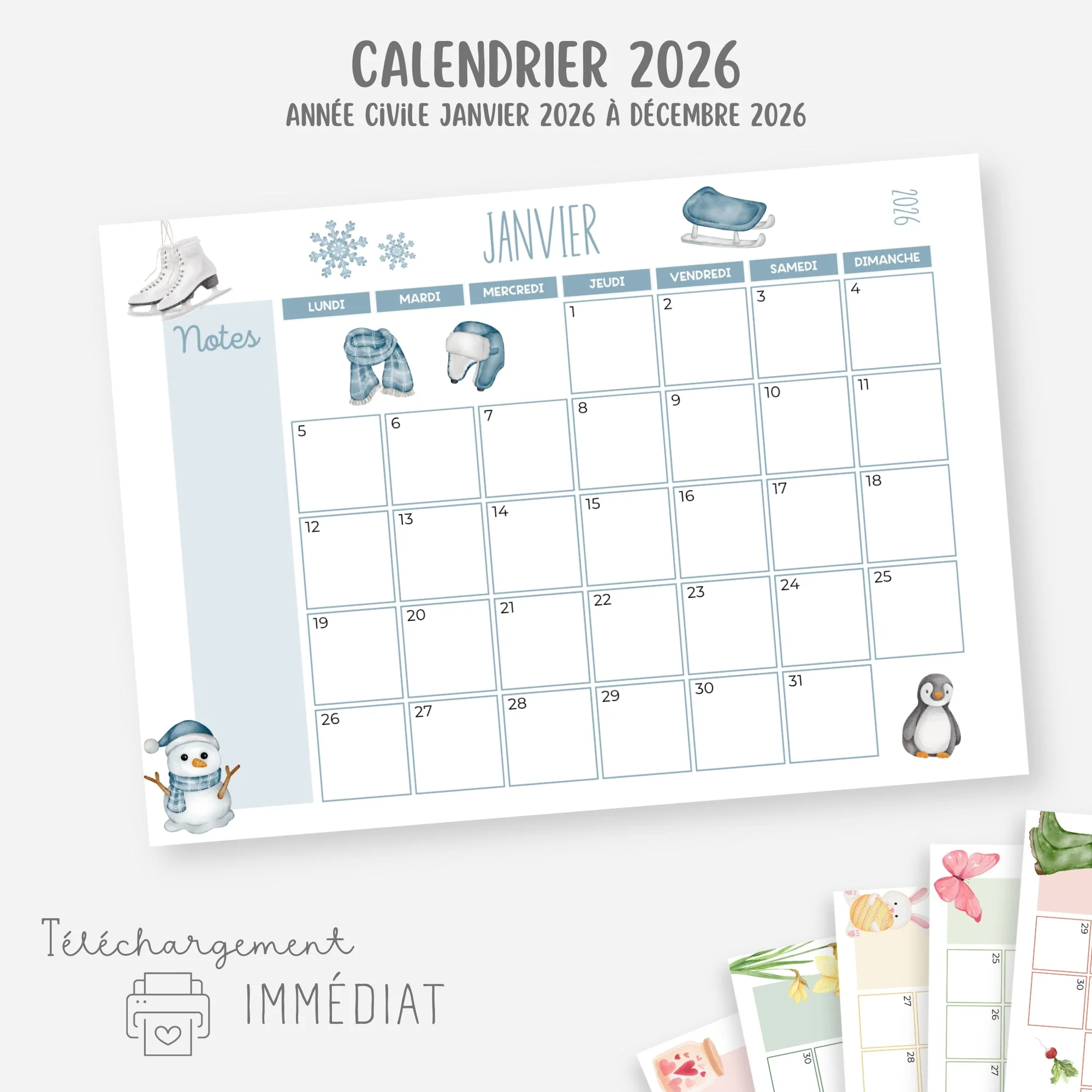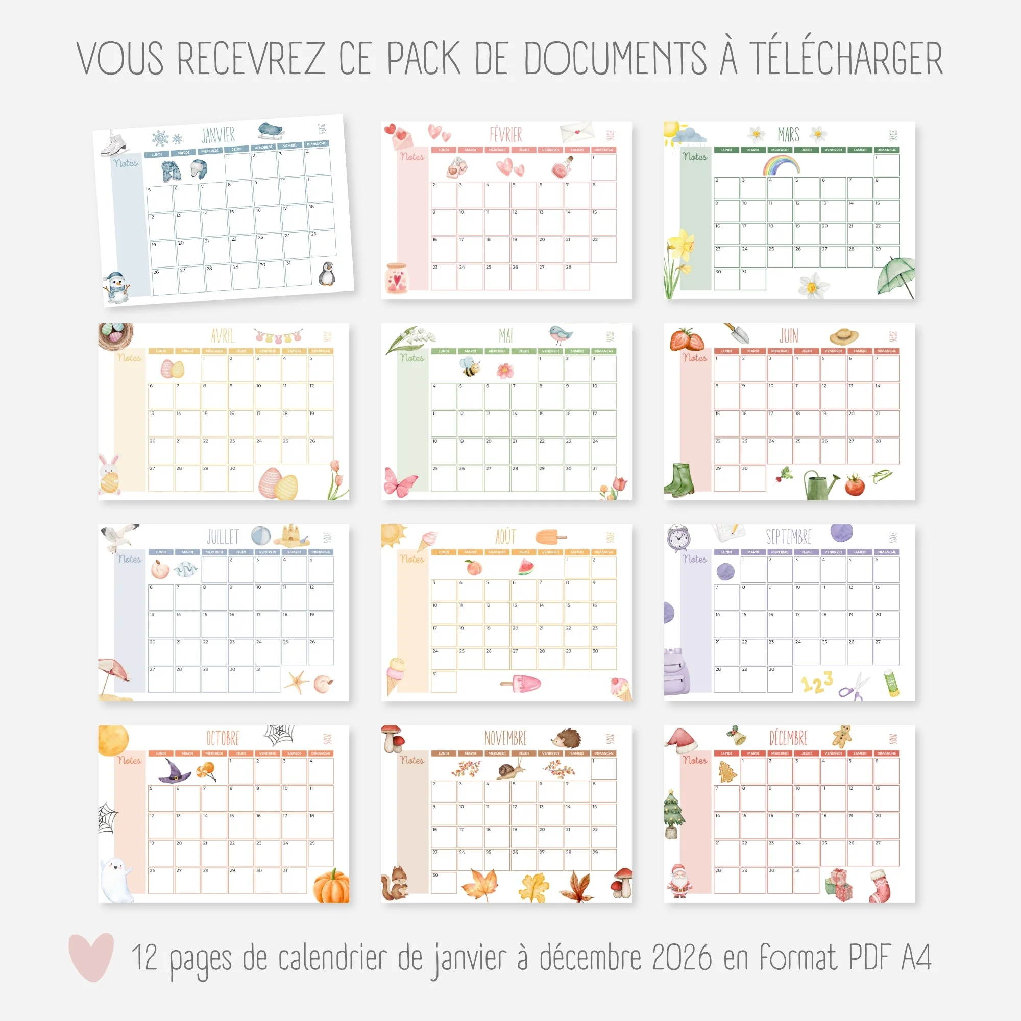 Ce calendrier imprimable de l’année civile 2026 destiné à la fois aux enfants et aux parents vous aidera à organiser votre emploi du temps familial efficacement.Avec ses pages mensuelles illustrées au rythme des saisons et ses grandes cases à remplir, ce planning sera un allié pour toute la famille !