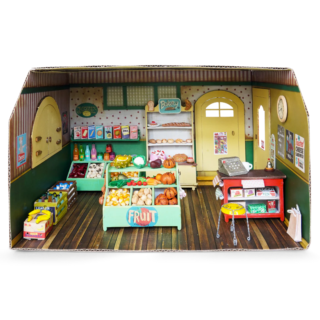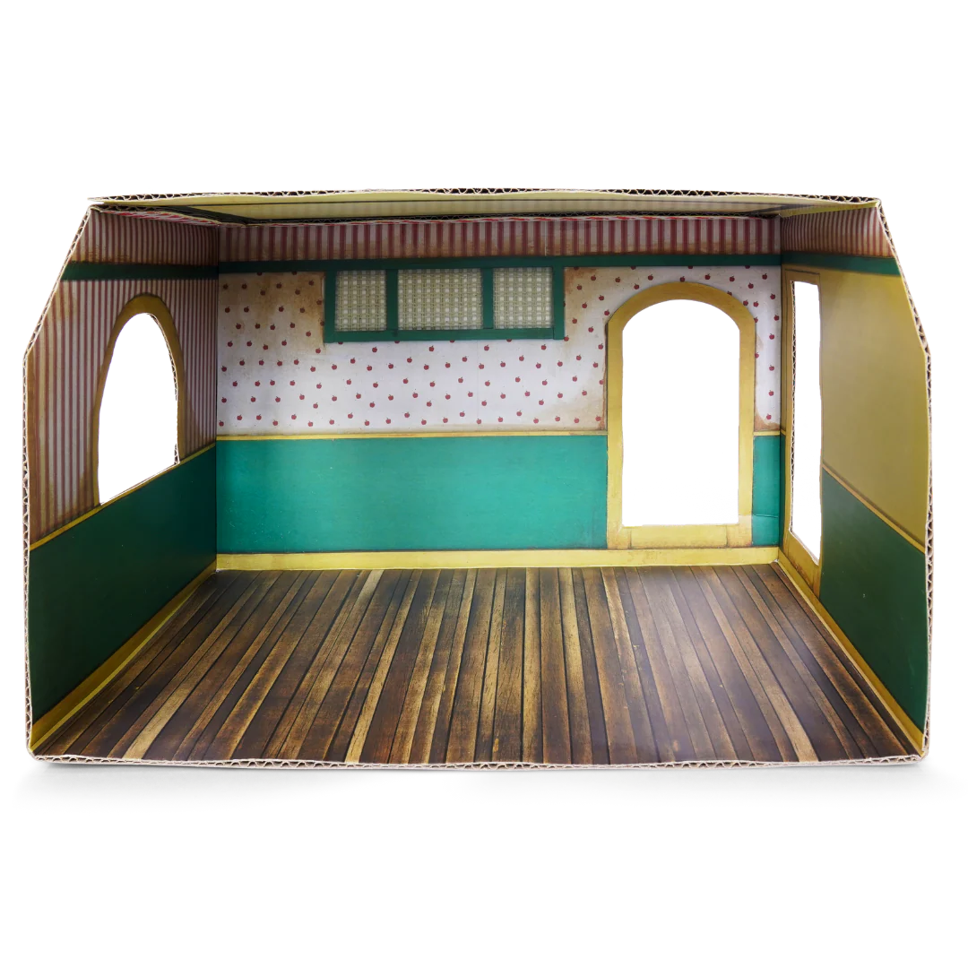 This lovely miniature room is made of cardboard and printed on all sides with the characteristic wallpapers and floors of The Mouse Mansion. The box is easy to assemble thanks to the handy flaps with double-sided tape.