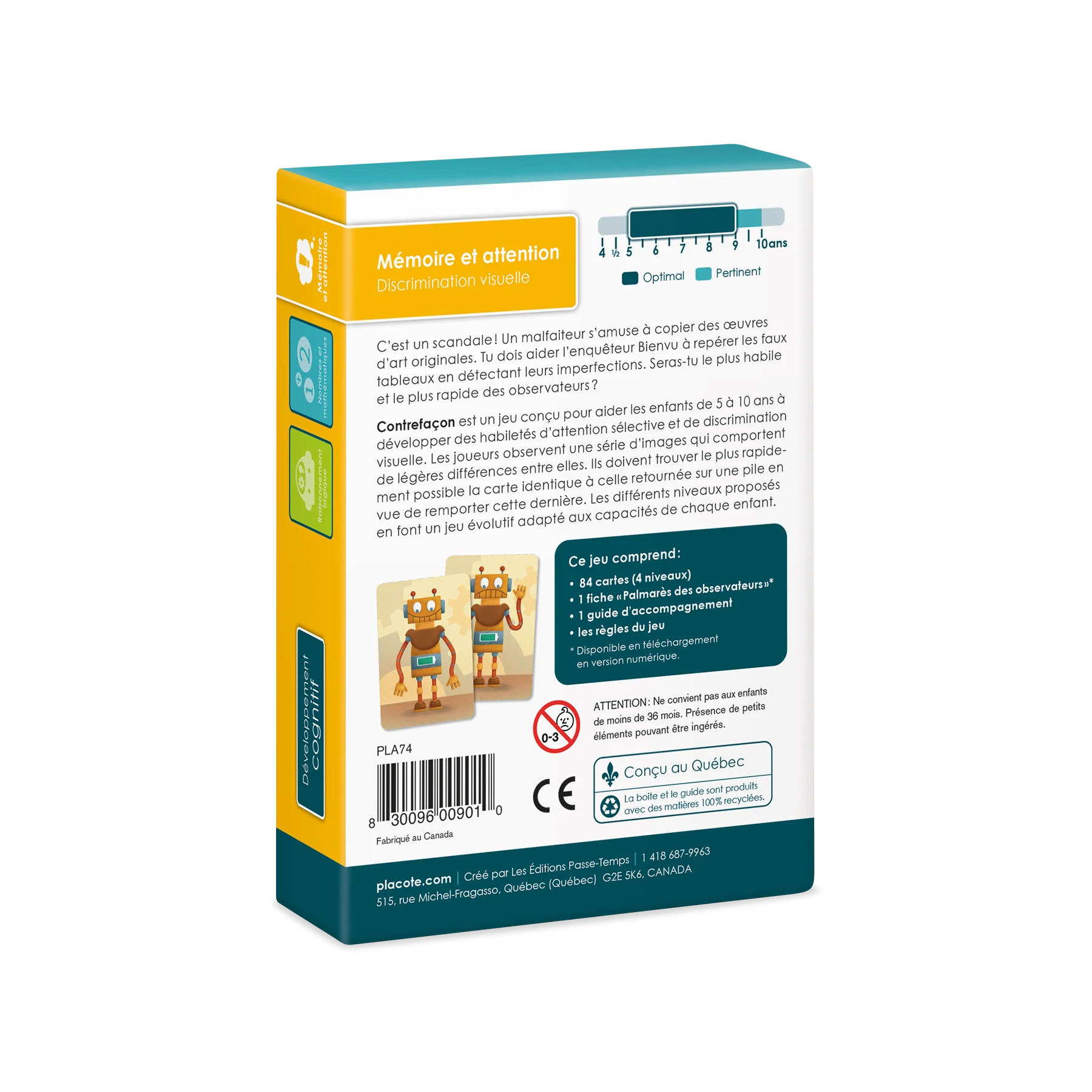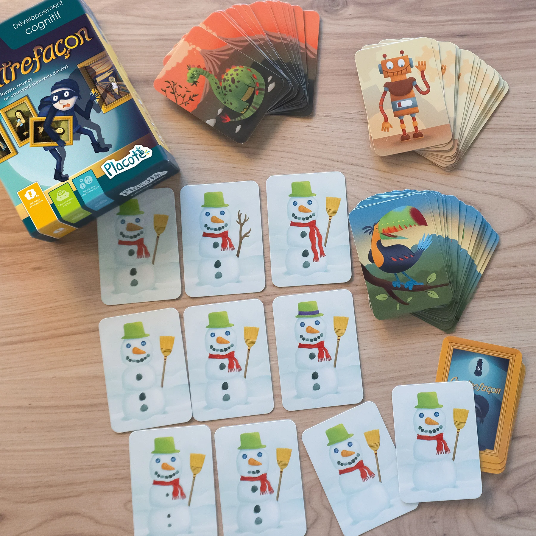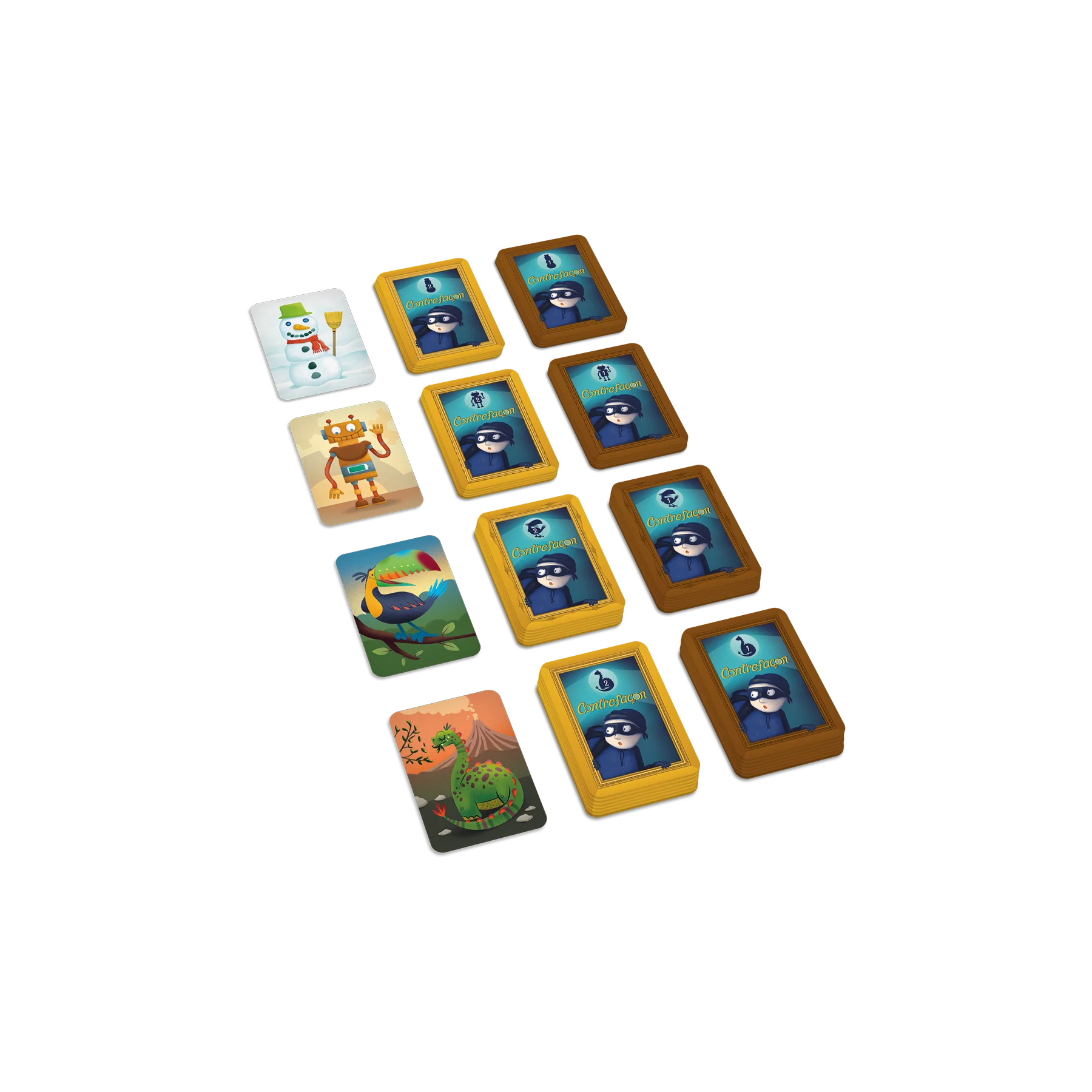 Contrefaçon est un jeu conçu pour aider les enfants de 5 à 10 ans à développer des habiletés d’attention sélective et de discrimination visuelle. Les joueurs observent une série d’images qui comportent de légères différences entre elles. Ils doivent trouver le plus rapidement possible la carte identique à celle retournée sur une pile en vue de remporter cette dernière. Les différents niveaux proposés en font un jeu évolutif adapté aux capacités de chaque enfant.