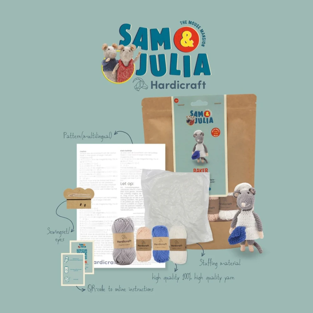 Crochet your very own Mouse Mansion mouse! This kit contains a pattern, quality blended yarn and all the materials needed to get to work (excl. crochet hook) on the Baker. The Baker is approximately 12 cm tall and is made with a UK 12 crochet hook. The Baker is exactly the right size to fit your self made Mouse Mansion.