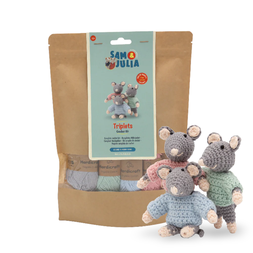 Crochet your very own Mouse Mansion Triplets! This kit contains a pattern, quality blended yarn and all the materials needed to get to work (excl. crochet hook). The Triplets are approximately 9 cm tall and made with a UK 12 crochet hook. These three little mice are exactly the right size to fit your self made Mouse Mansion.