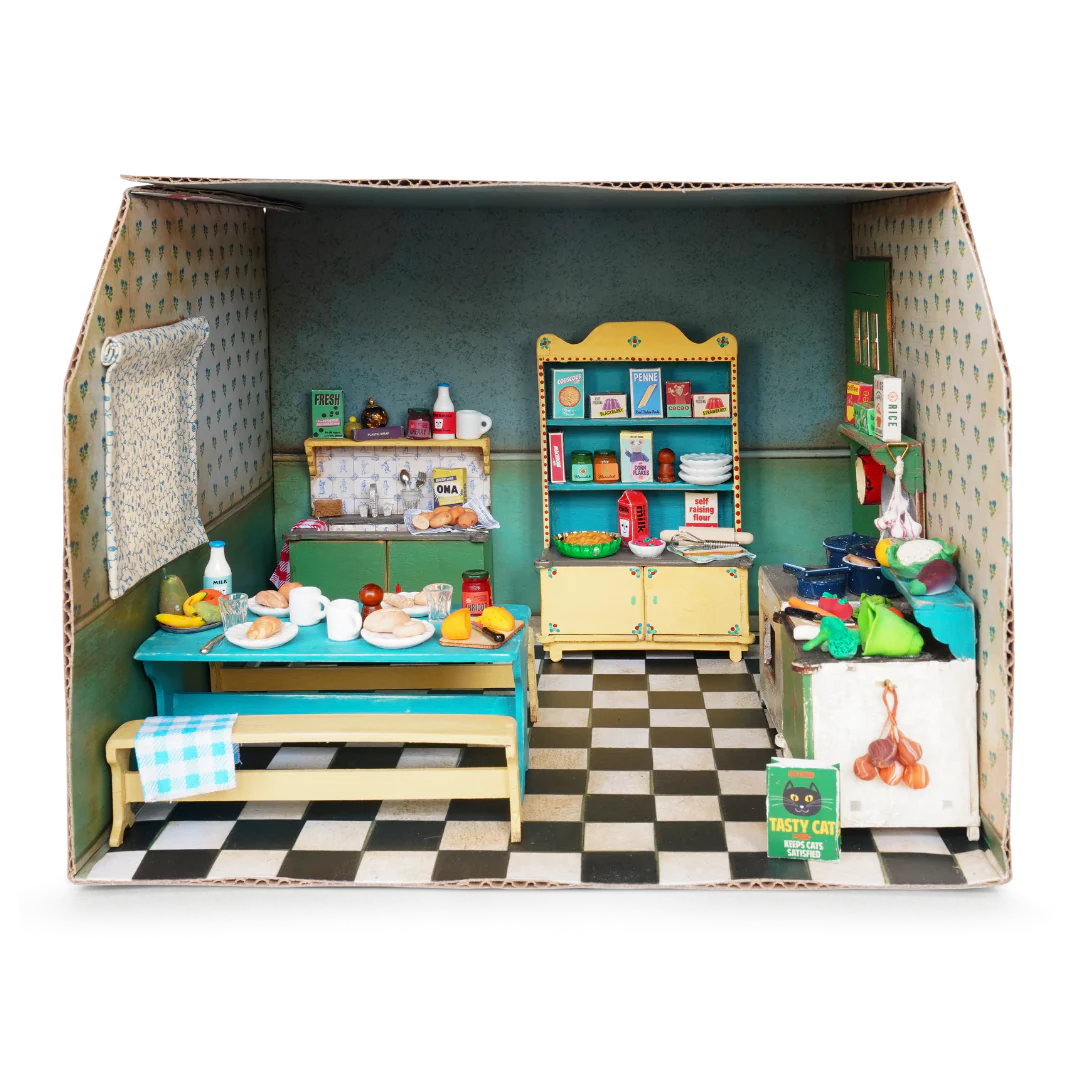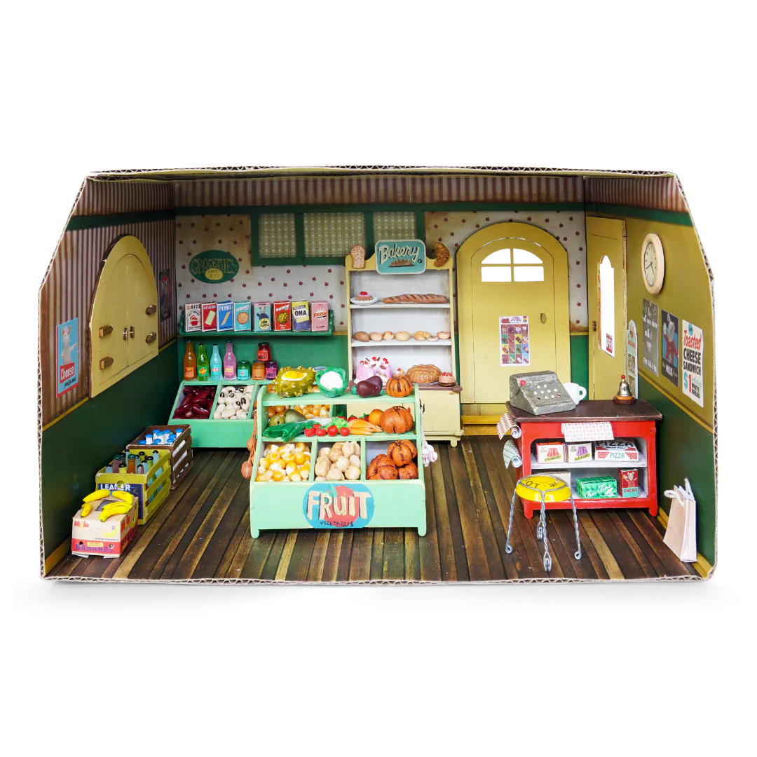 – Cardboard Rooms: living room, kitchen, bathroom, kids’ bedroom, shop and classroom