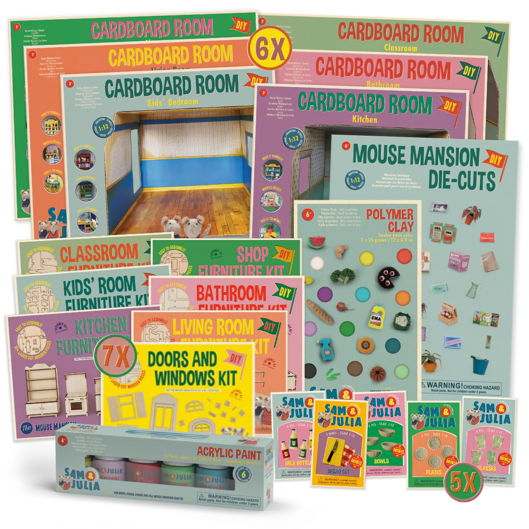 With this luxurious craft set, you have everything you need to create the Mouse Mansion of your dreams! First, assemble the 6 cardboard rooms, which is quick and easy, and stack as you like. Then, use the 7(!) furniture kits to create wooden miniature furniture, doors and windows. You can paint and decorate them as you like with the exclusive Mouse Mansion paint, clay and die-cut prints. Our Minis add that authentic touch.