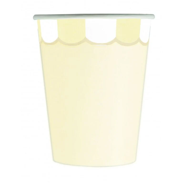 Lot de 8 Gobelets festonnés jaune pastel pour votre table d’anniversaire 8 jolis gobelets festonnés aux couleurs jaune pastel, à compléter avec des décorations et accessoires de fête assortie pour une super décoration de table d’anniversaire ! Ces gobelets en carton seront parfaits pour un goûter d’anniversaire enfant. -Capacité : 200 ml.