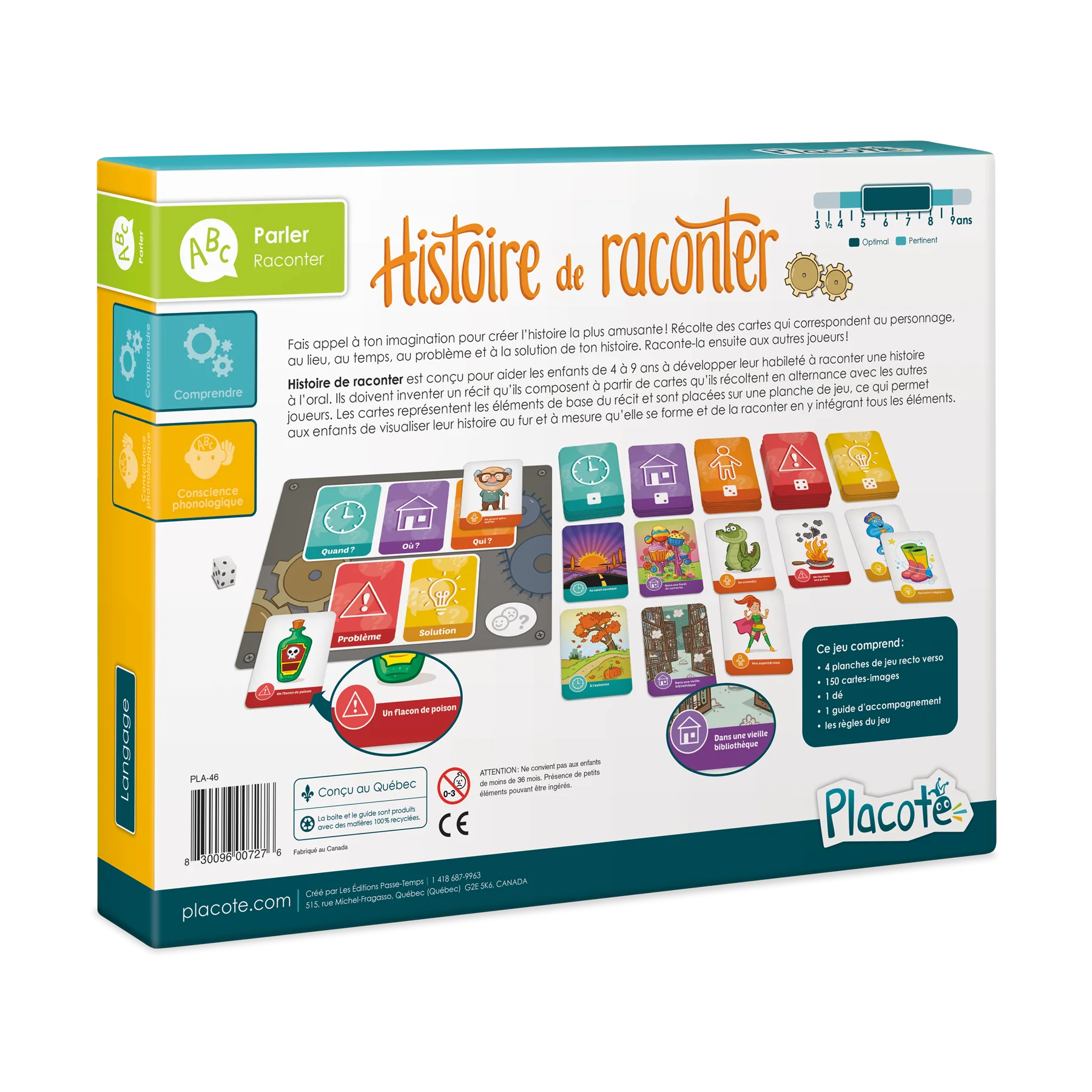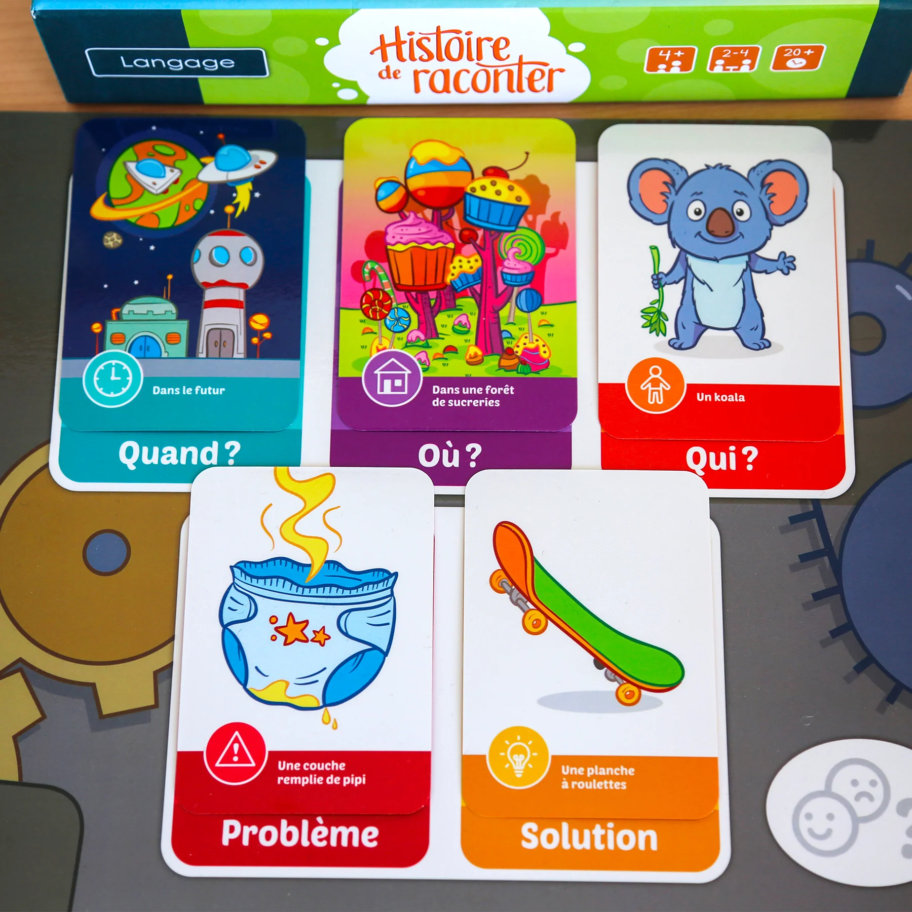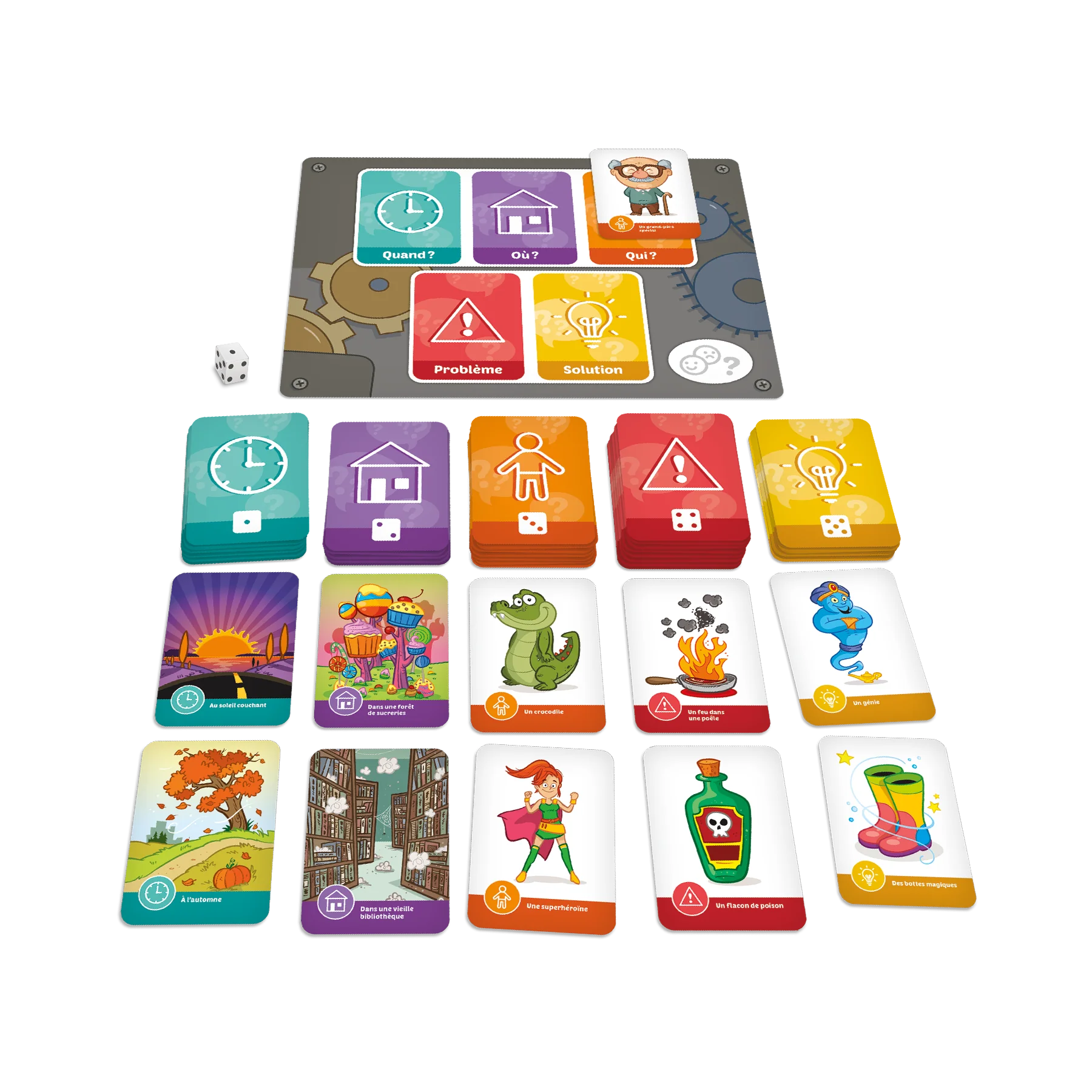 Conçu pour 2 à 4 joueurs, le jeu comprend 4 planches de jeu, 1 dé ainsi que 150 cartes-images réparties en 5 catégories : personnage, lieu, temps, problème et solution. Deux façons principales de jouer sont proposées en plus de plusieurs variantes, ce qui permet de renouveler l’expérience de jeu d’une partie à l’autre tout en s’ajustant au niveau d’habileté des enfants.