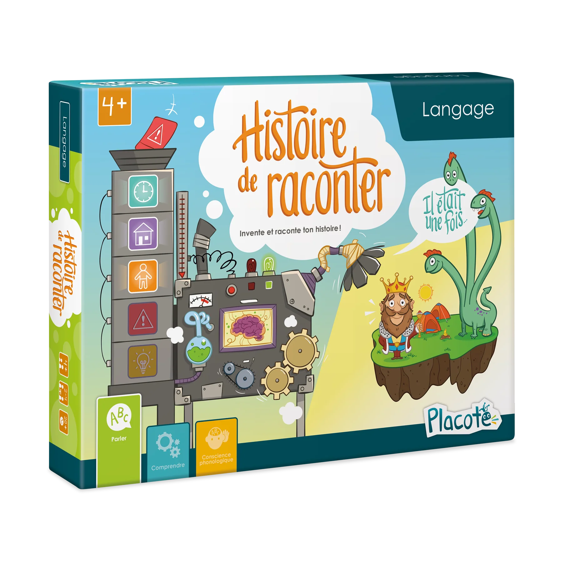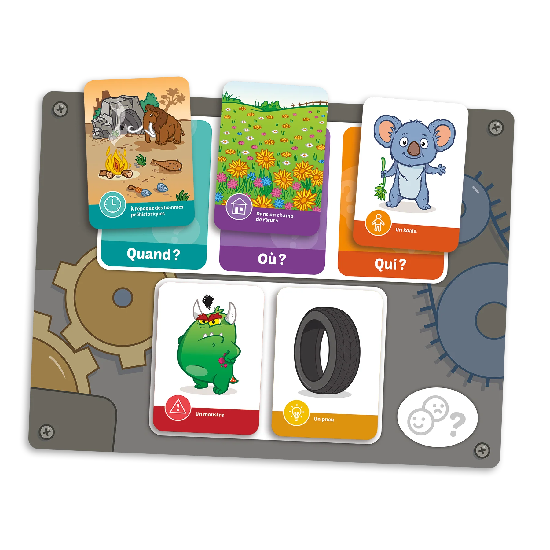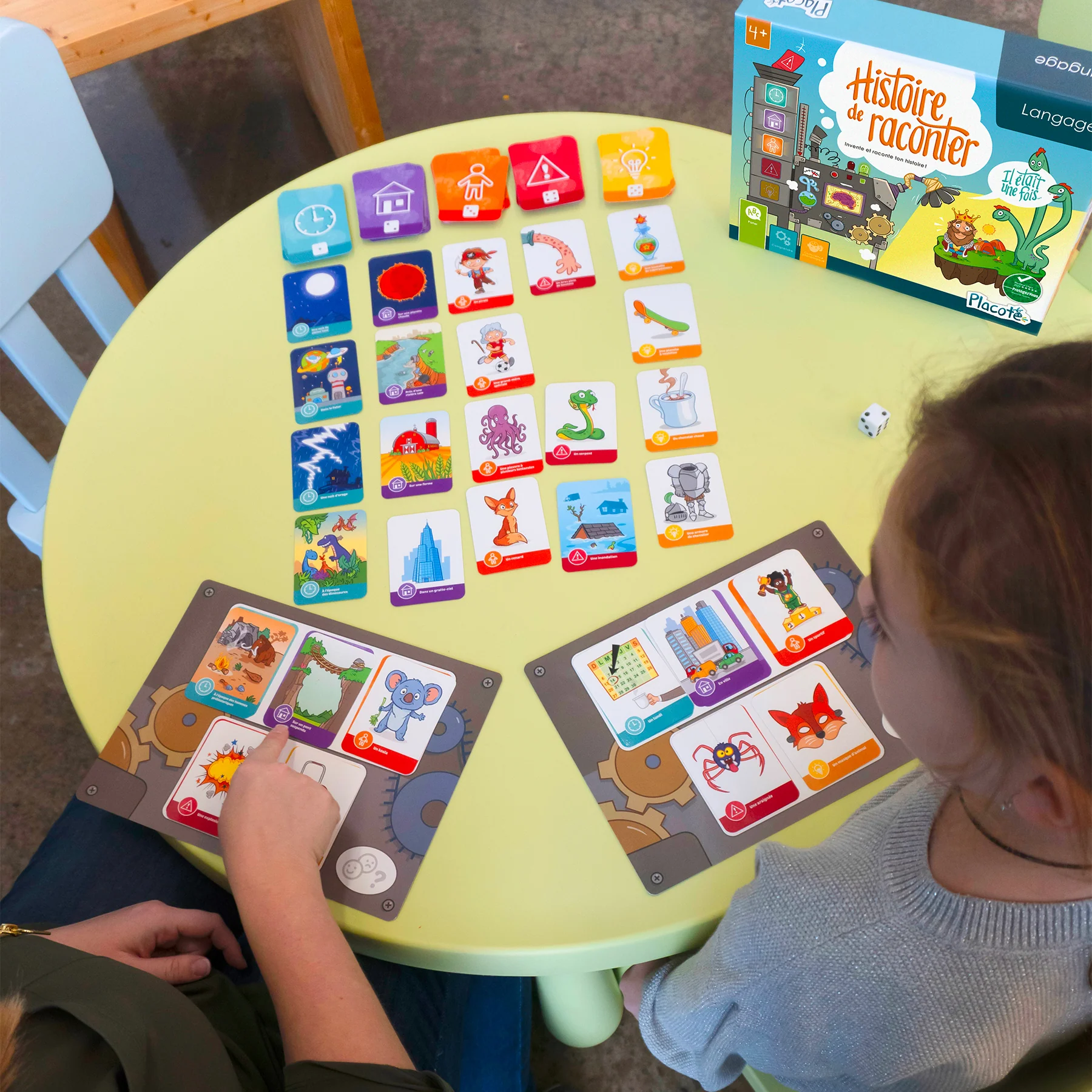 Conçu pour 2 à 4 joueurs, le jeu comprend 4 planches de jeu, 1 dé ainsi que 150 cartes-images réparties en 5 catégories : personnage, lieu, temps, problème et solution. Deux façons principales de jouer sont proposées en plus de plusieurs variantes, ce qui permet de renouveler l’expérience de jeu d’une partie à l’autre tout en s’ajustant au niveau d’habileté des enfants.